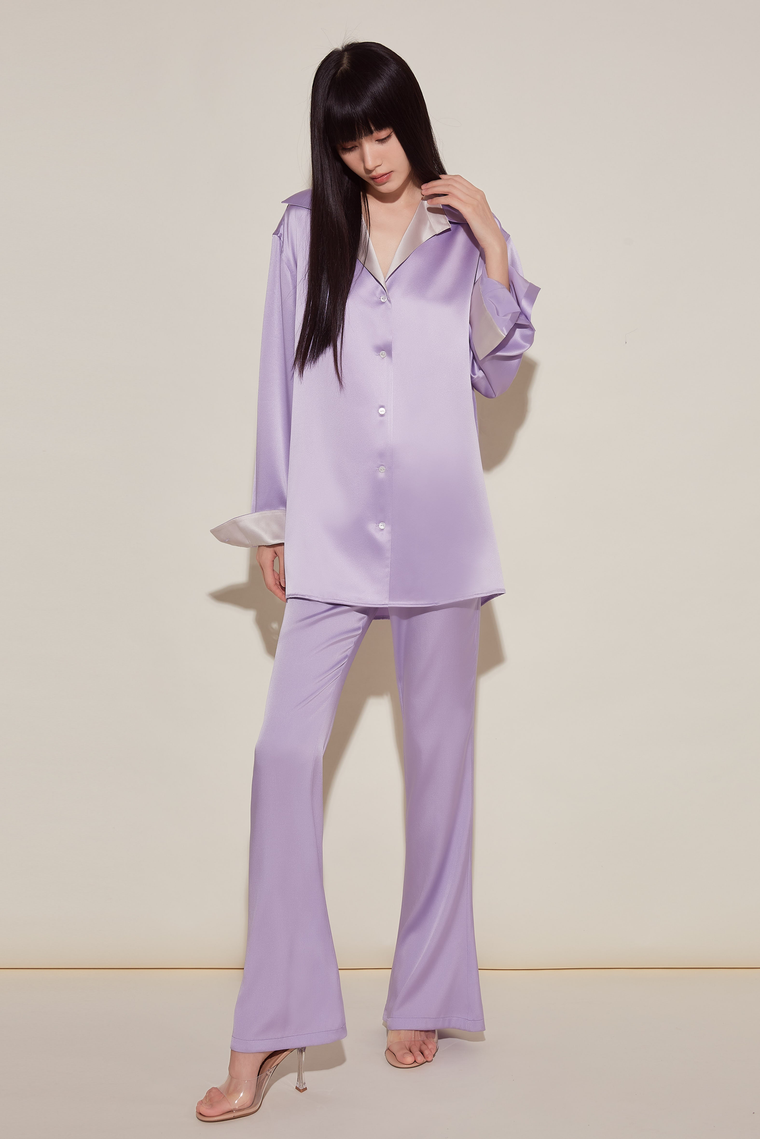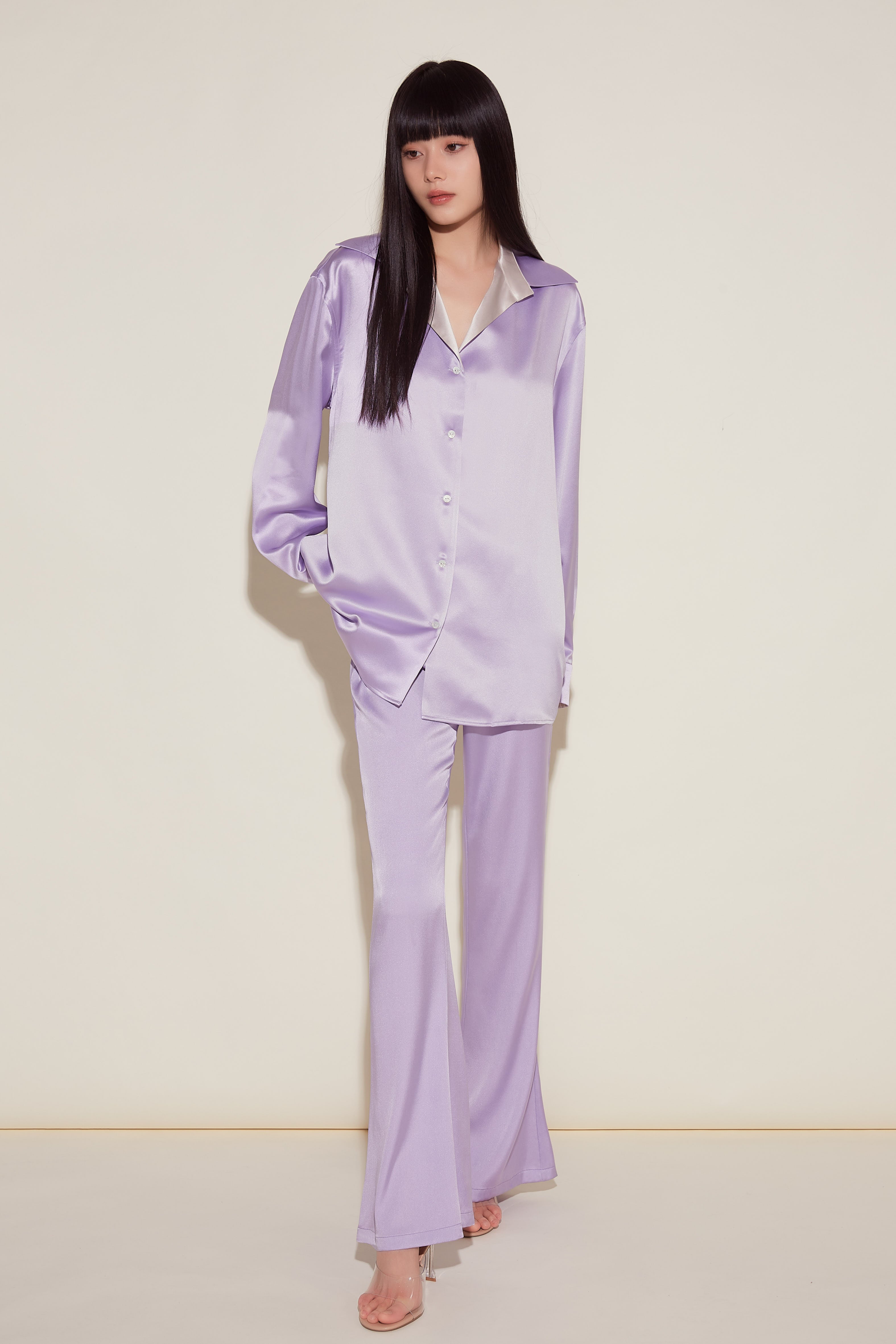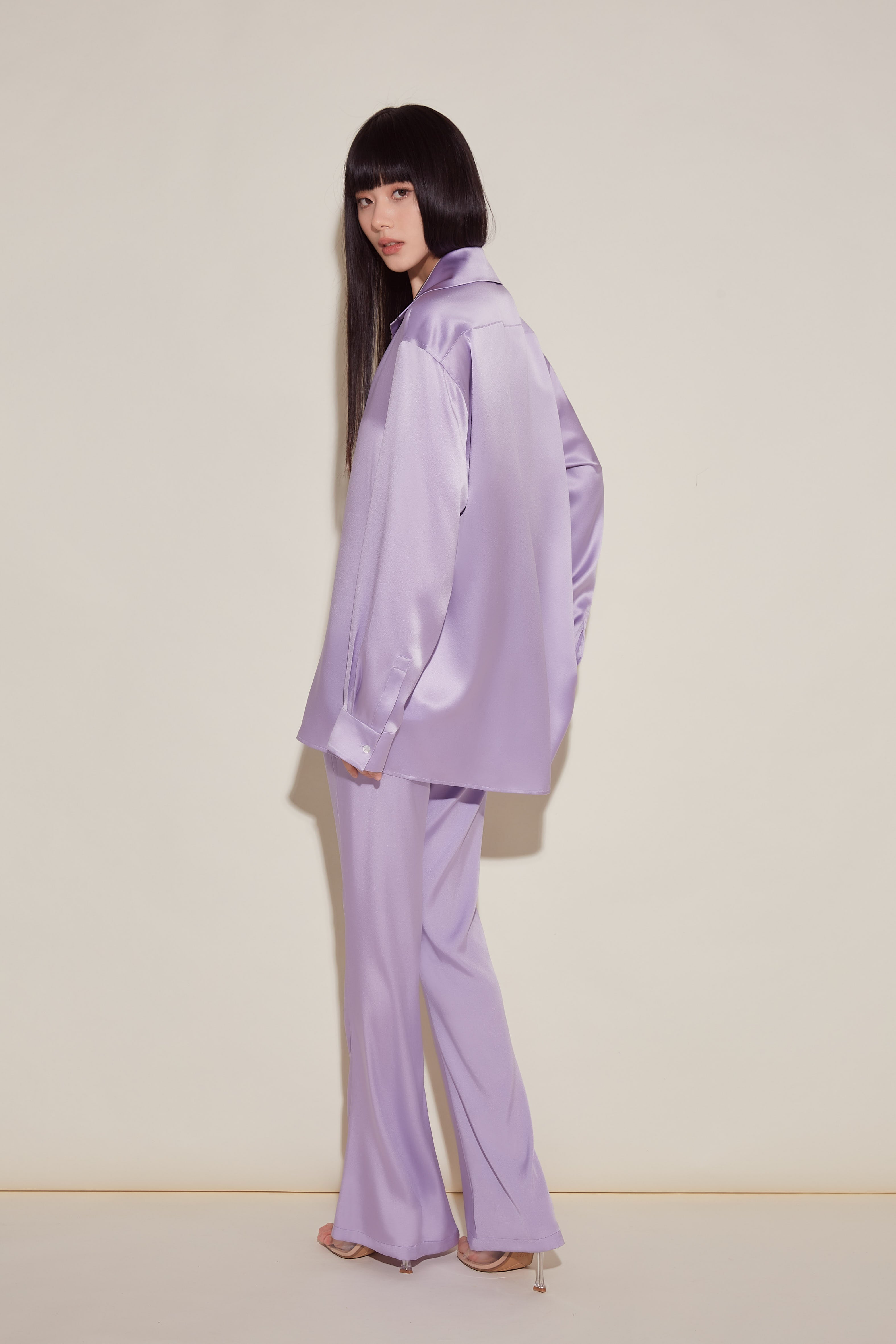 Live beautifully in bold silk shades. Crafted from 100% mulberry silk, featuring an oversized relaxed shirt and fitted flared pants.