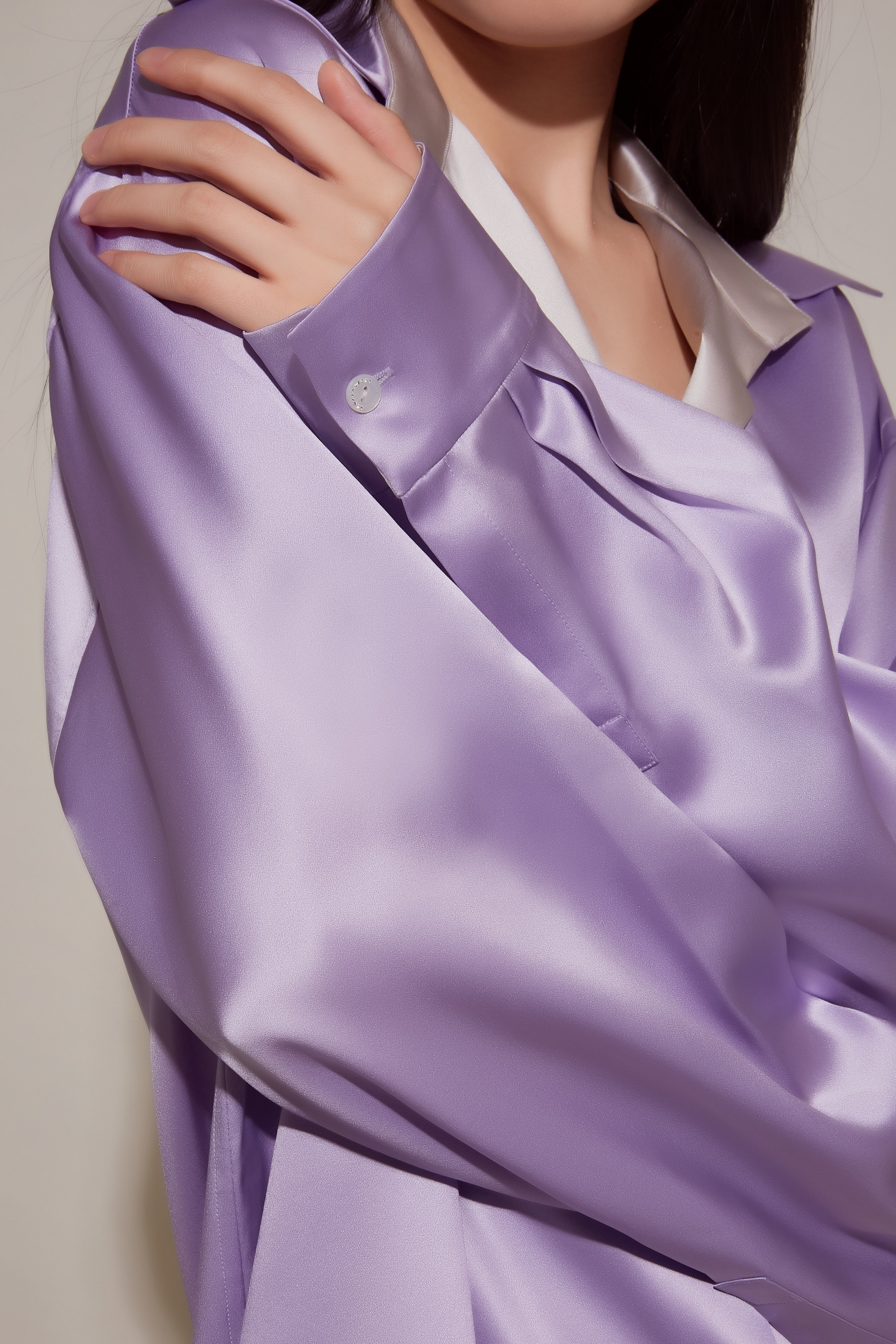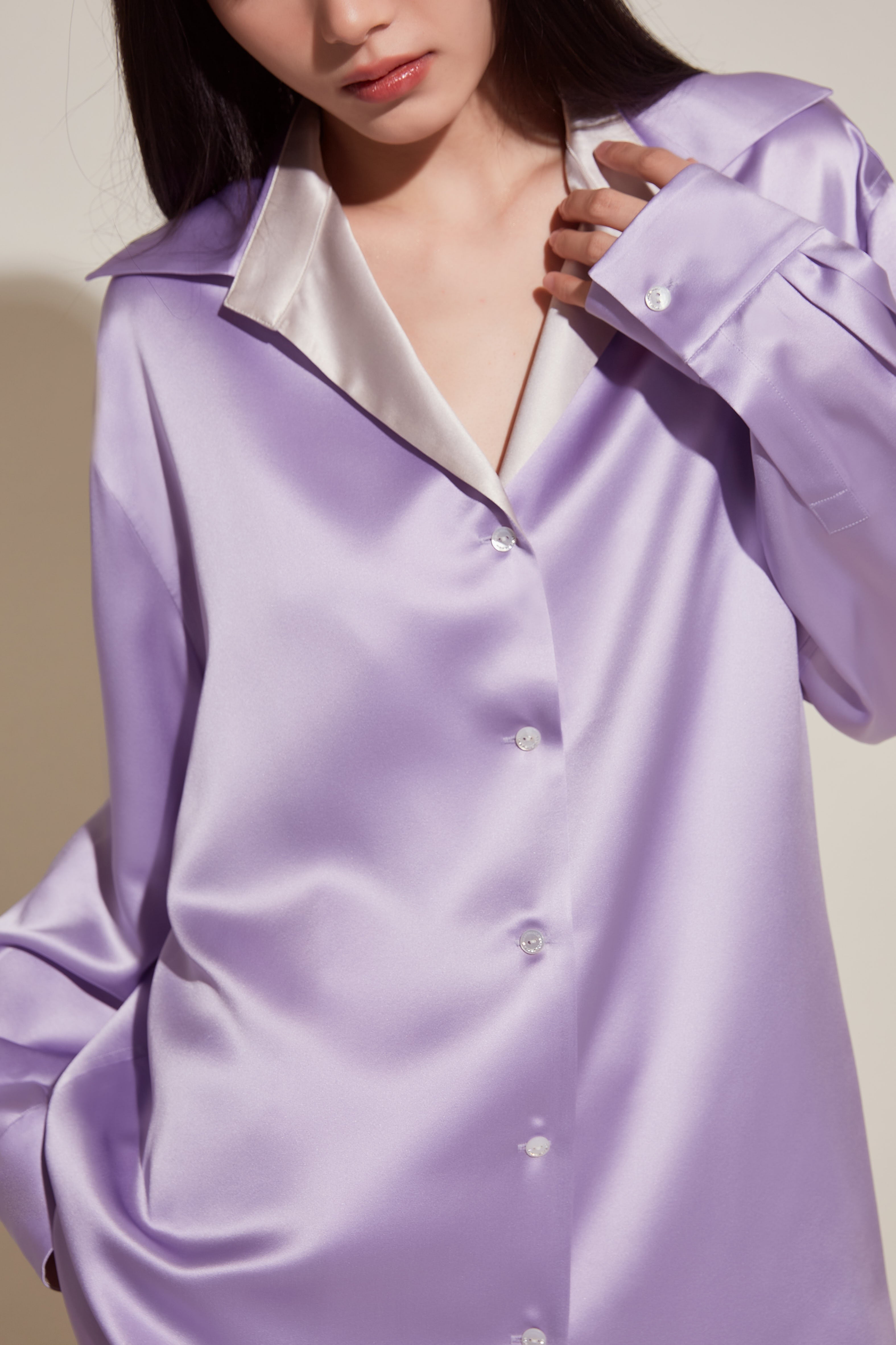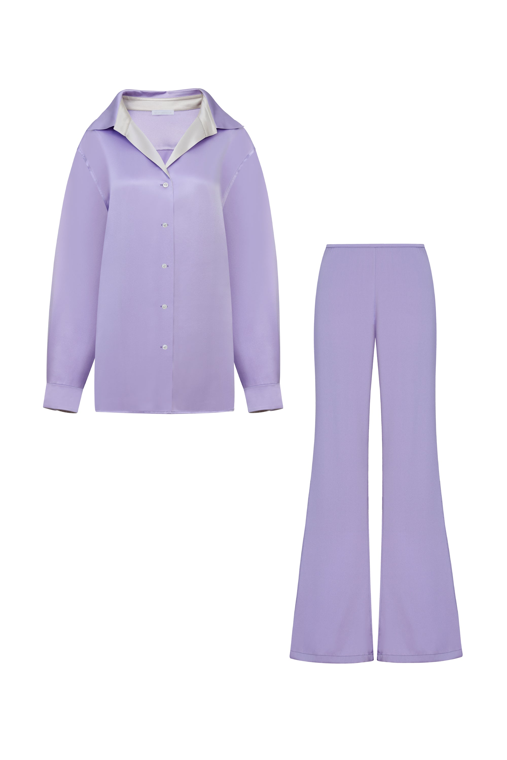 Live beautifully in bold silk shades. Crafted from 100% mulberry silk, featuring an oversized relaxed shirt and fitted flared pants.