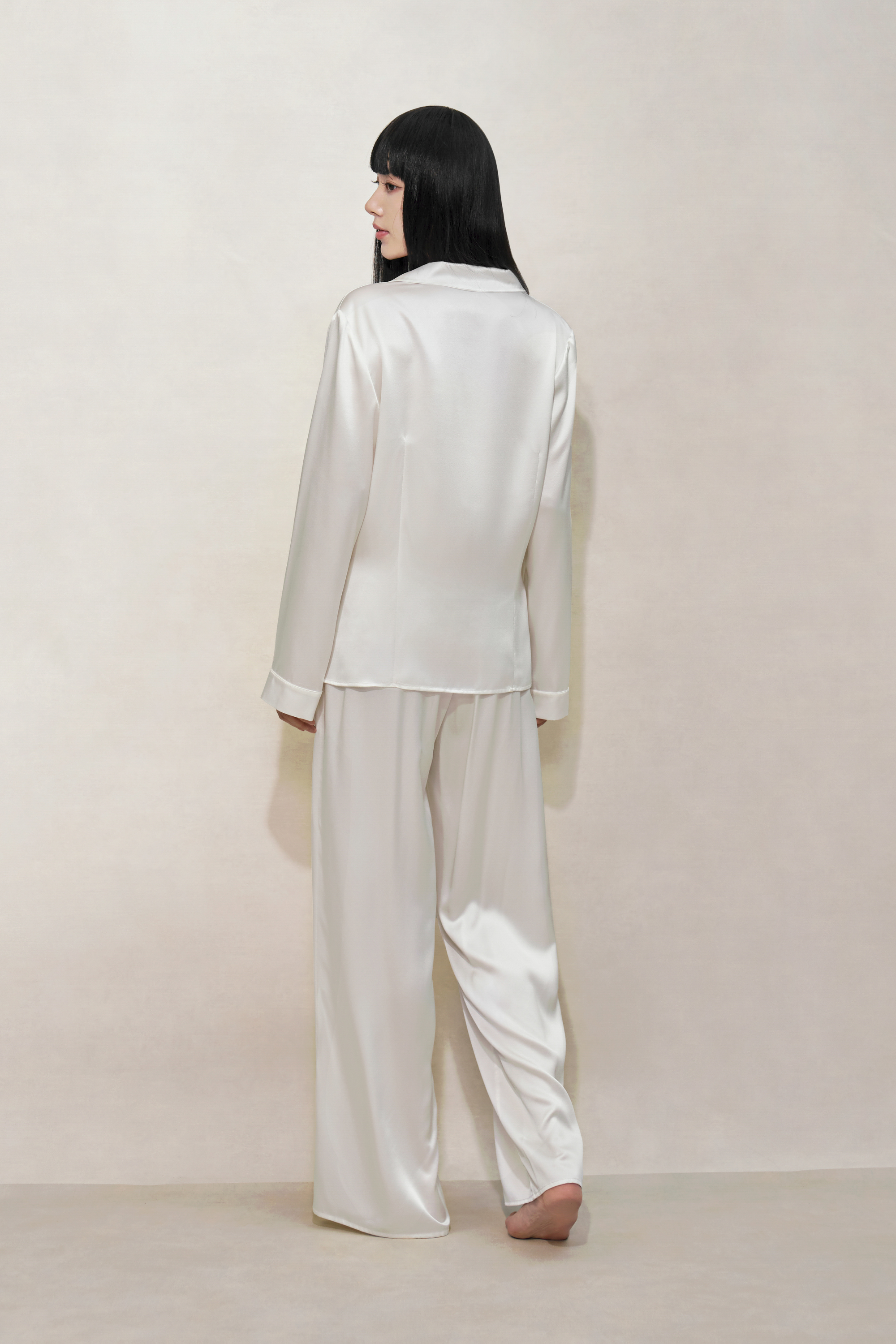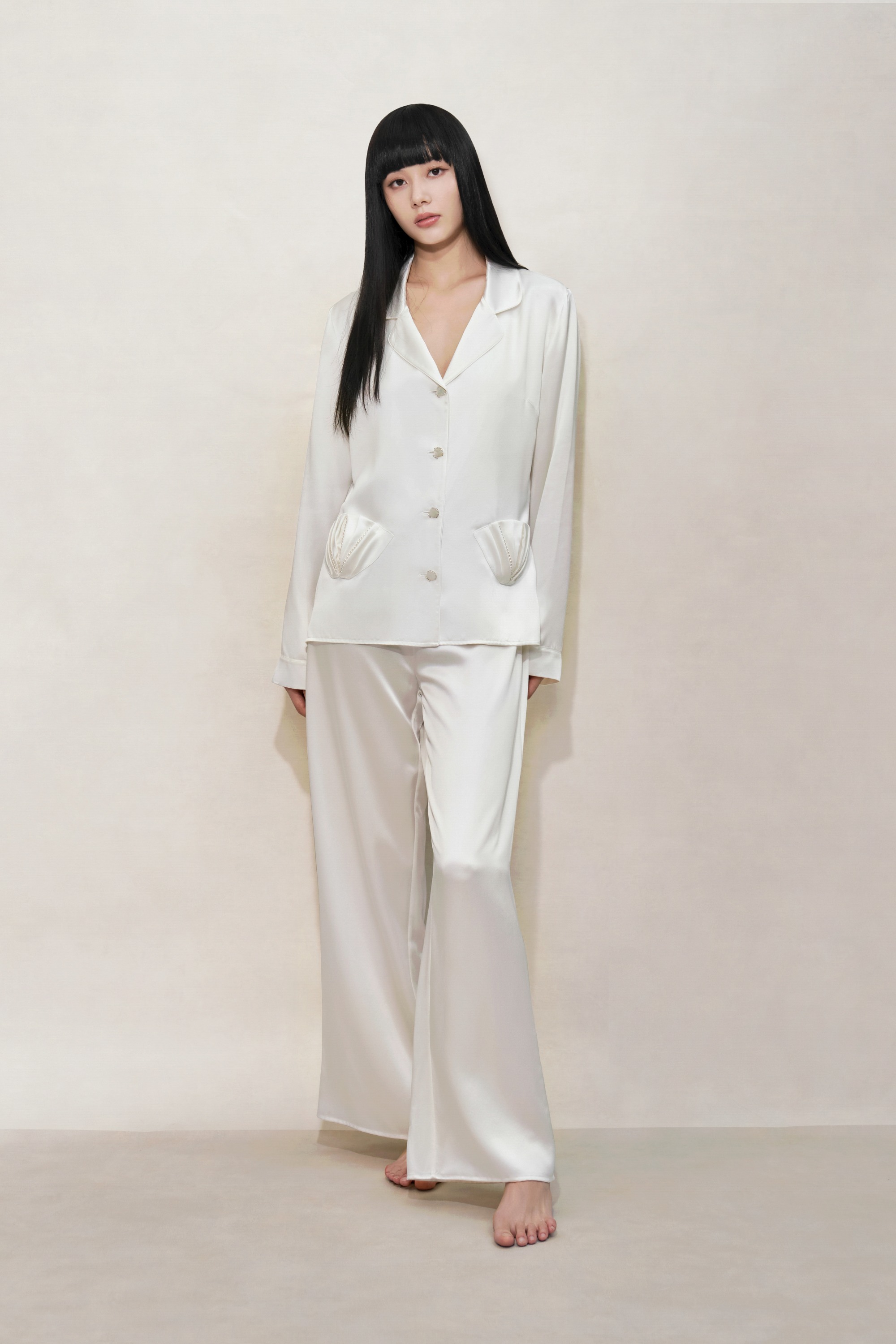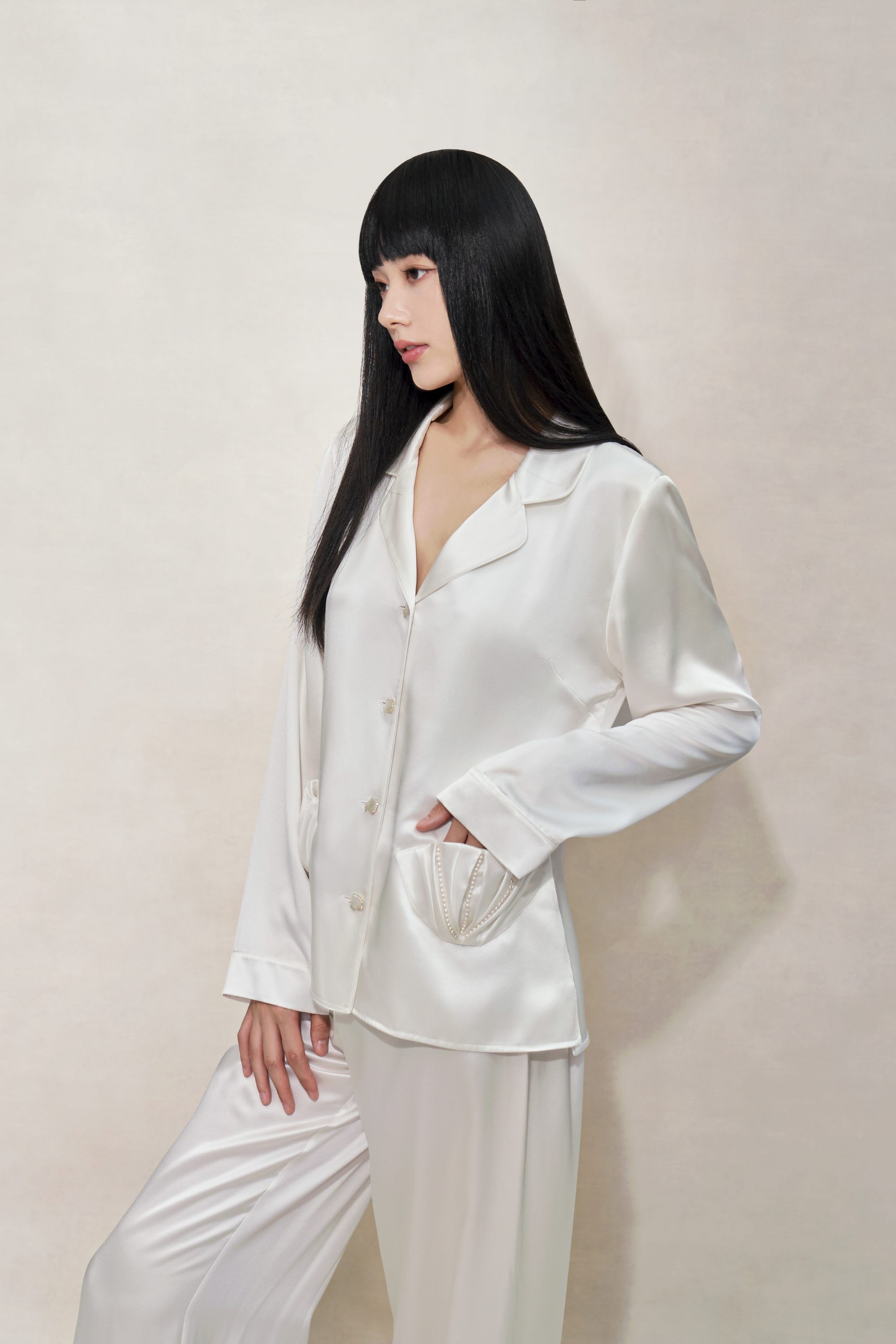 Double-layered silk pajamas in pearl white and sky blue with a dreamy, oceanic vibe.