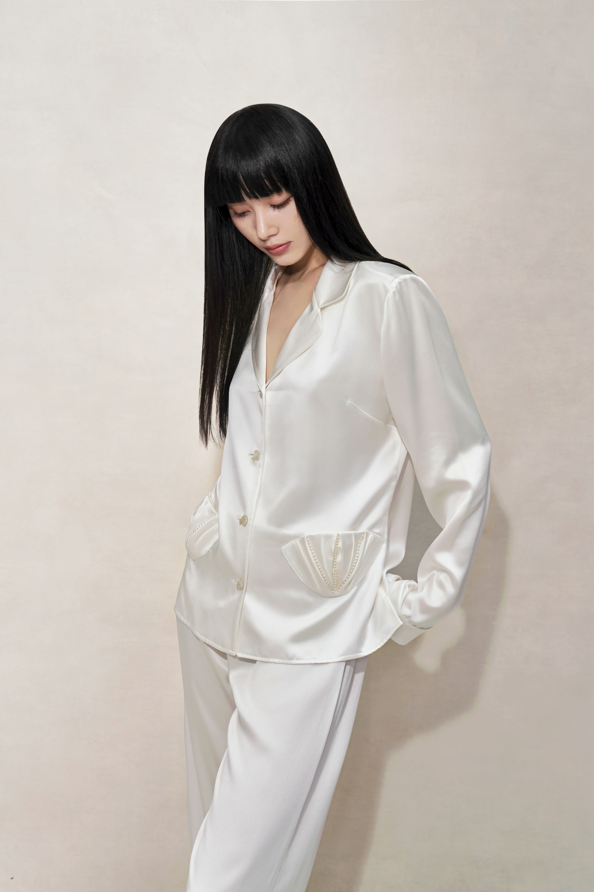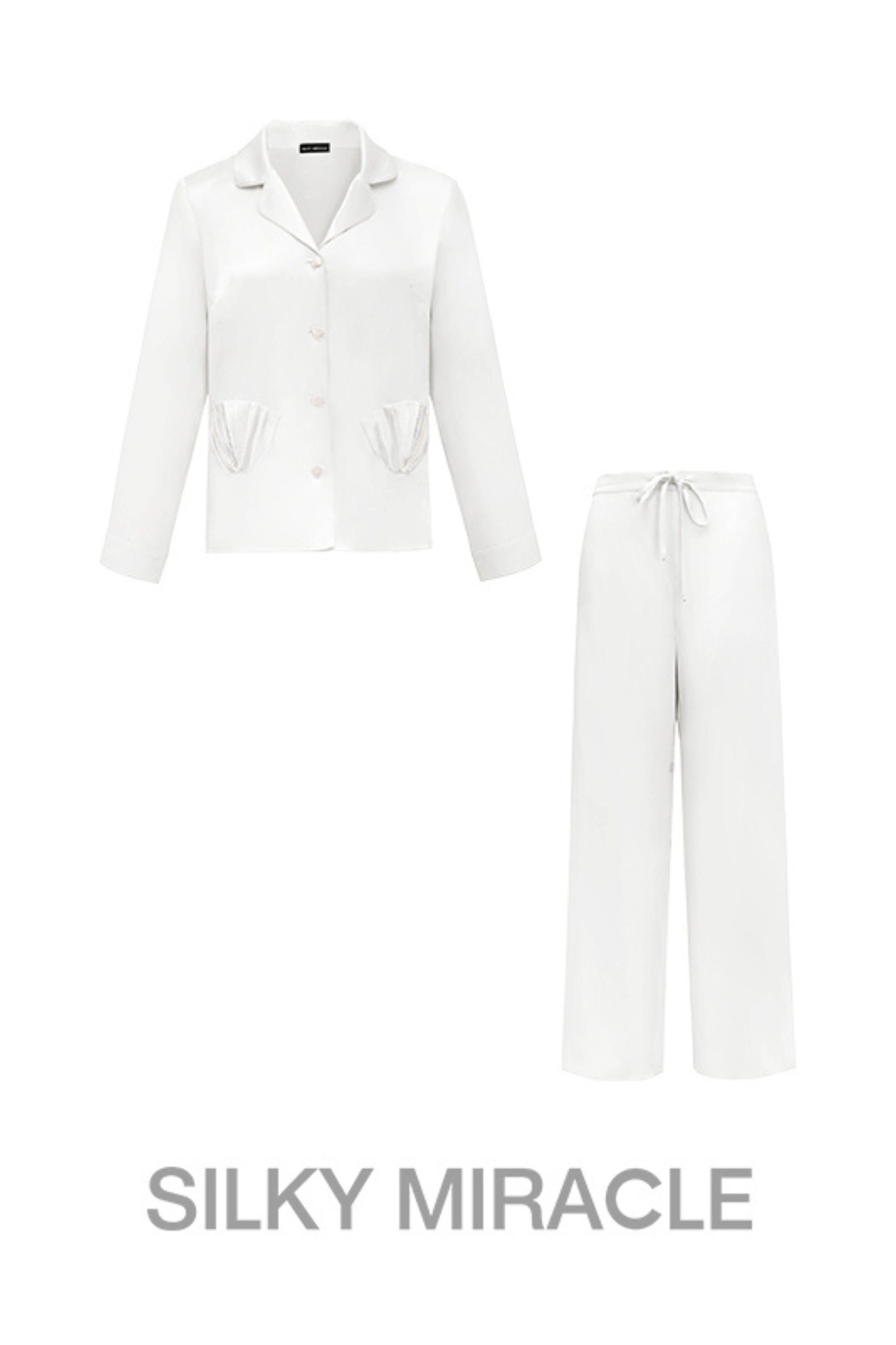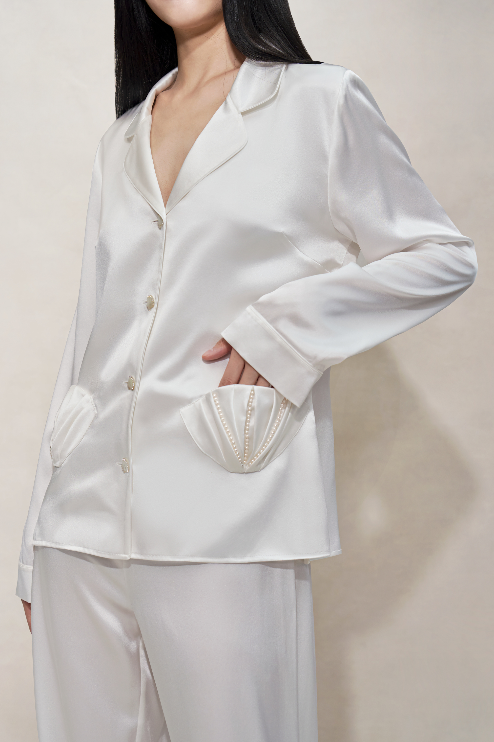 Double-layered silk pajamas in pearl white and sky blue with a dreamy, oceanic vibe.