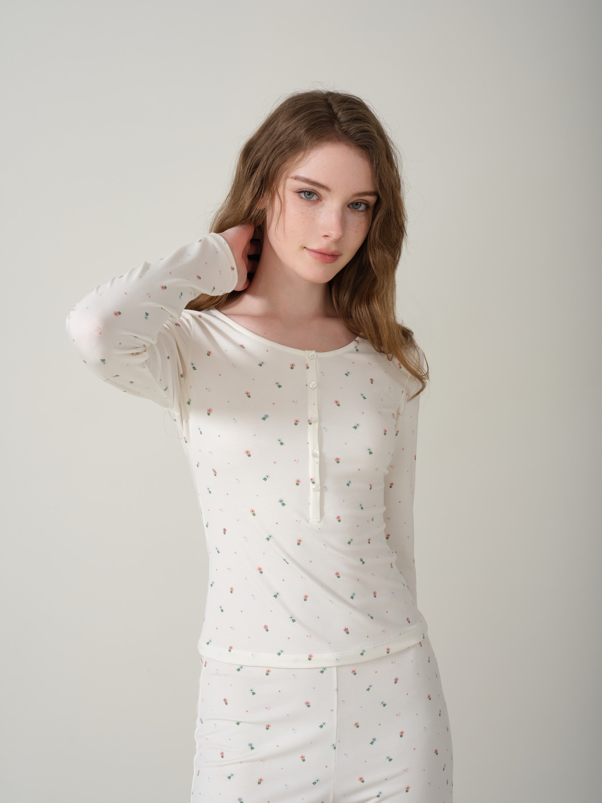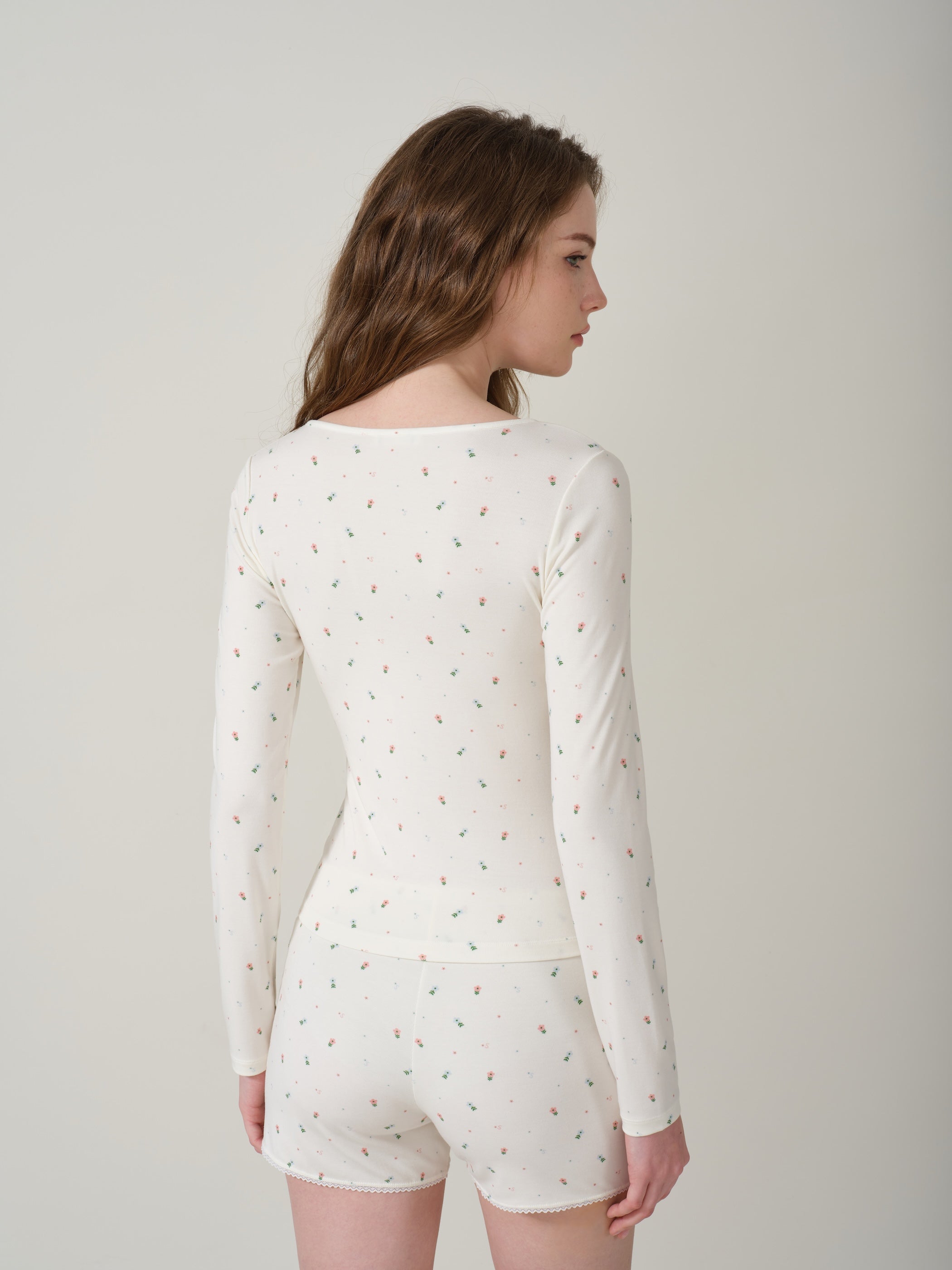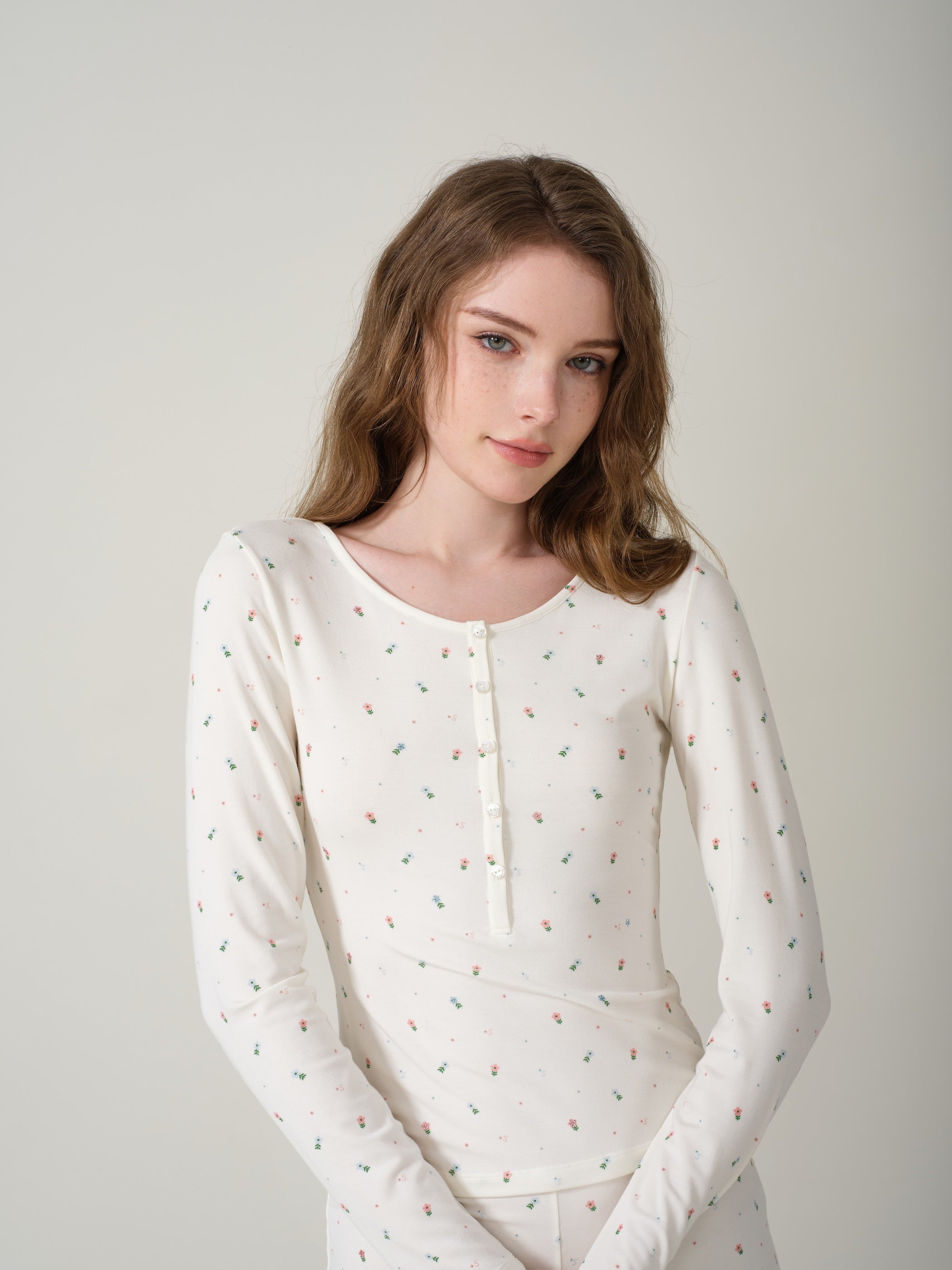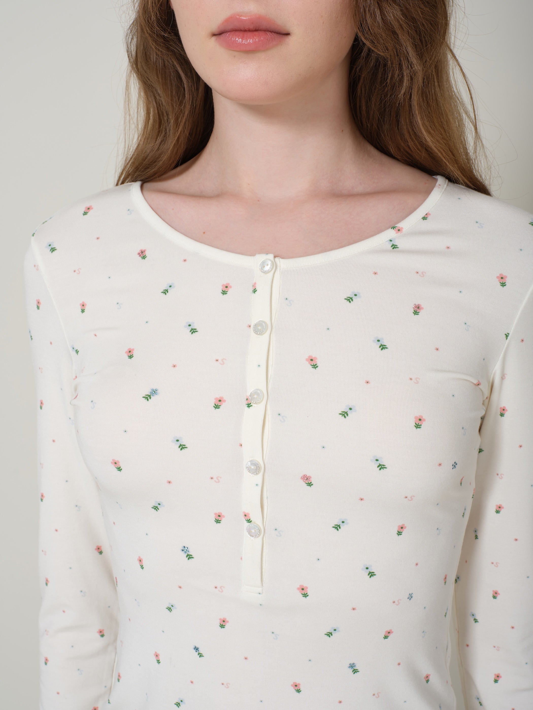 The cute floral spray-print fabric paired with soft knit material enhances the cozy, sweet-at-home vibe. The round neckline with decorative buttons adds a touch of Western-inspired sweet-and-cool charm. Scattered rhinestone embellishments shimmer in harmony with the refined, crystal-accented mother-of-pearl buttons. Pairs perfectly with matching shorts or cropped lounge pants from the same collection.
