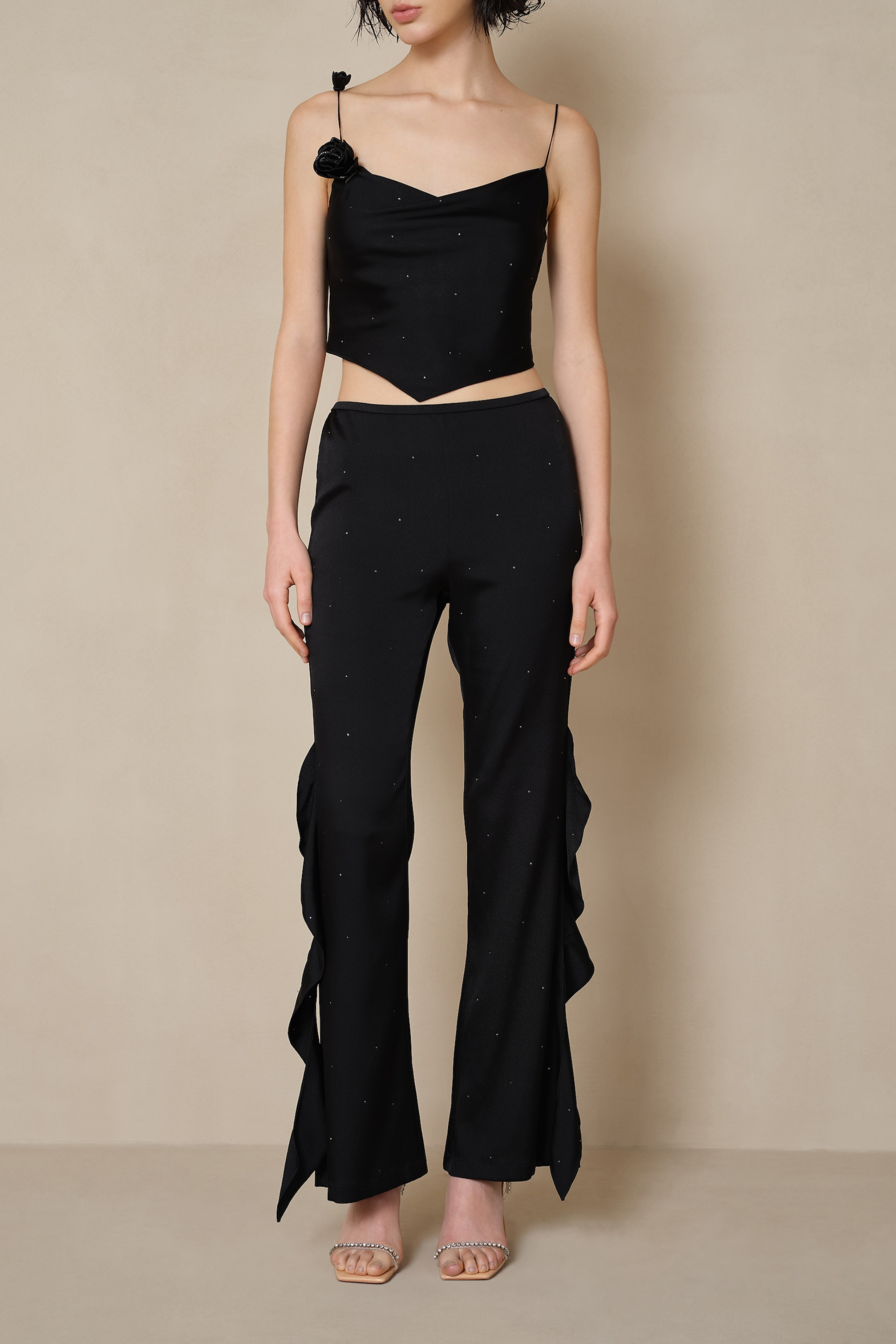 The classic skinny flared trouser shape is complemented by a full-body rhinestone and cascading ruffles.