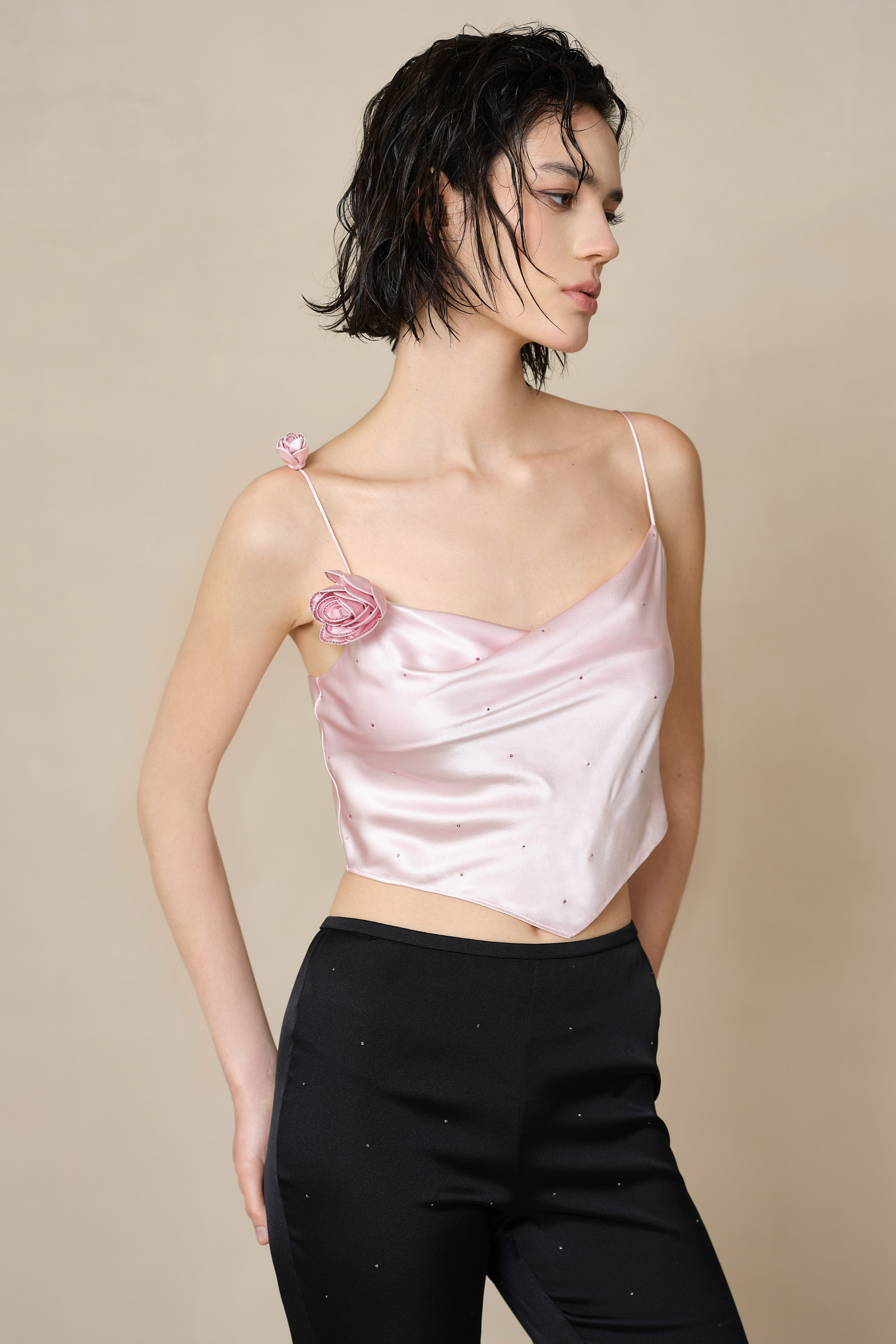 The Rose Silk Cropped Cami top features three-dimensional rose embellishments on the straps and is decorated with rhinestones throughout.