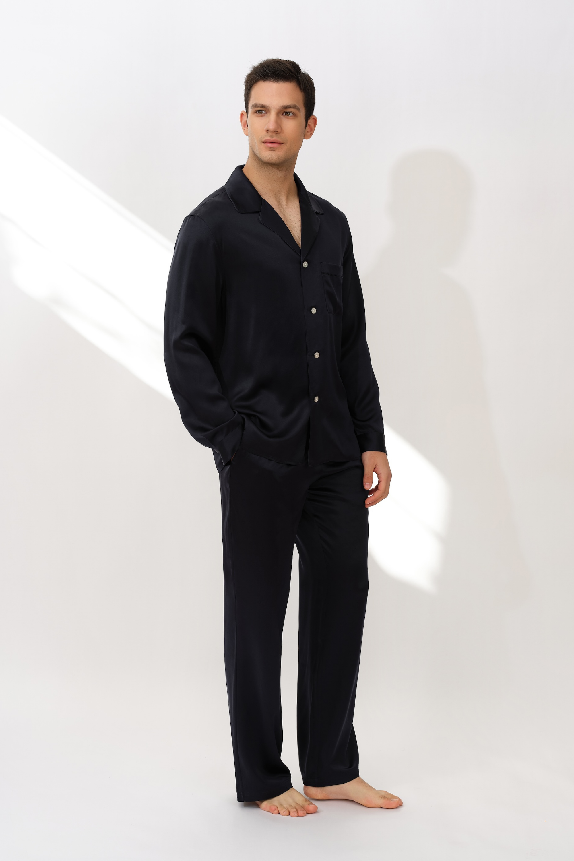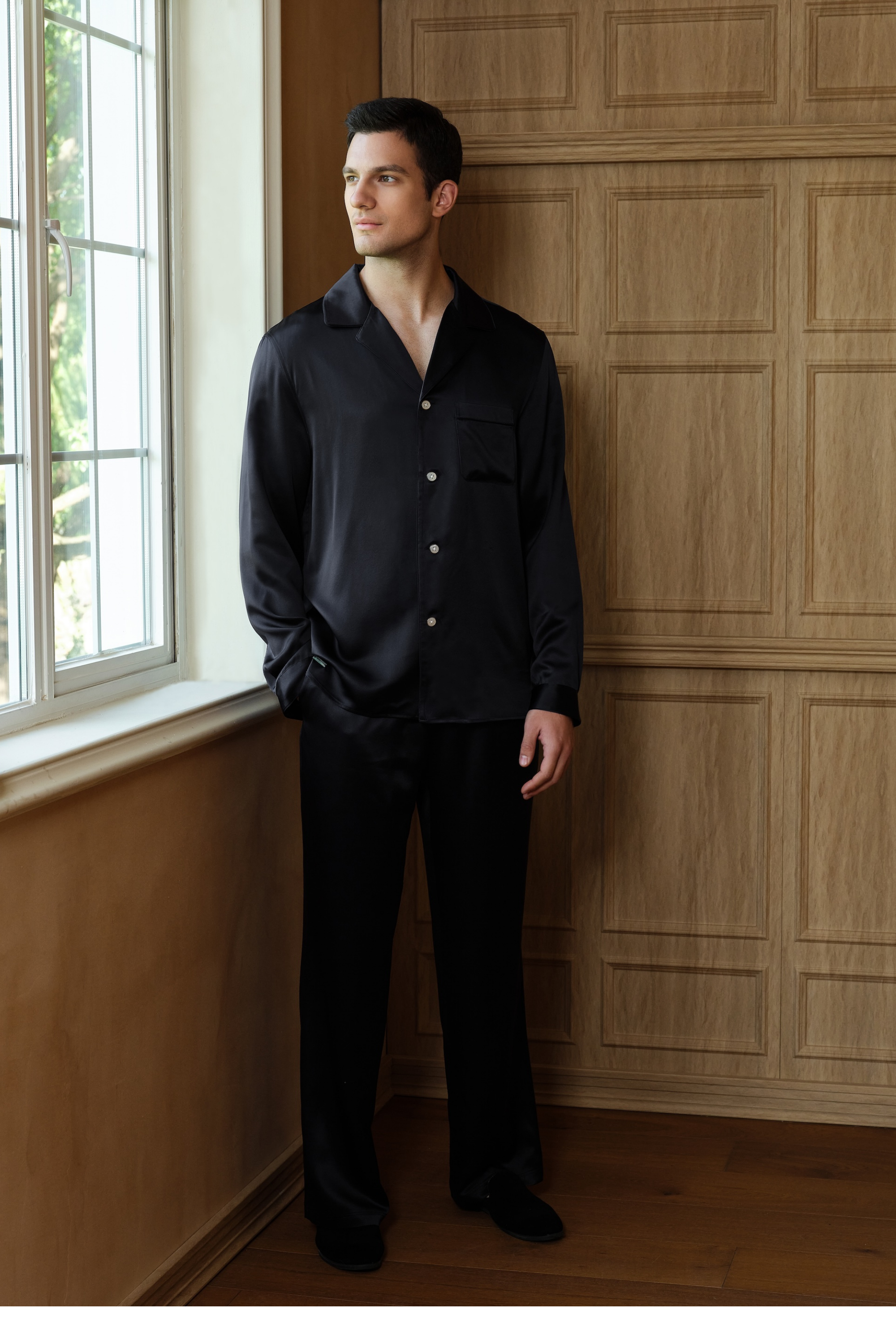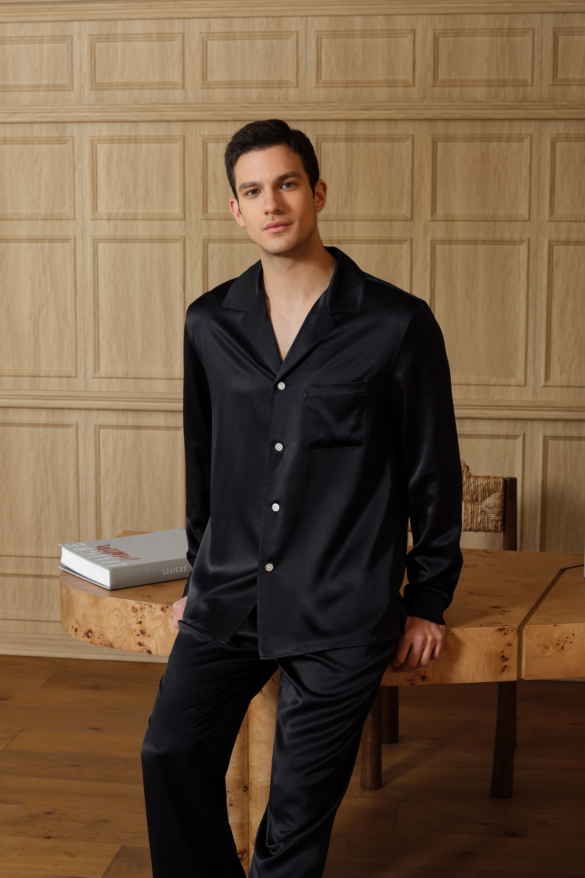 Men’s classic lapel pajama set featuring a minimalist design, loose fit, and clean, refined tailoring. Adorned with MIRACLE custom metal mother-of-pearl buttons, this set enhances the luxurious texture of silk