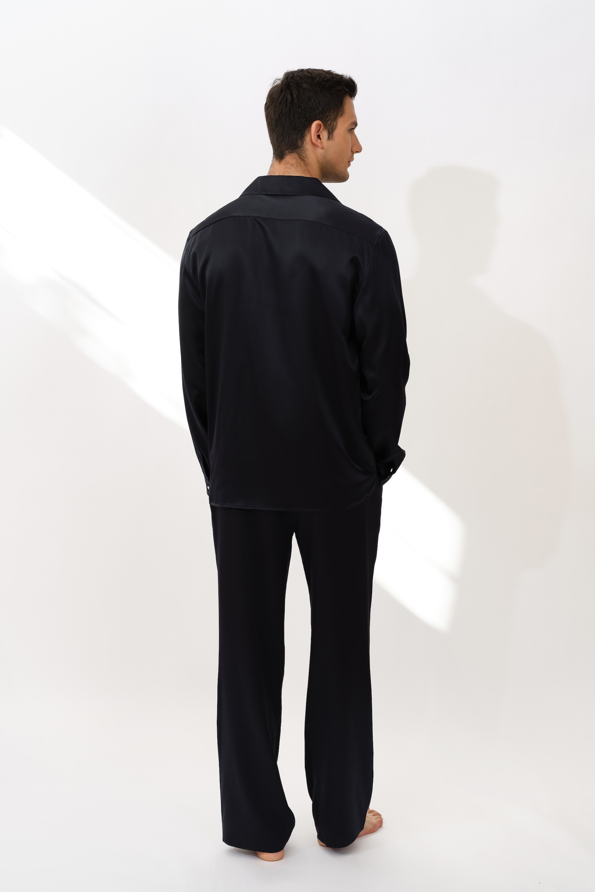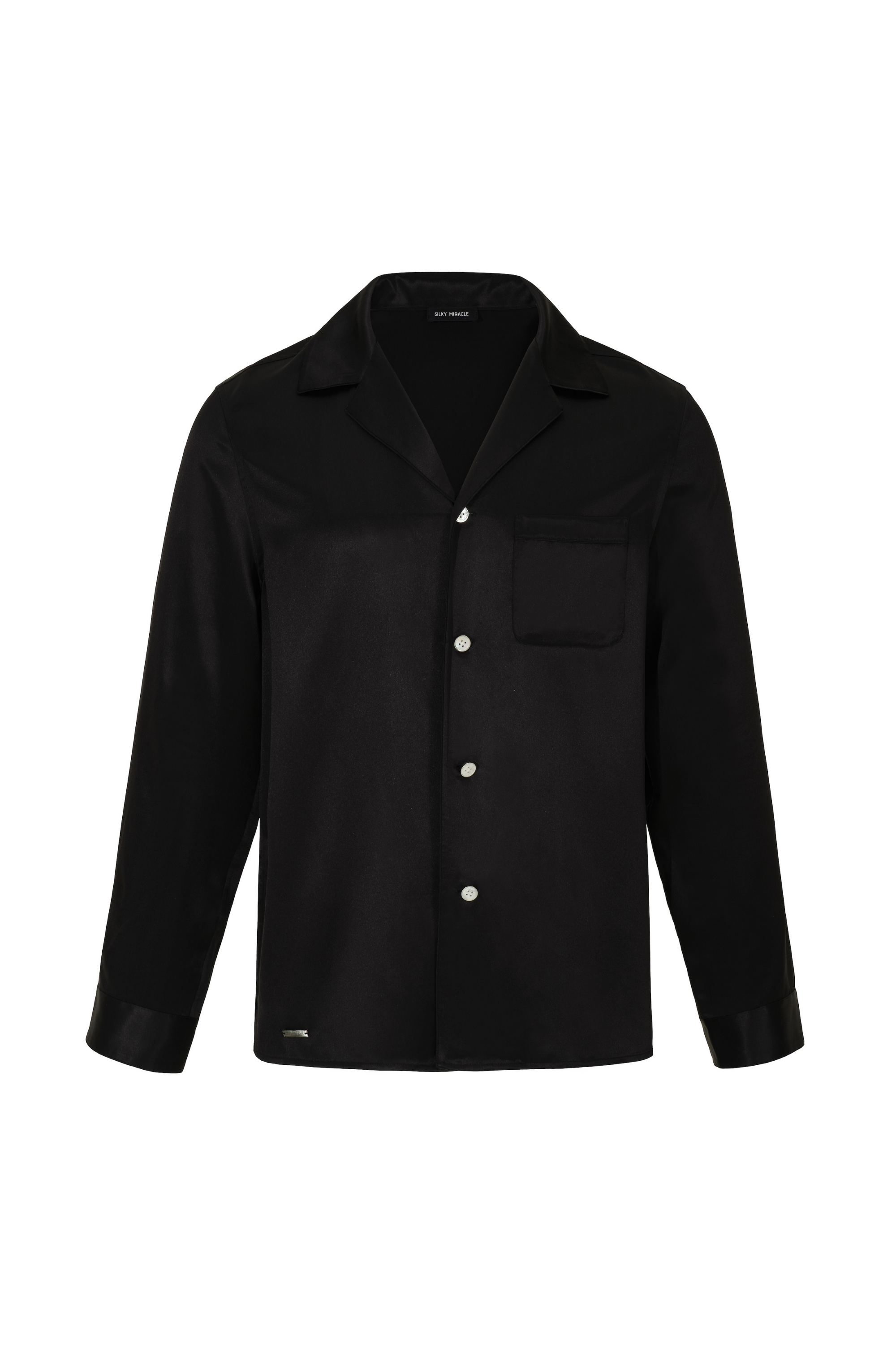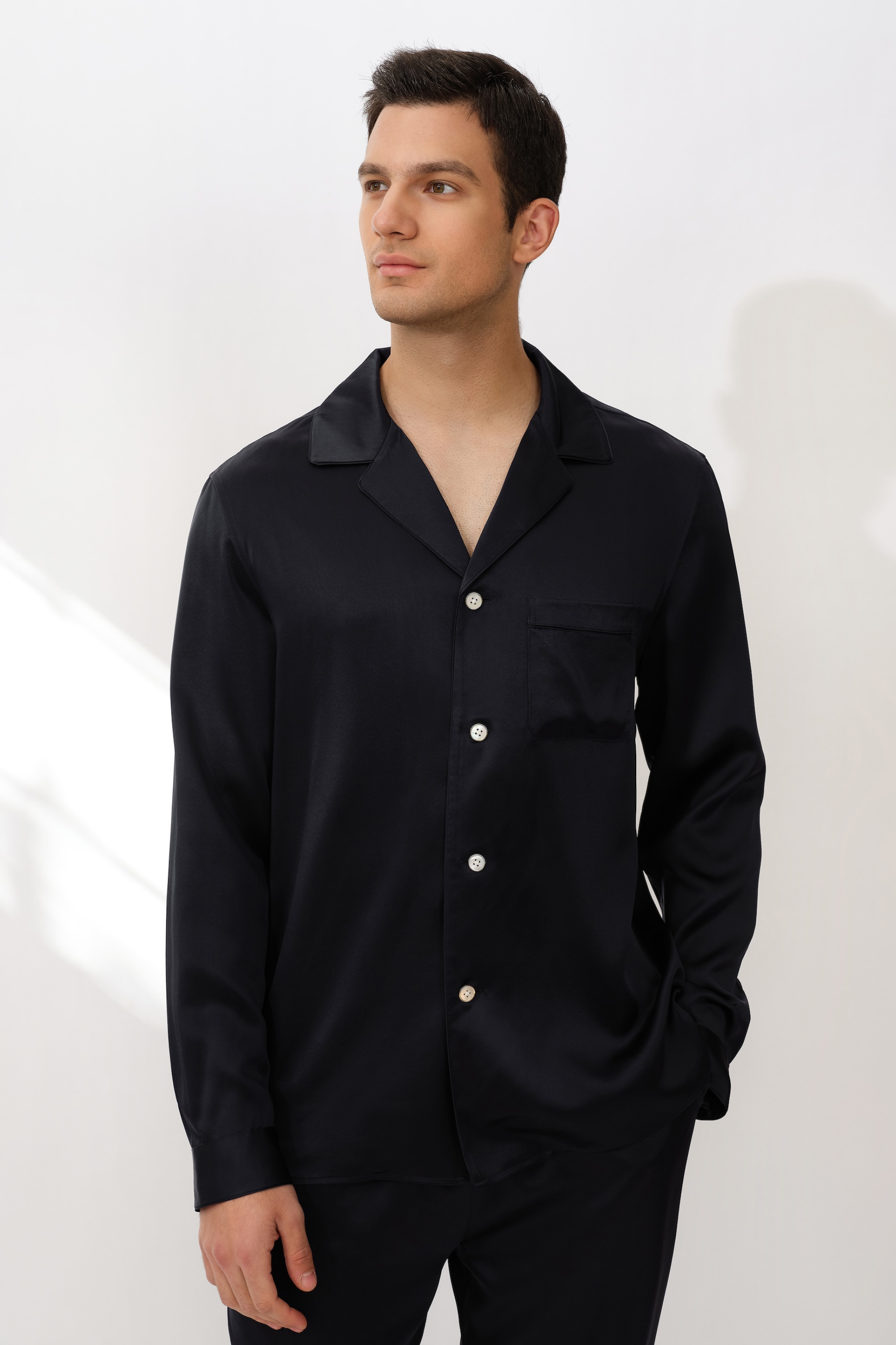 Men’s classic lapel pajama set featuring a minimalist design, loose fit, and clean, refined tailoring. Adorned with MIRACLE custom metal mother-of-pearl buttons, this set enhances the luxurious texture of silk