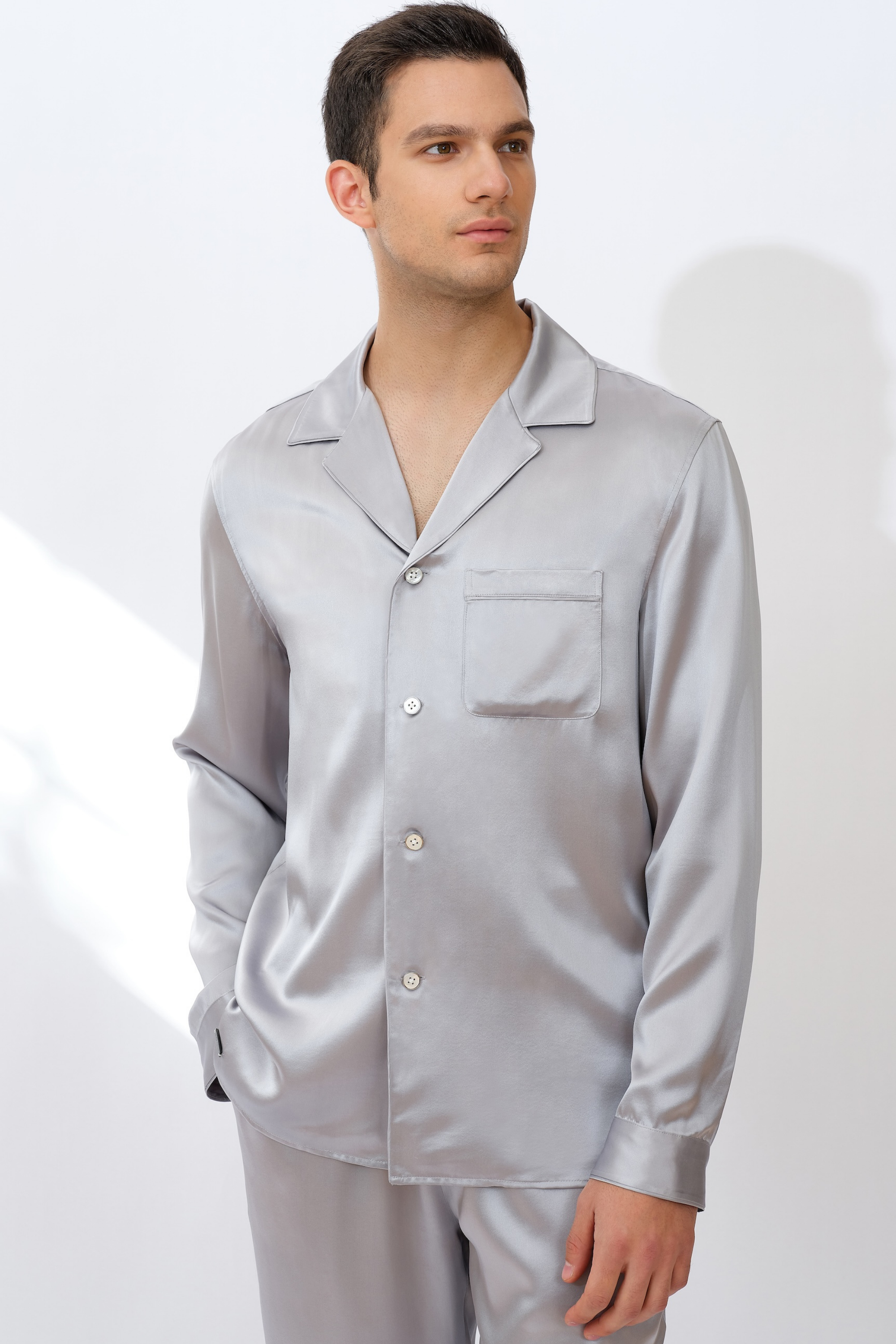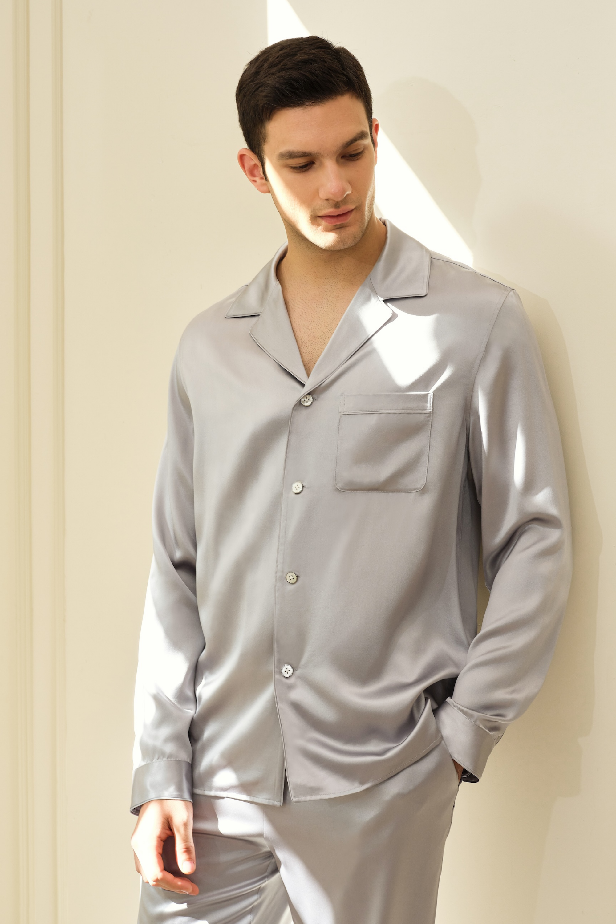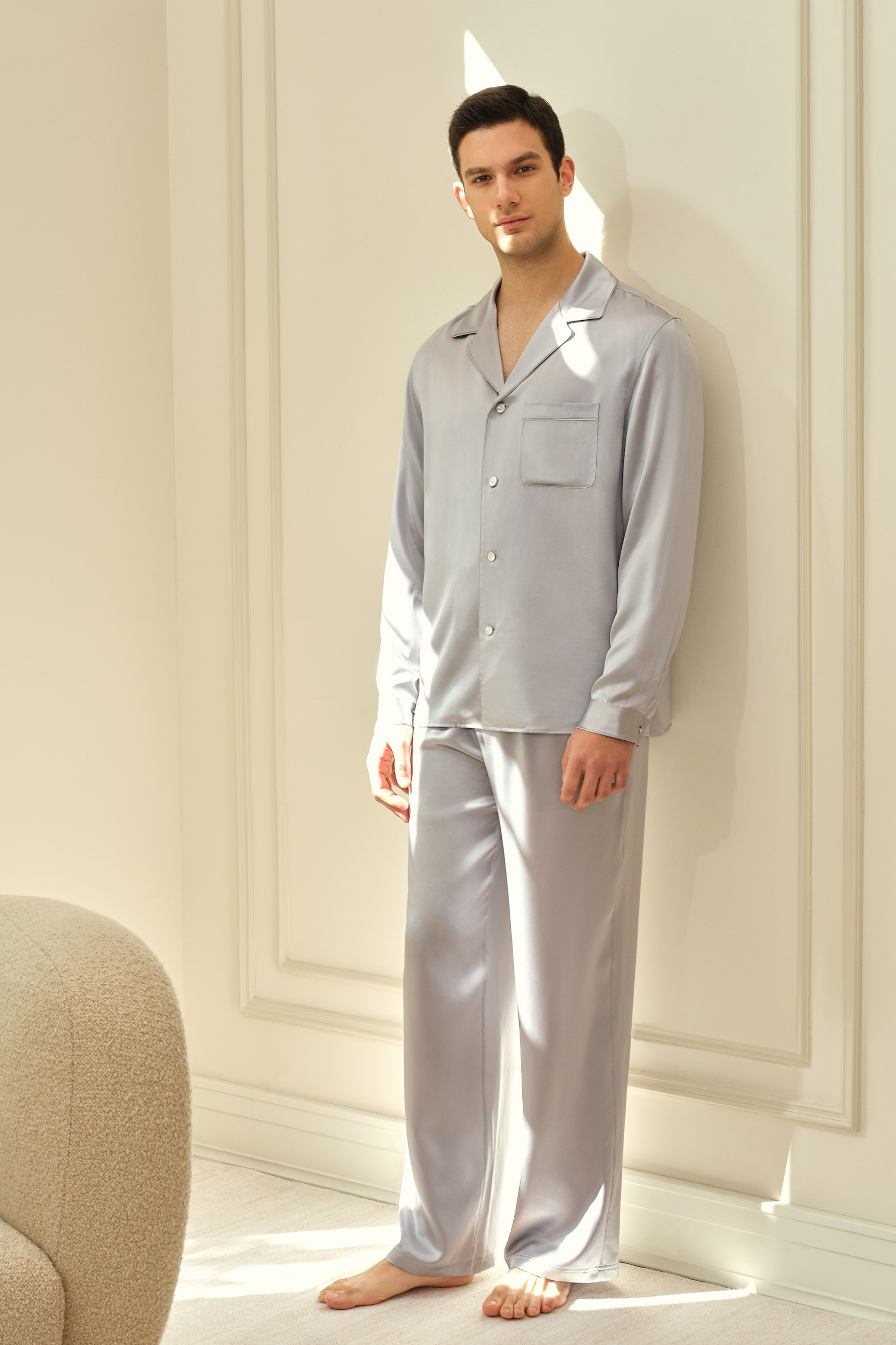 Men's classic lapel pyjama set, designed with a loose, relaxed fit and refined tailoring for a timeless look. Enhanced with custom MIRACLE metal mother-of-pearl buttons, this set elevates the luxurious feel of silk.