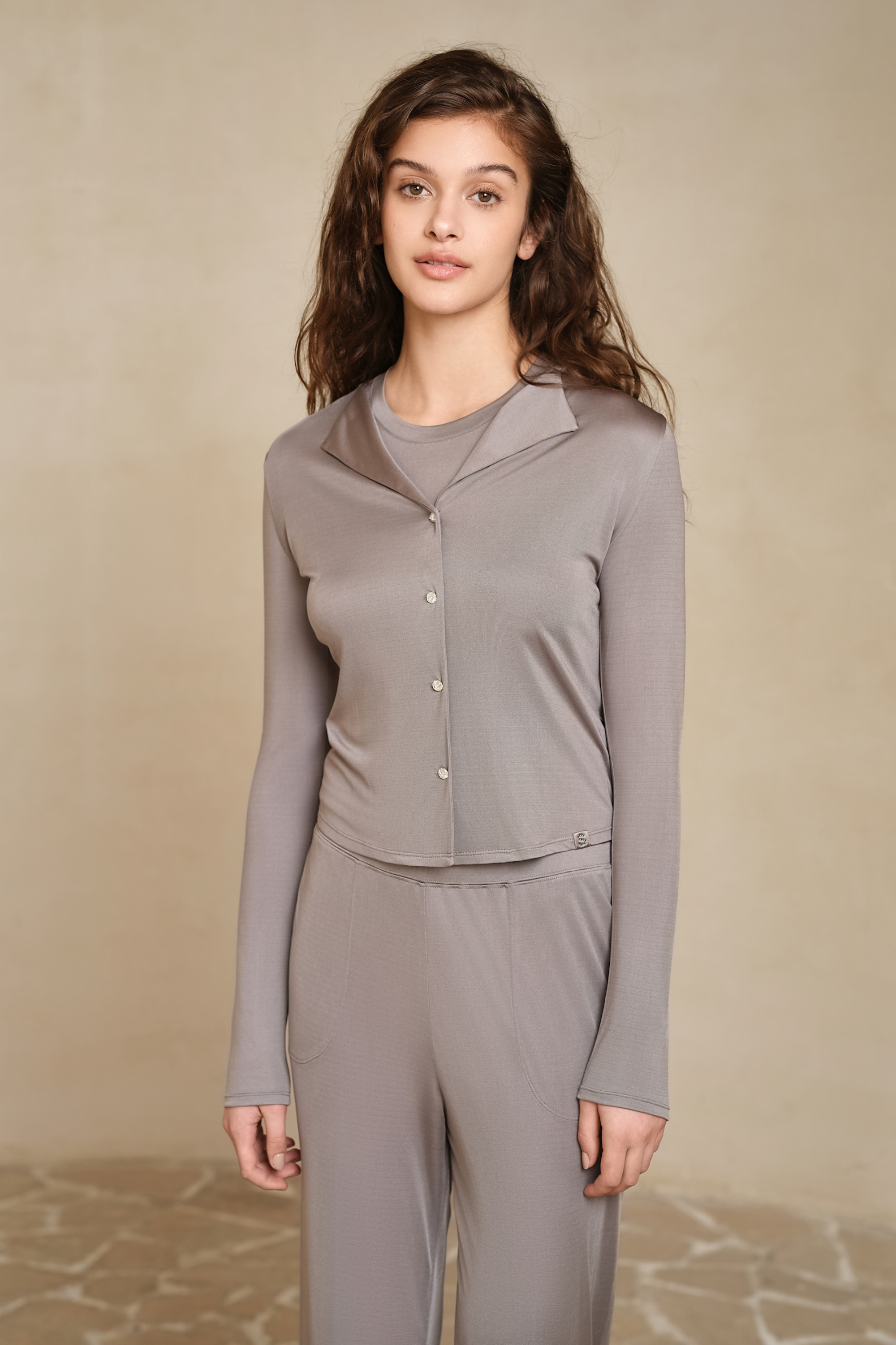 Crafted from 100% Mulberry Silk knit fabric, this cardigan offers an excellent feel against the skin with a subtle matte shine. Its small collar and fitted silhouette give a playful and lively vibe.