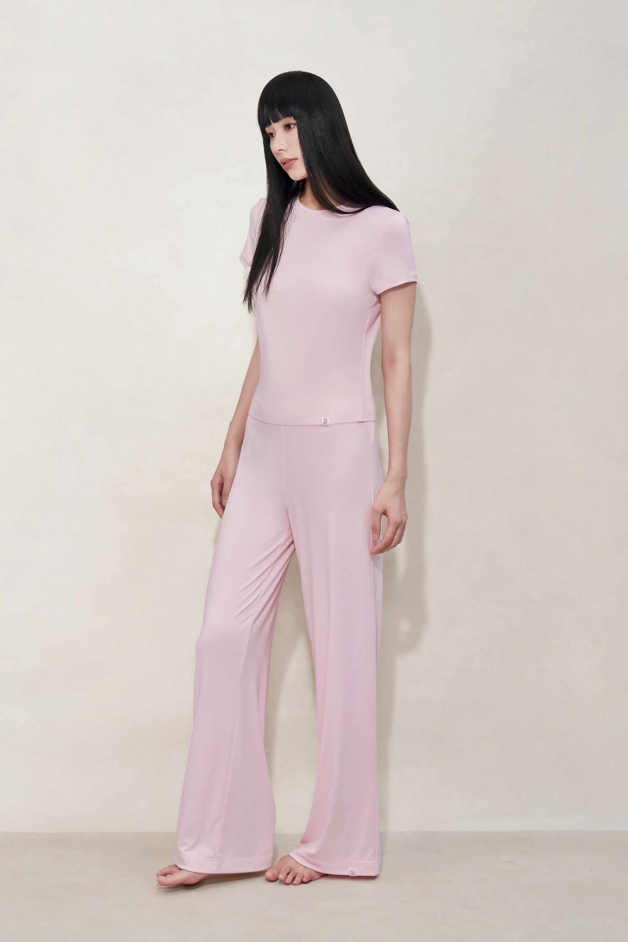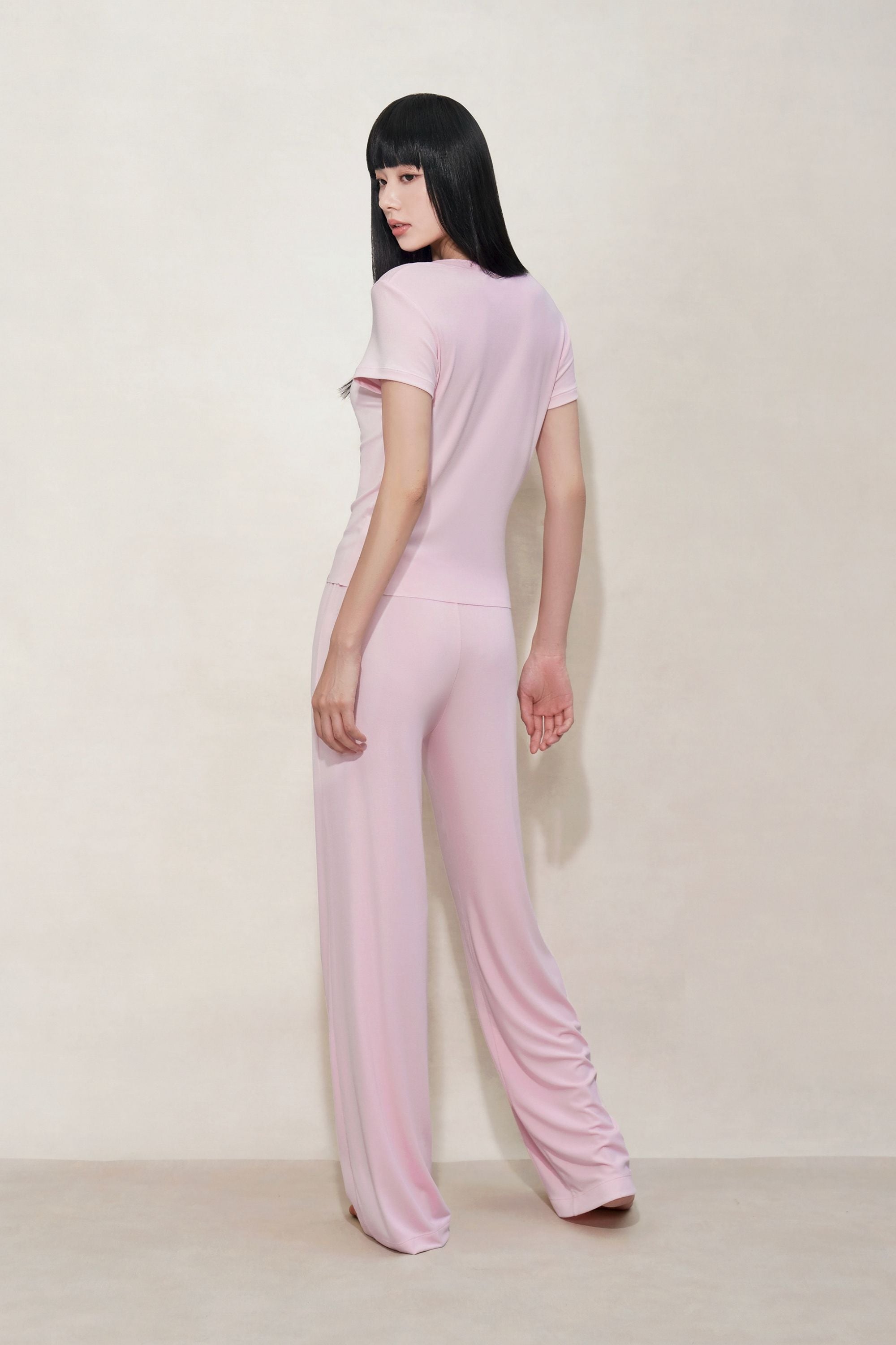 Experience softness and flexibility of our Mulberry silk modal knit fabric. The relaxed fit of the straight-leg trousers flatters the silhouette, while providing lasting comfort.