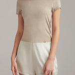 The Swarovski Nude Round-Neck Top from our silk blend collection is crafted from a blend of mulberry silk, modal and spandex. Finished with Swarovski Crystals.