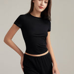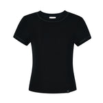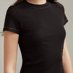 The Black Round-Neck Top from our silk blend collection is crafted from a blend of mulberry silk, modal and spandex. Finished with Swarovski Crystals.