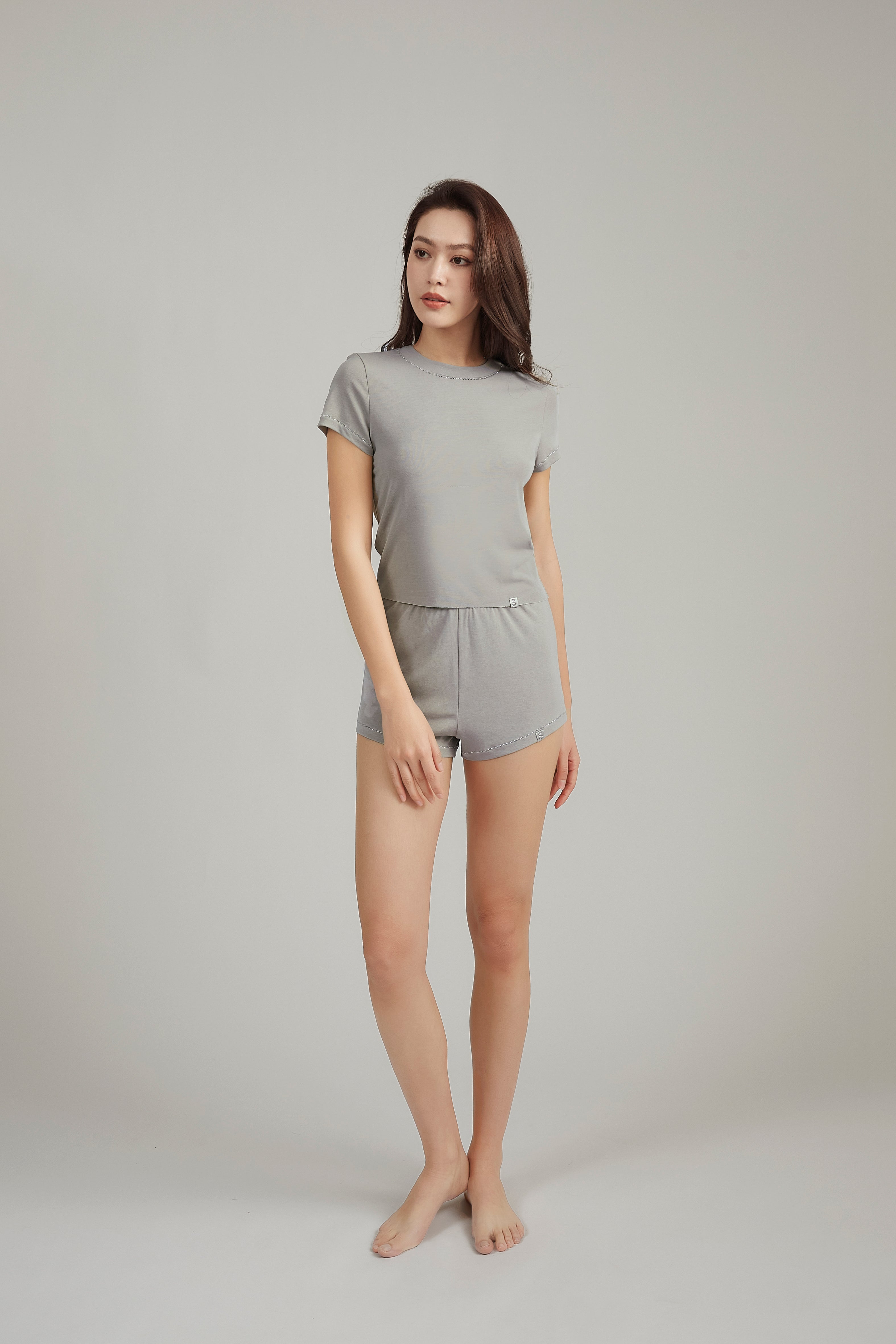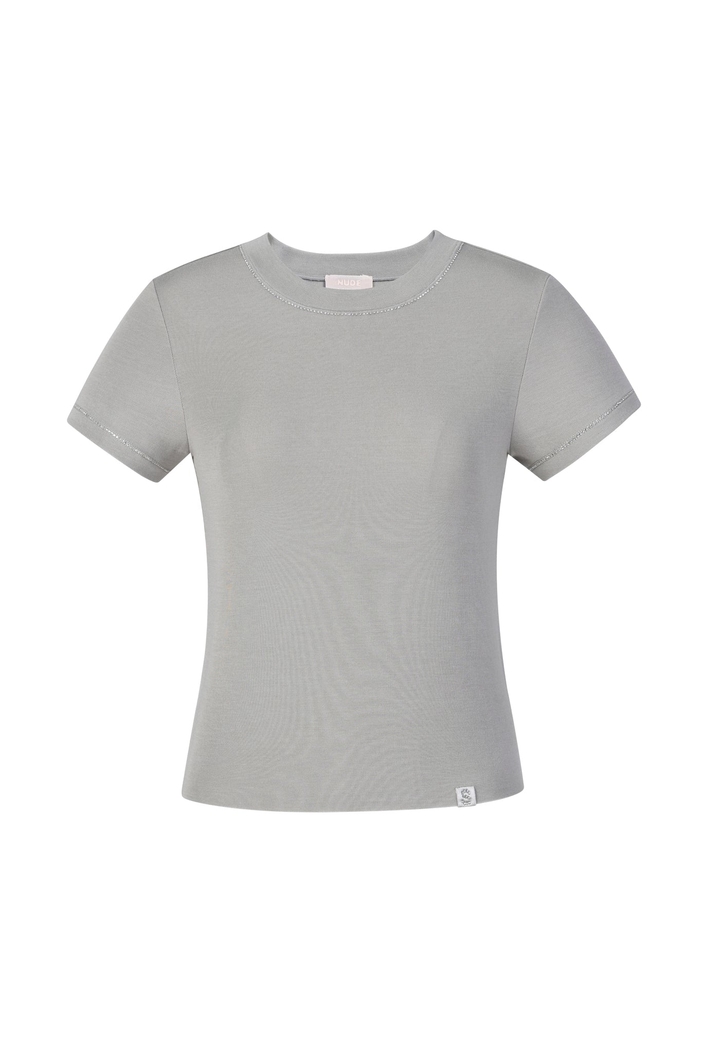 The Swarovski Grey Round-Neck Top from our silk blend collection is crafted from a blend of mulberry silk, modal and spandex. Finished with Swarovski Crystals.