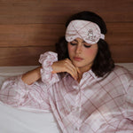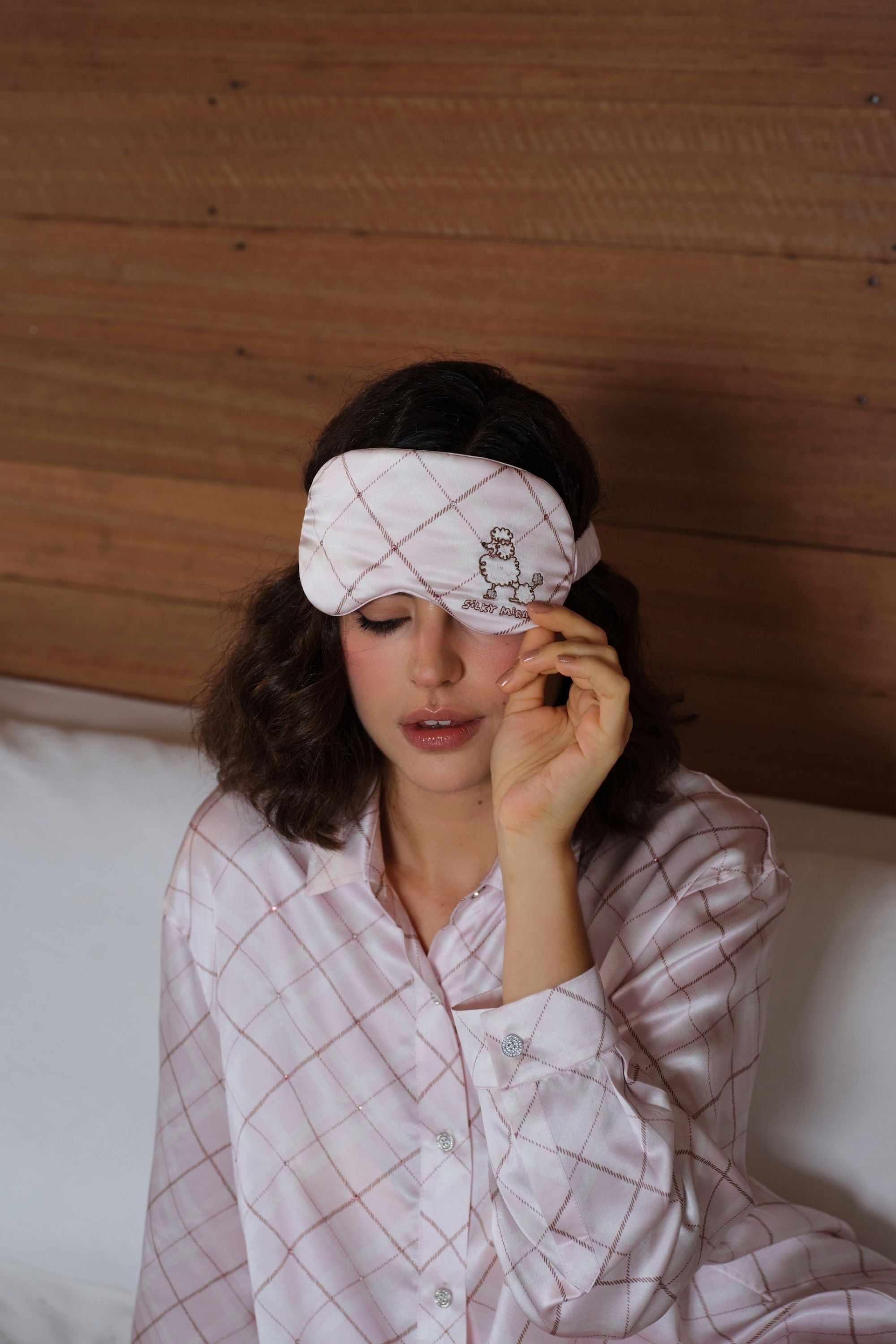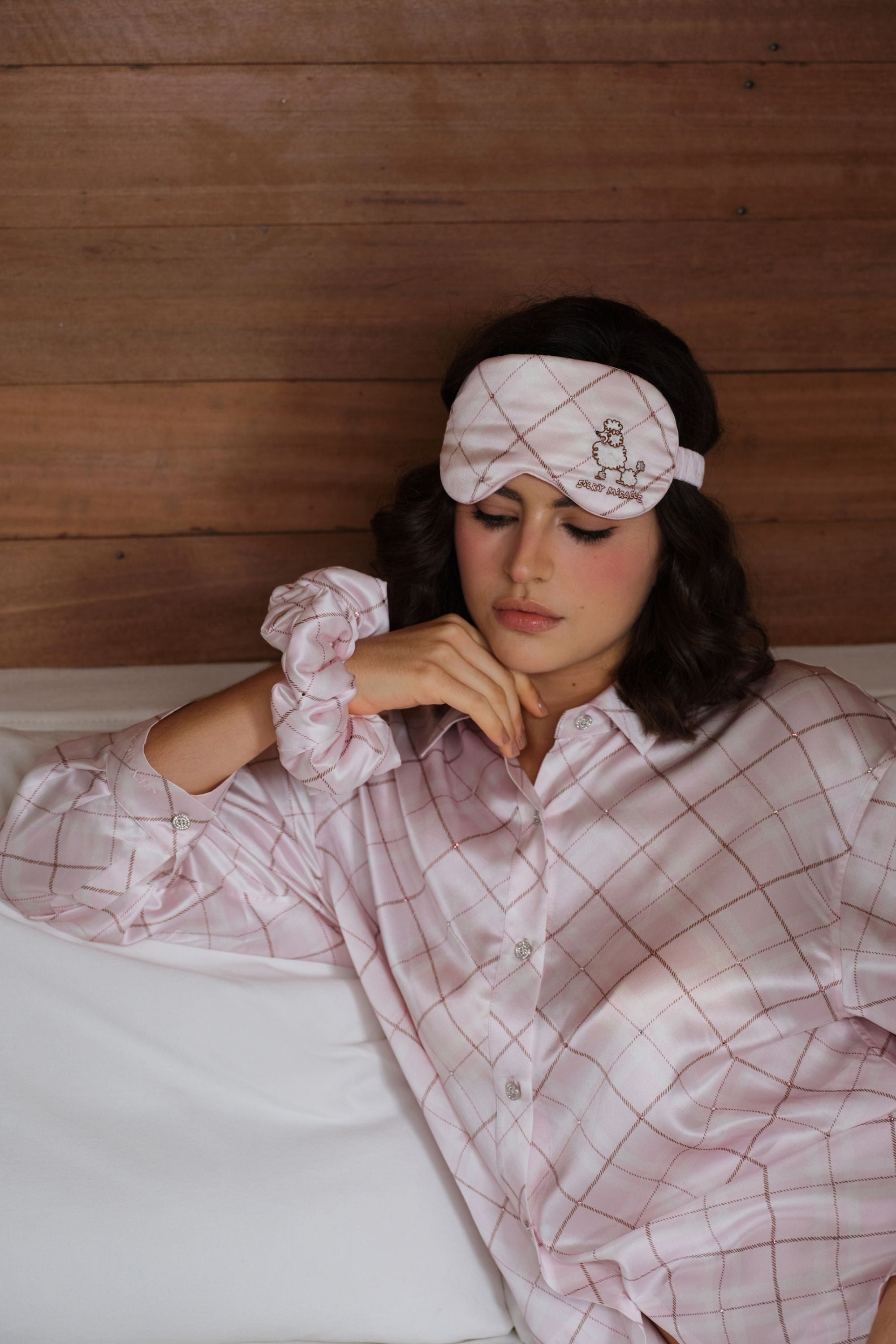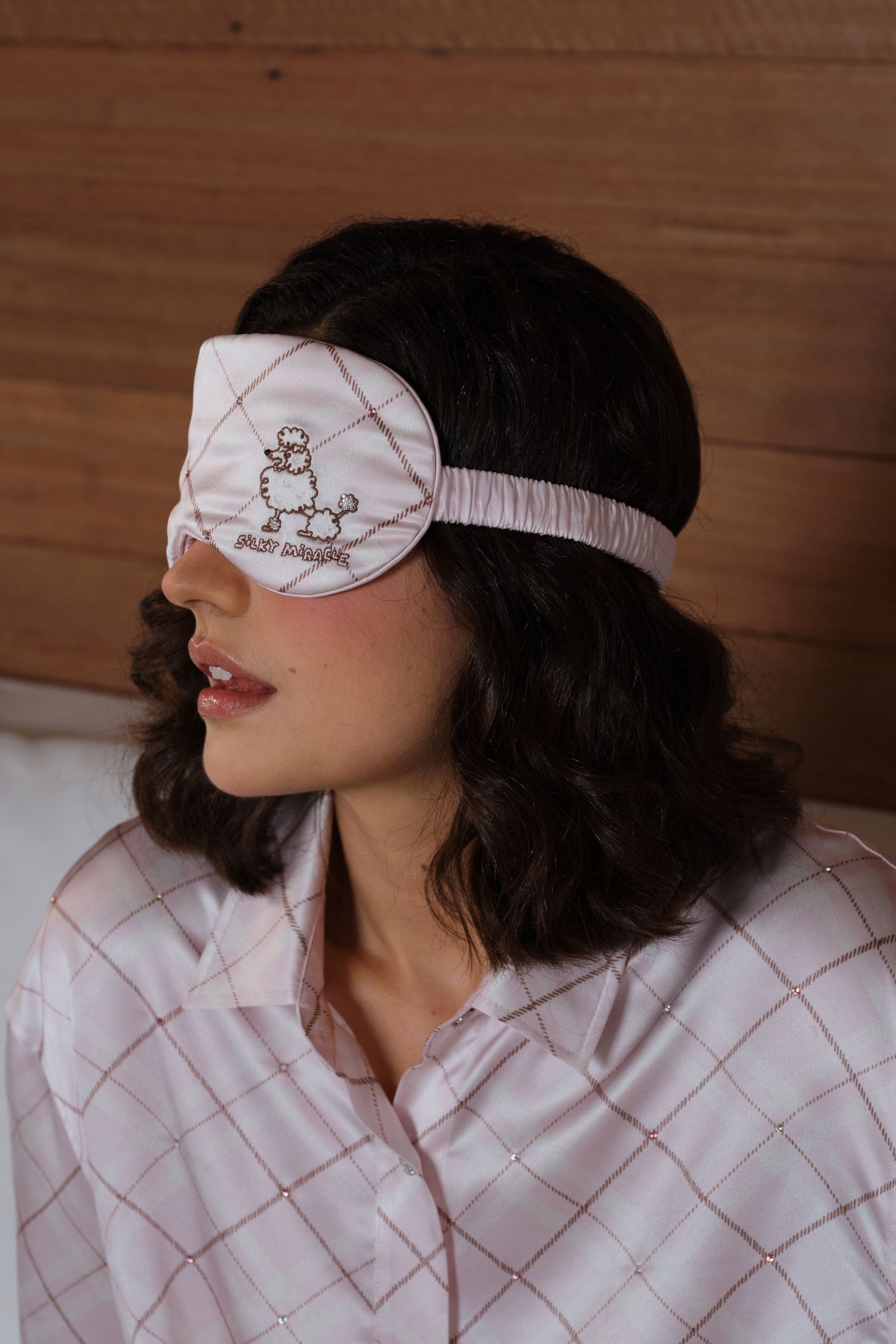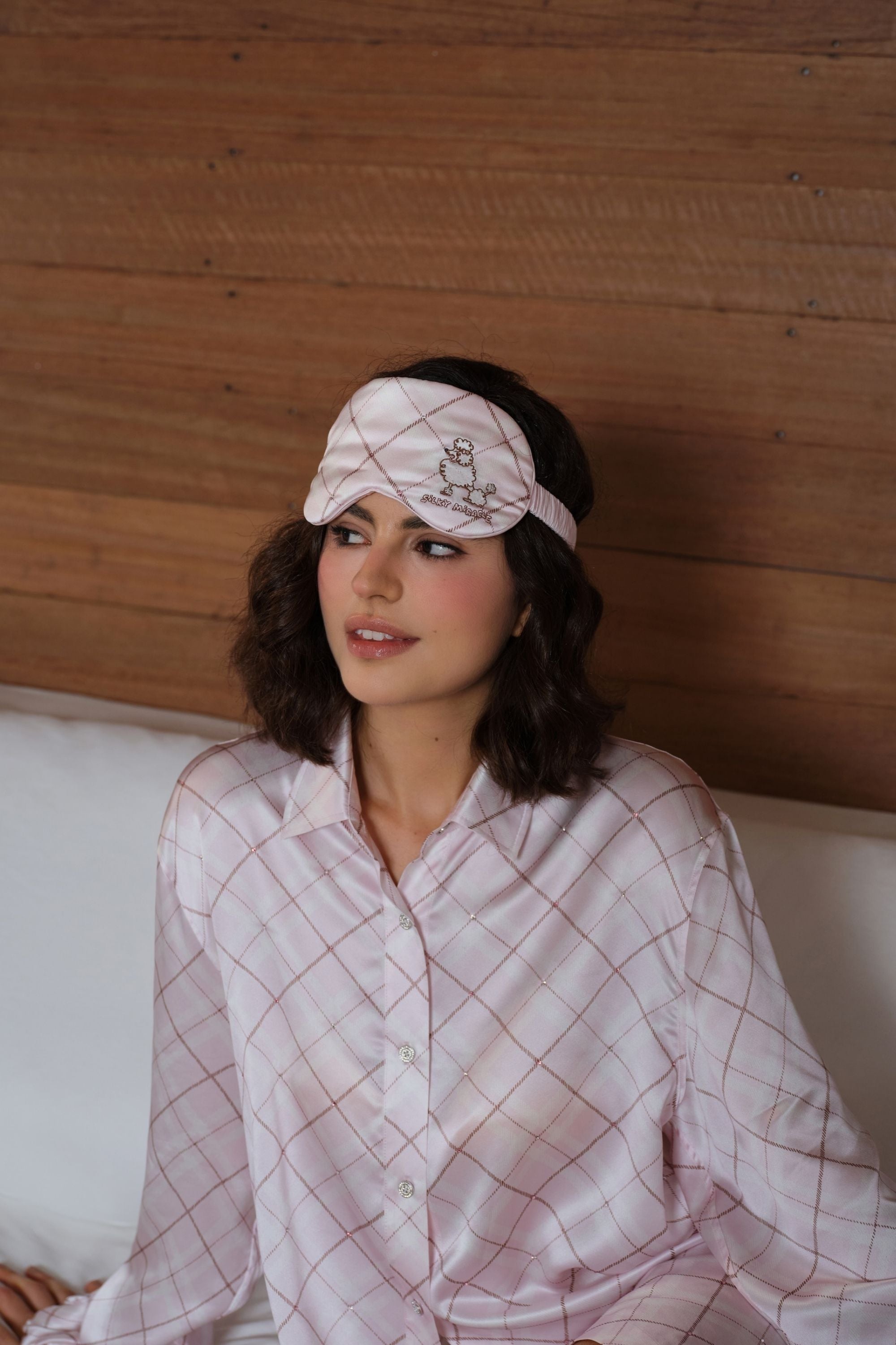 Soft pink check motif adorned with scattered Swarovski crystals for a romantic sparkle. Embroidered Pomeranian adds playful charm, perfectly paired with matching pyjamas for a cozy, relaxed vibe.