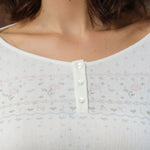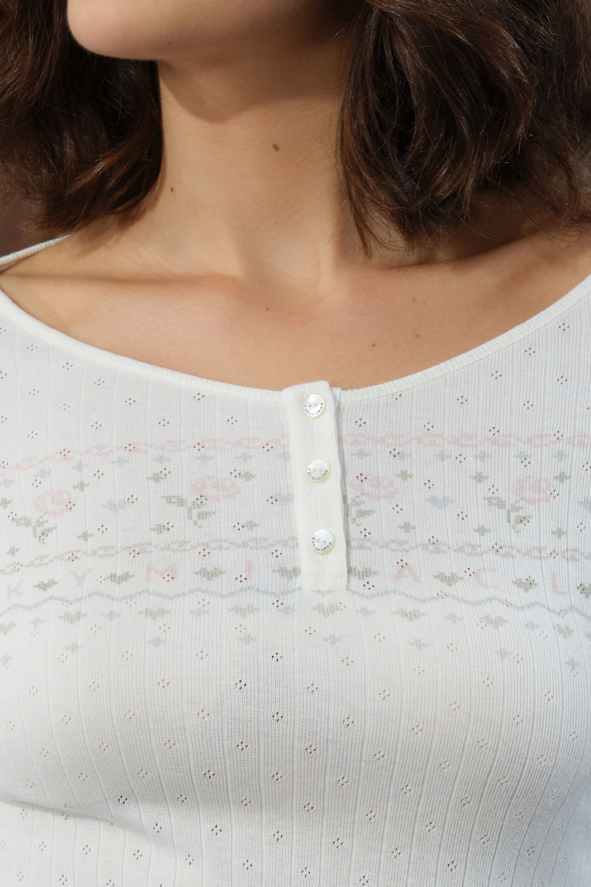 Refined Henry collar with three diamond-set mother-of-pearl buttons, accented by floral motifs on the chest and cuffs. Openwork knit and pink-and-blue Fair Isle patterns create a whimsical, winter-inspired charm.