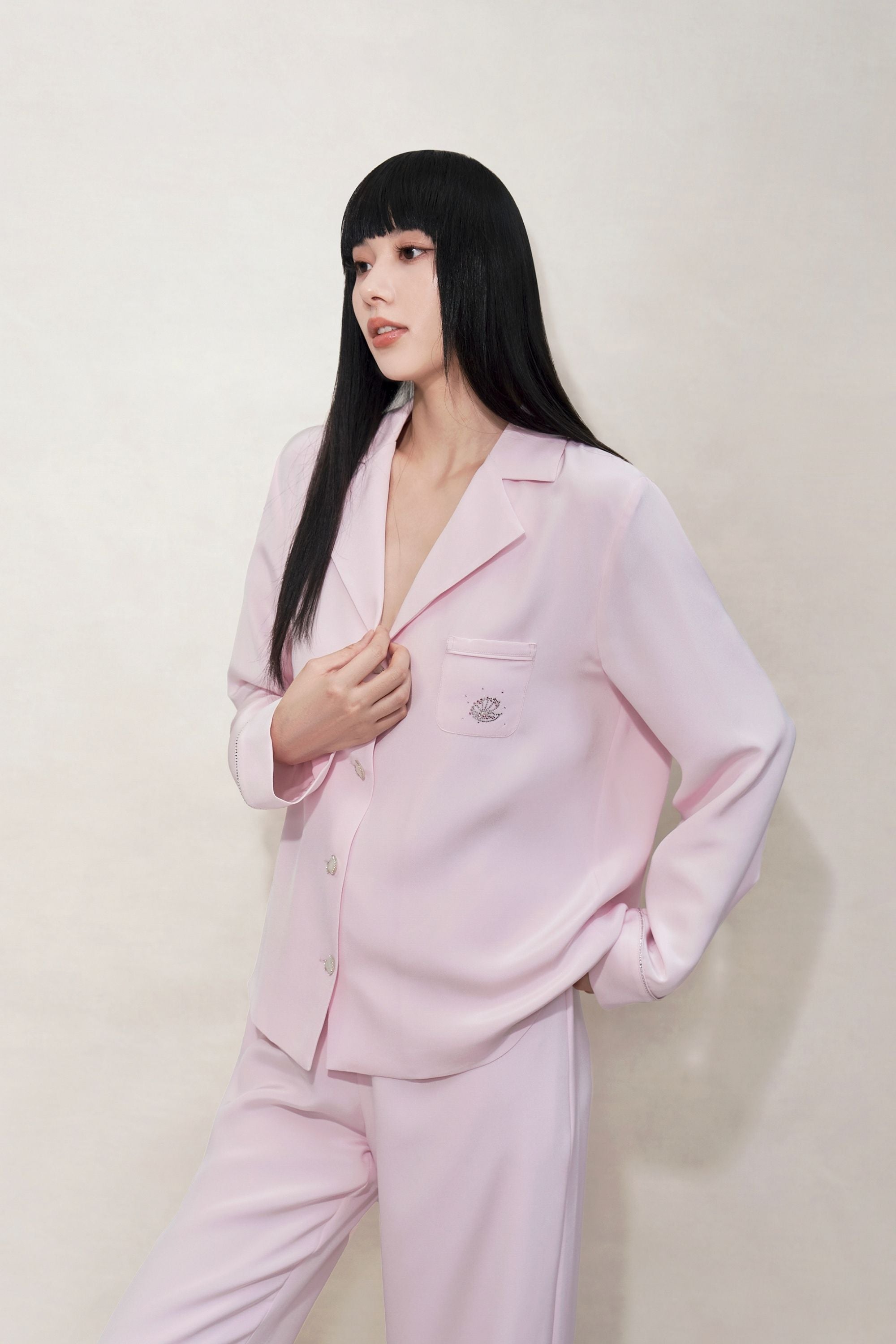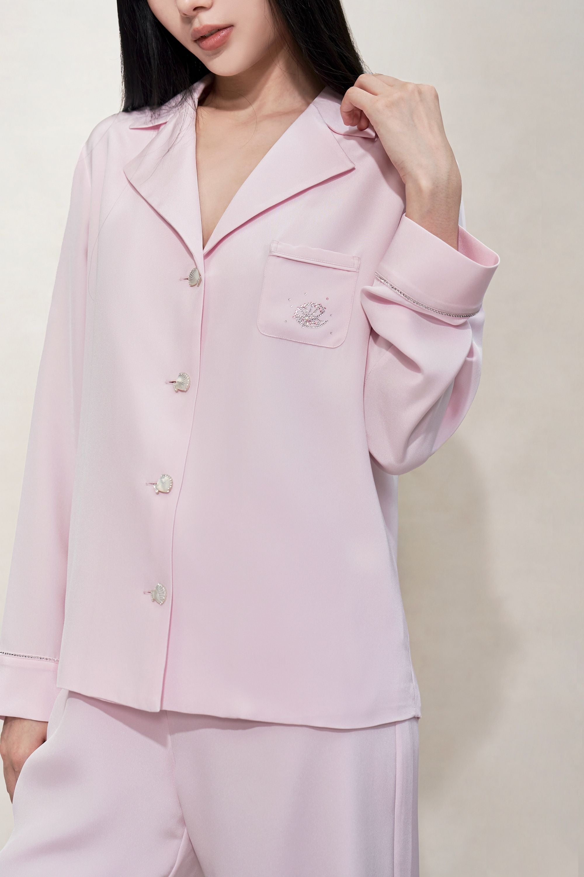 Crafted from a supple crepe silk with a unique matte finish, this garment boasts a thick texture superior to traditional silk. The blouse is bedecked with Swarovski crystals and shell elements, adding an elevated touch. The accompanying, straight-leg trousers provide a slimming look, making this crepe silk set a perfect choice for the colder months.