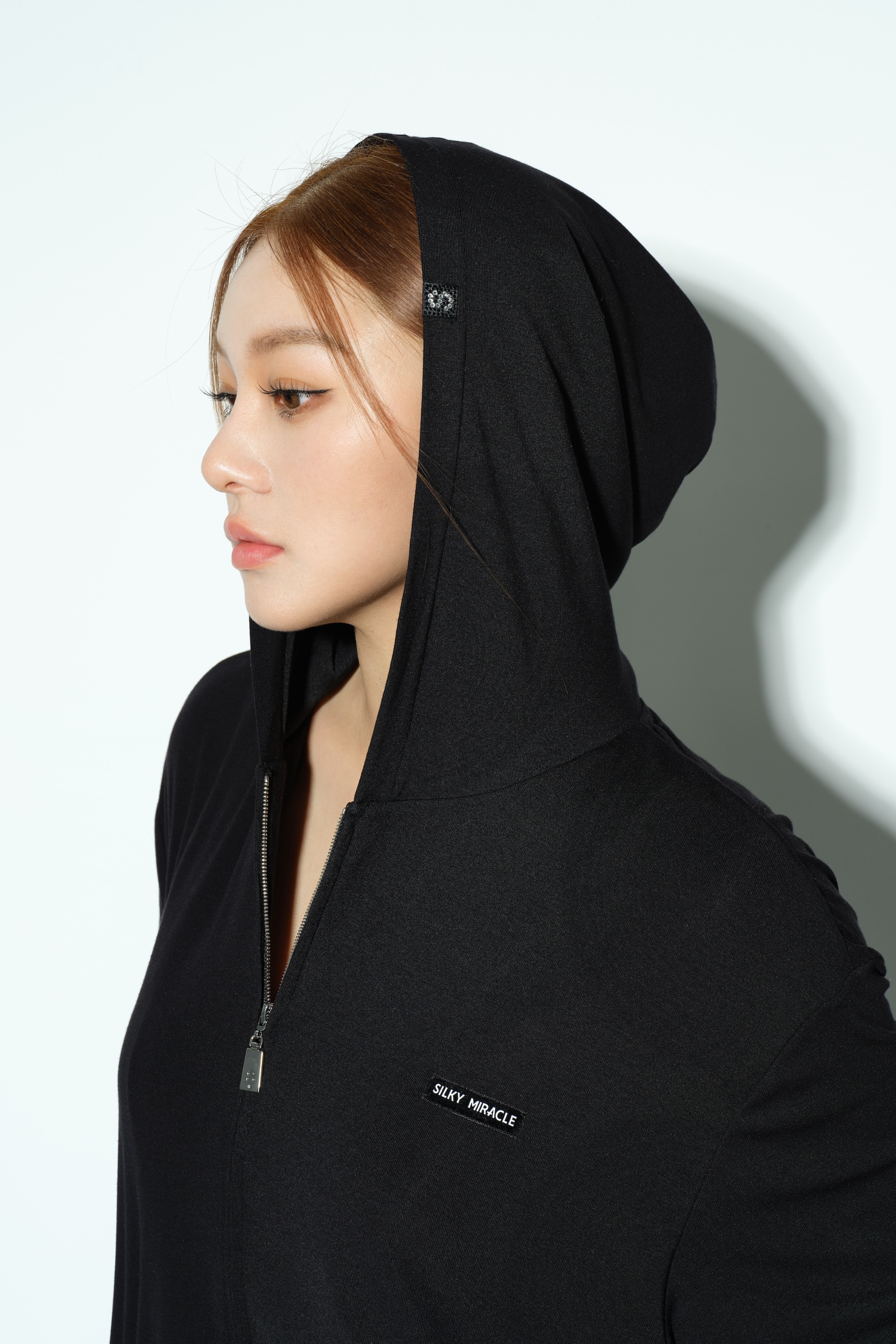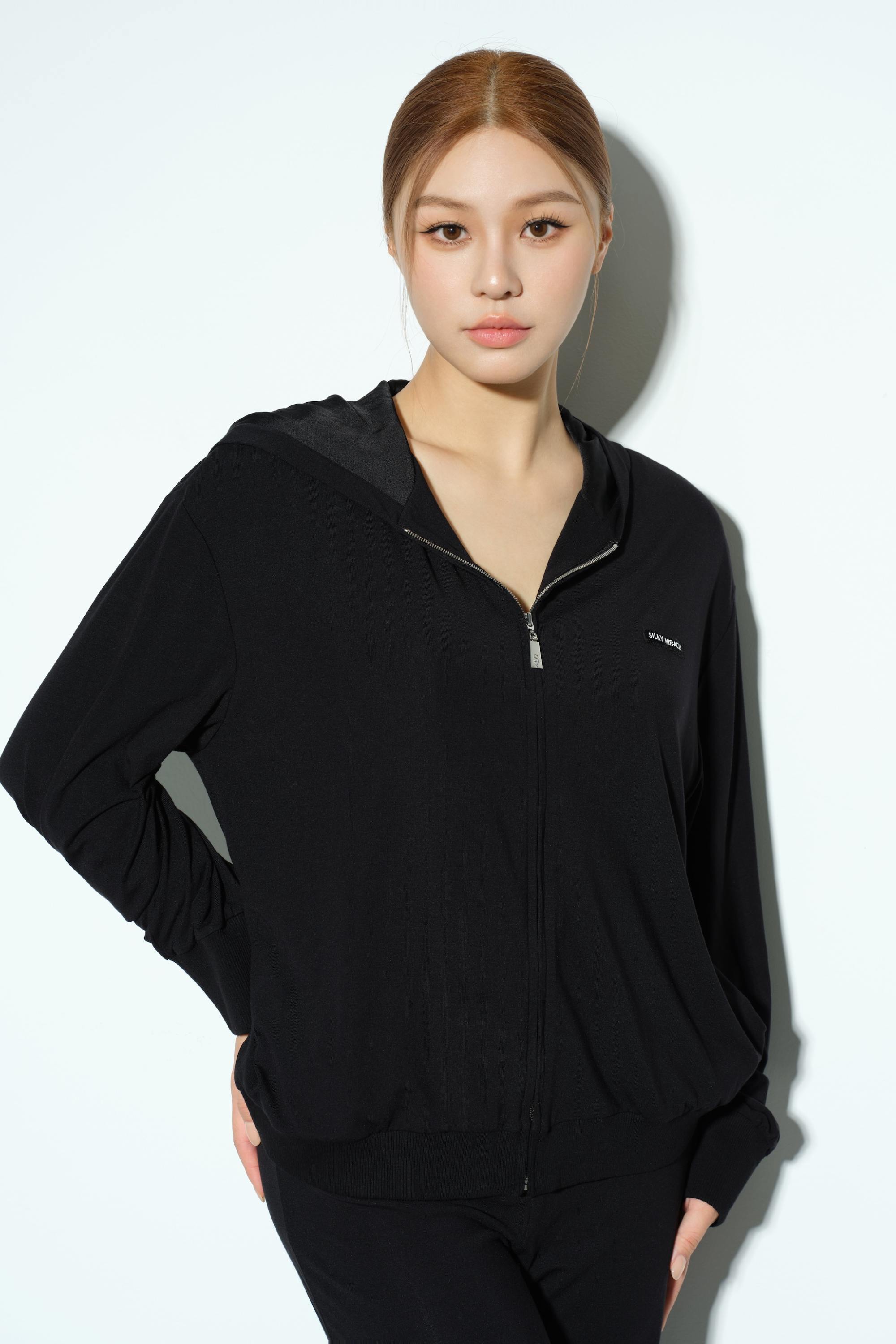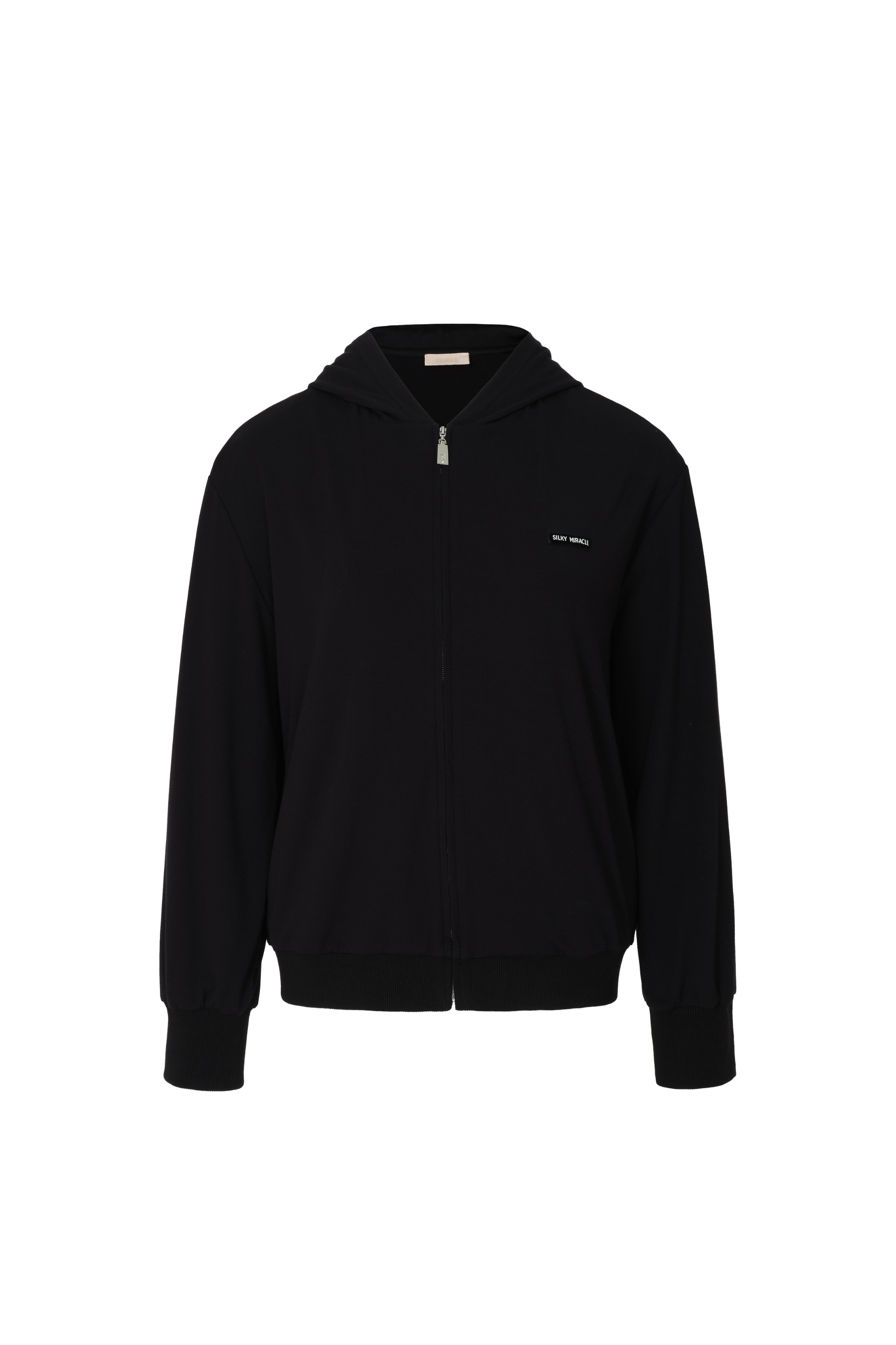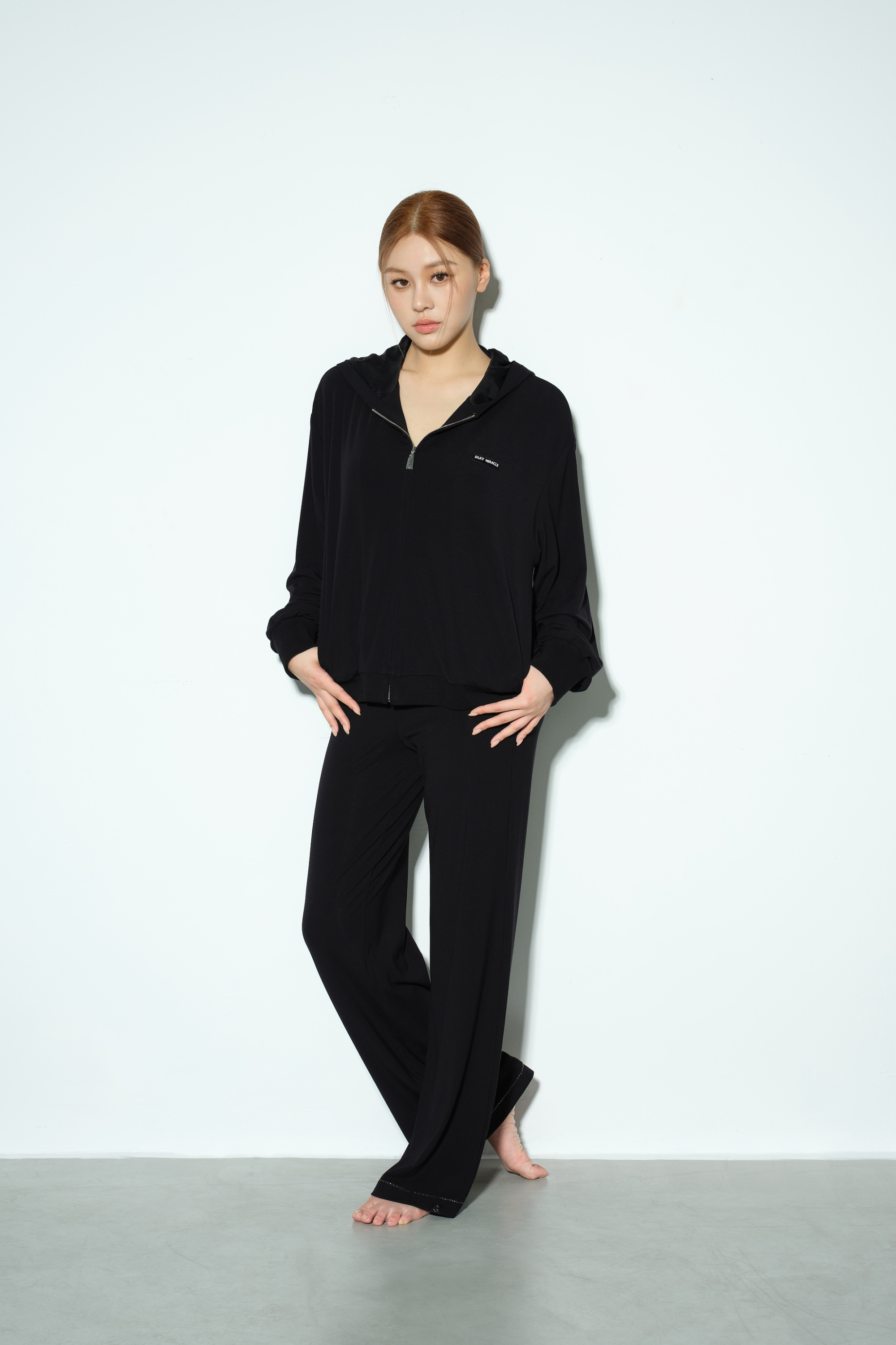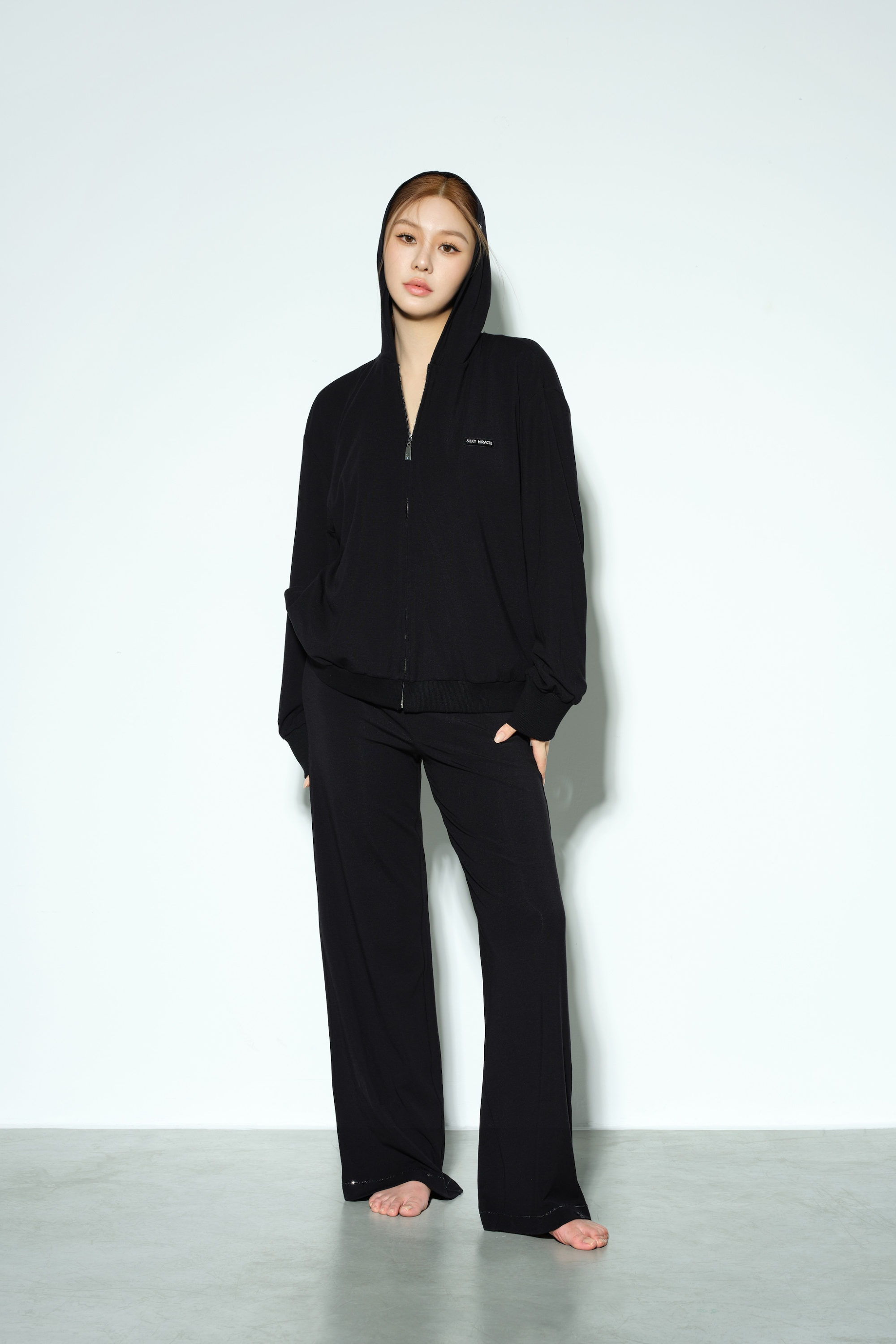 Black zippered hoodie with a relaxed fit for ultimate comfort, adorned with sparkling Swarovski crystals for a touch of effortless, chic home glamour.