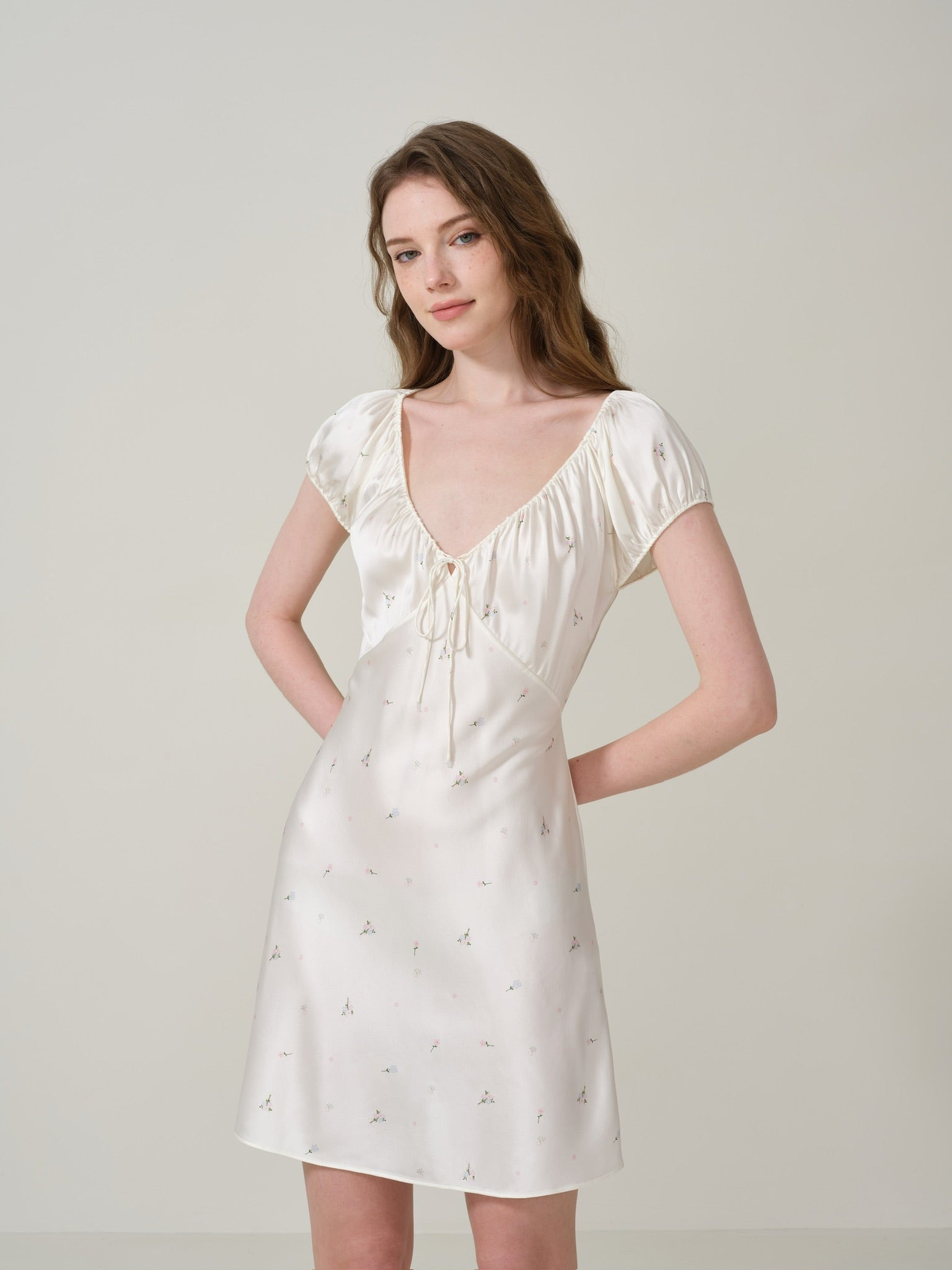 This charming dress features bubble short sleeves and a slight ruffle at the chest, capturing the essence of a French tea break style. With a fresh Southern French floral pattern on a vibrant goose yellow background, delicate crystal flower and leaf embellishments, and an adjustable back waist tie.