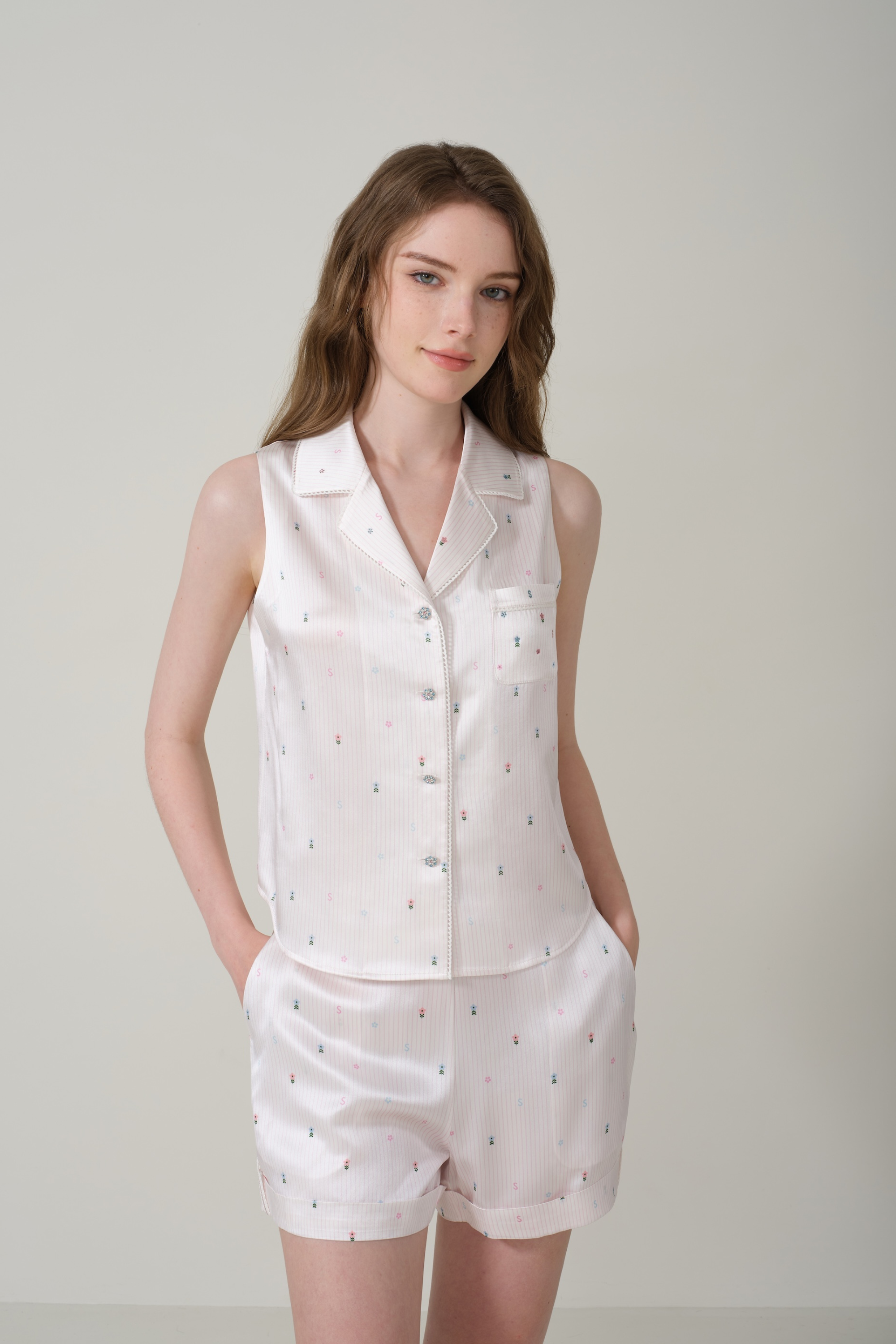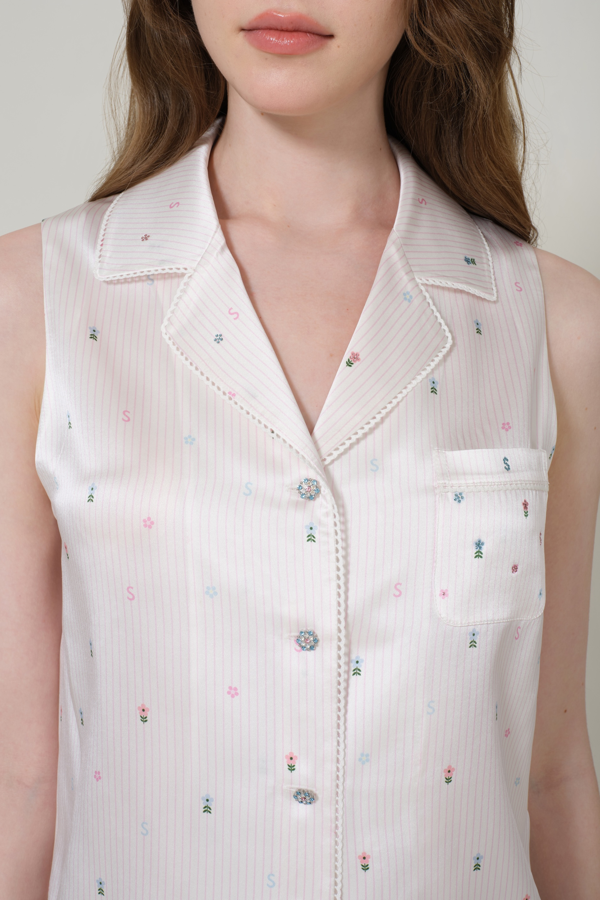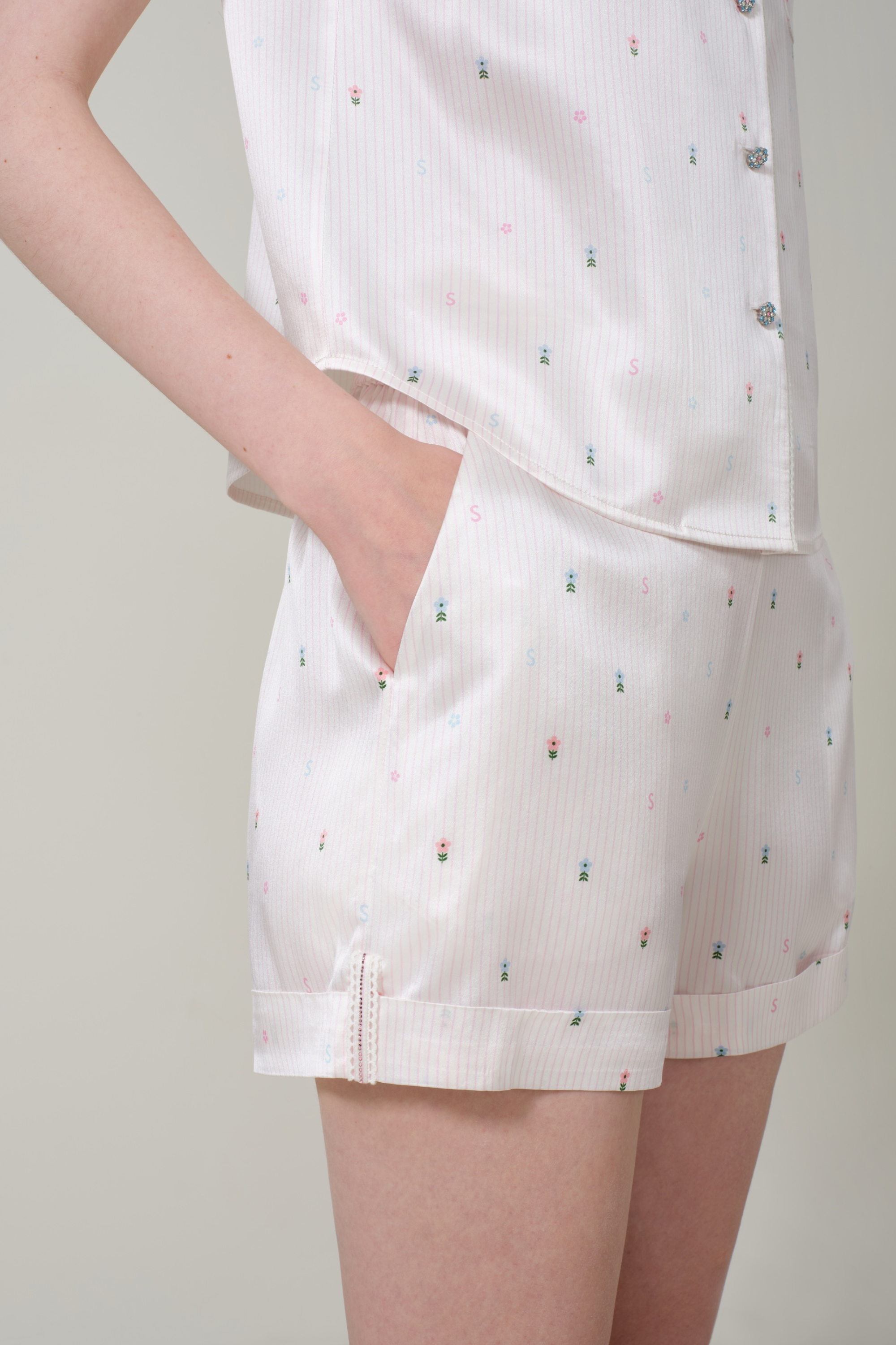This safari-inspired vest and shorts set blends structured style with delicate charm. The floral stripe pattern adds a soft, feminine touch, while the breezy lace detailing enhances its summer-ready appeal. Thoughtfully placed crystals and lace accents on the chest pockets and shorts tabs offer subtle elegance, while colorful flower-shaped glazed buttons add a playful finishing touch. A perfect balance of sweet and cool, this set is ideal for effortless warm-weather styling.