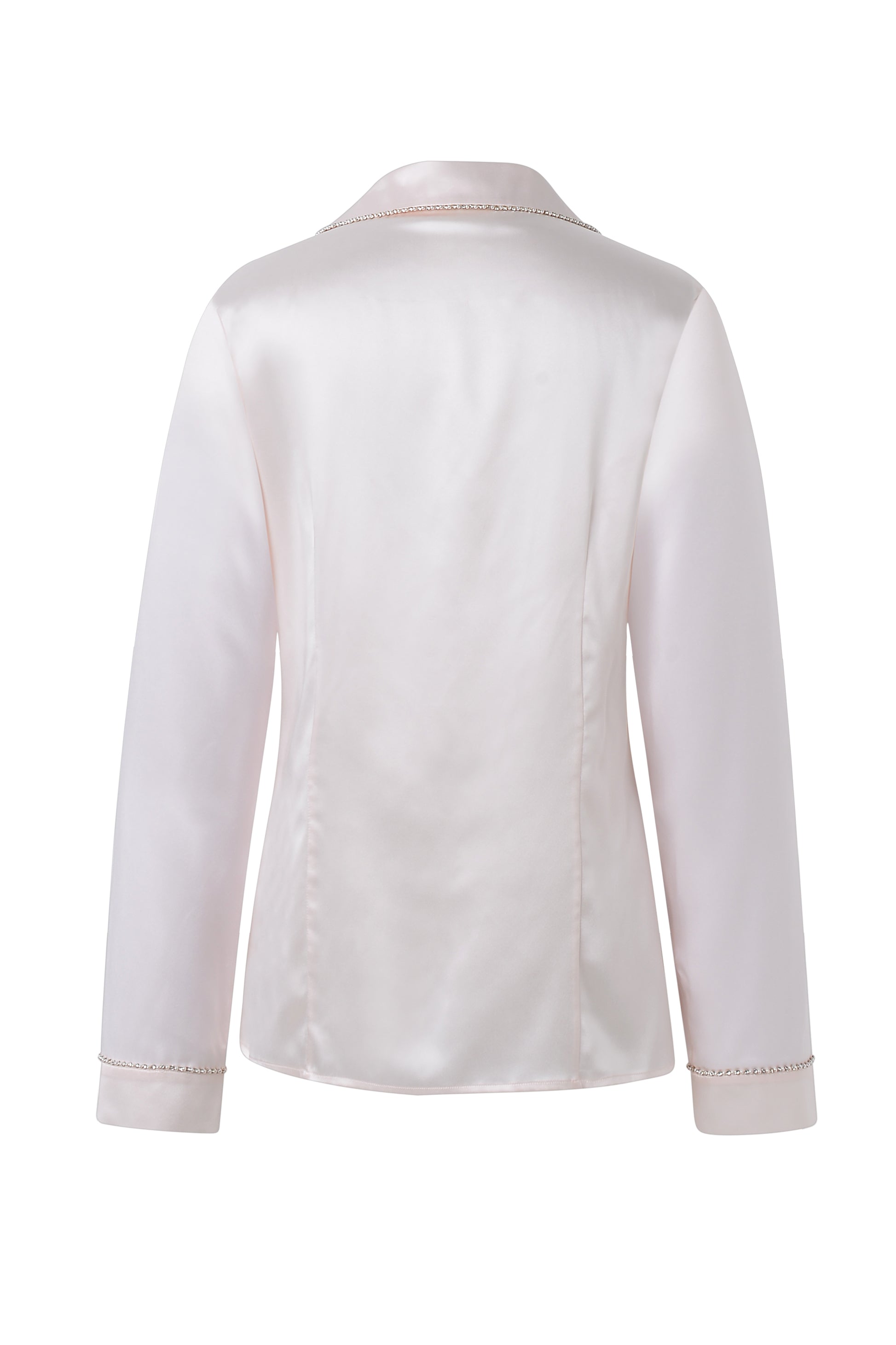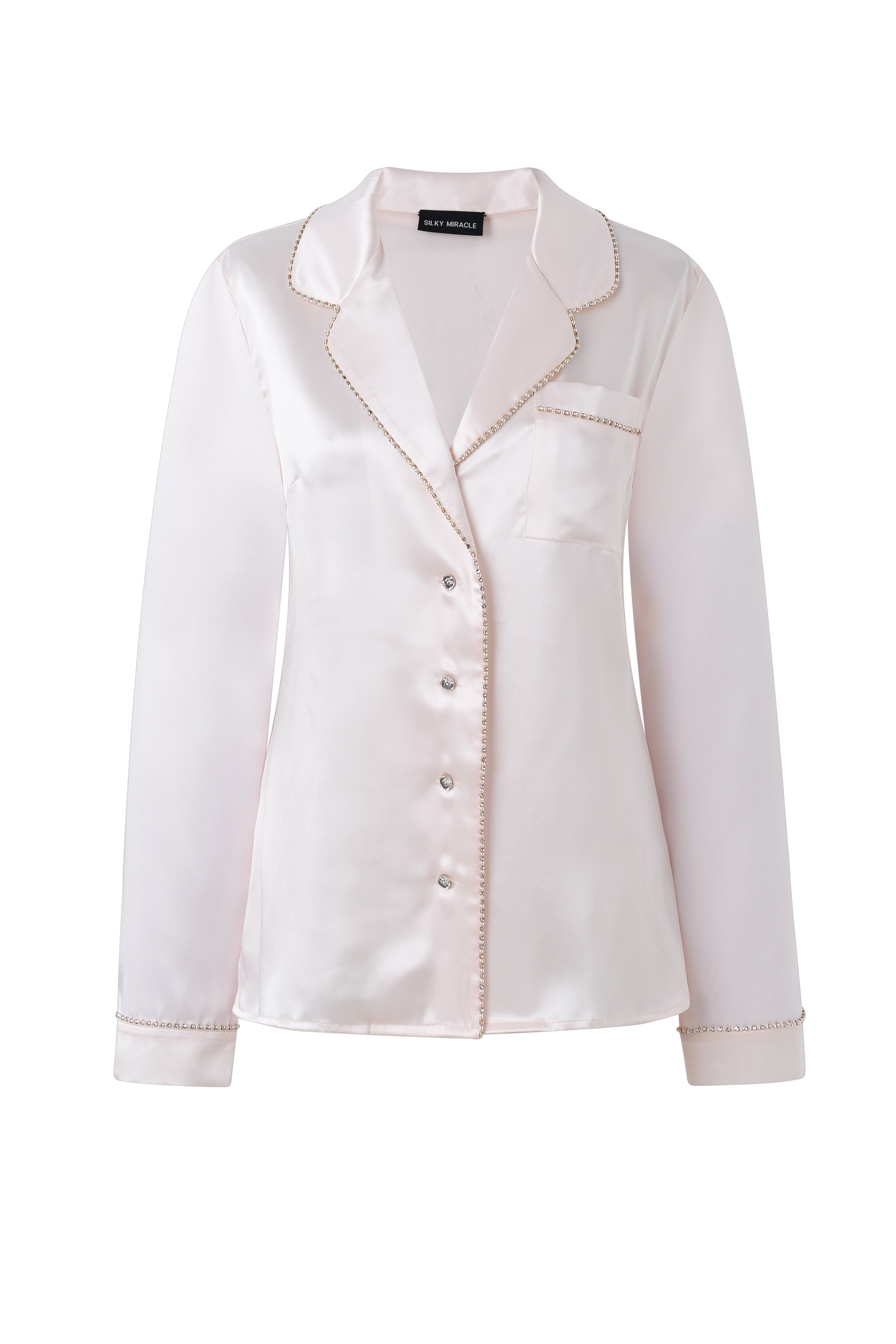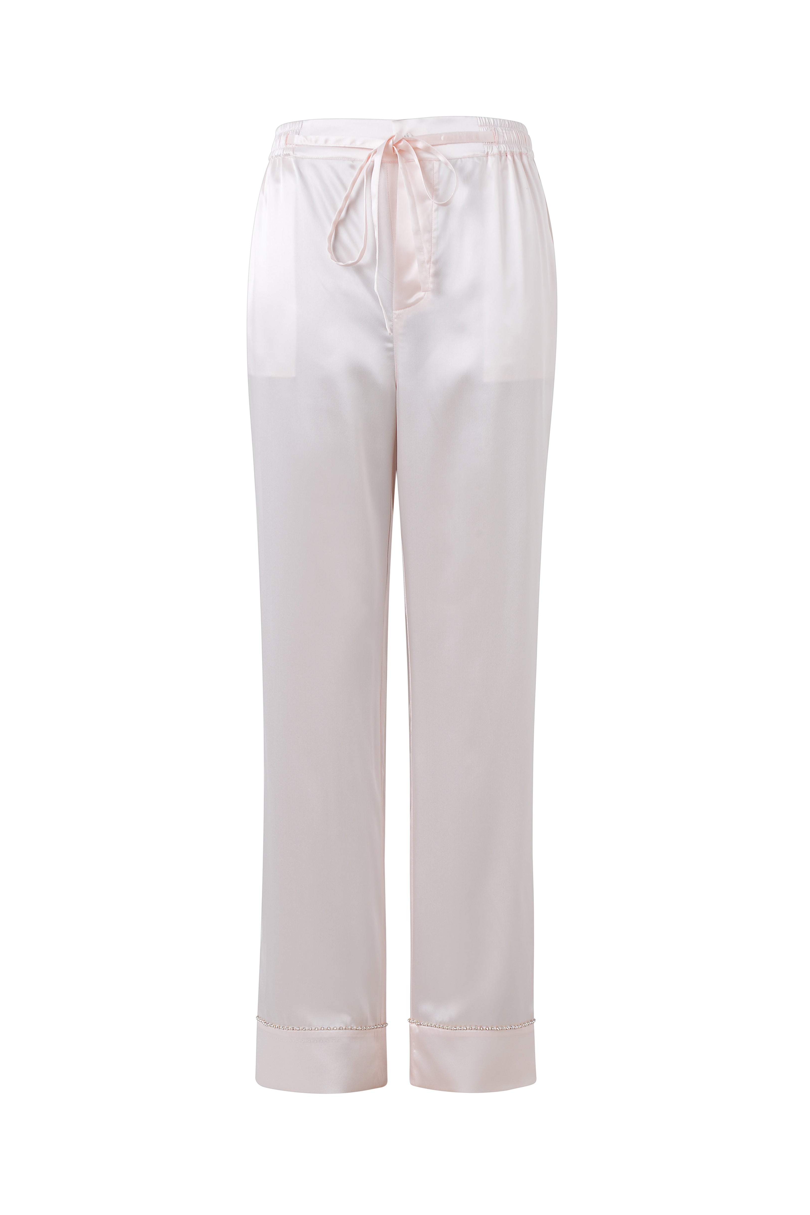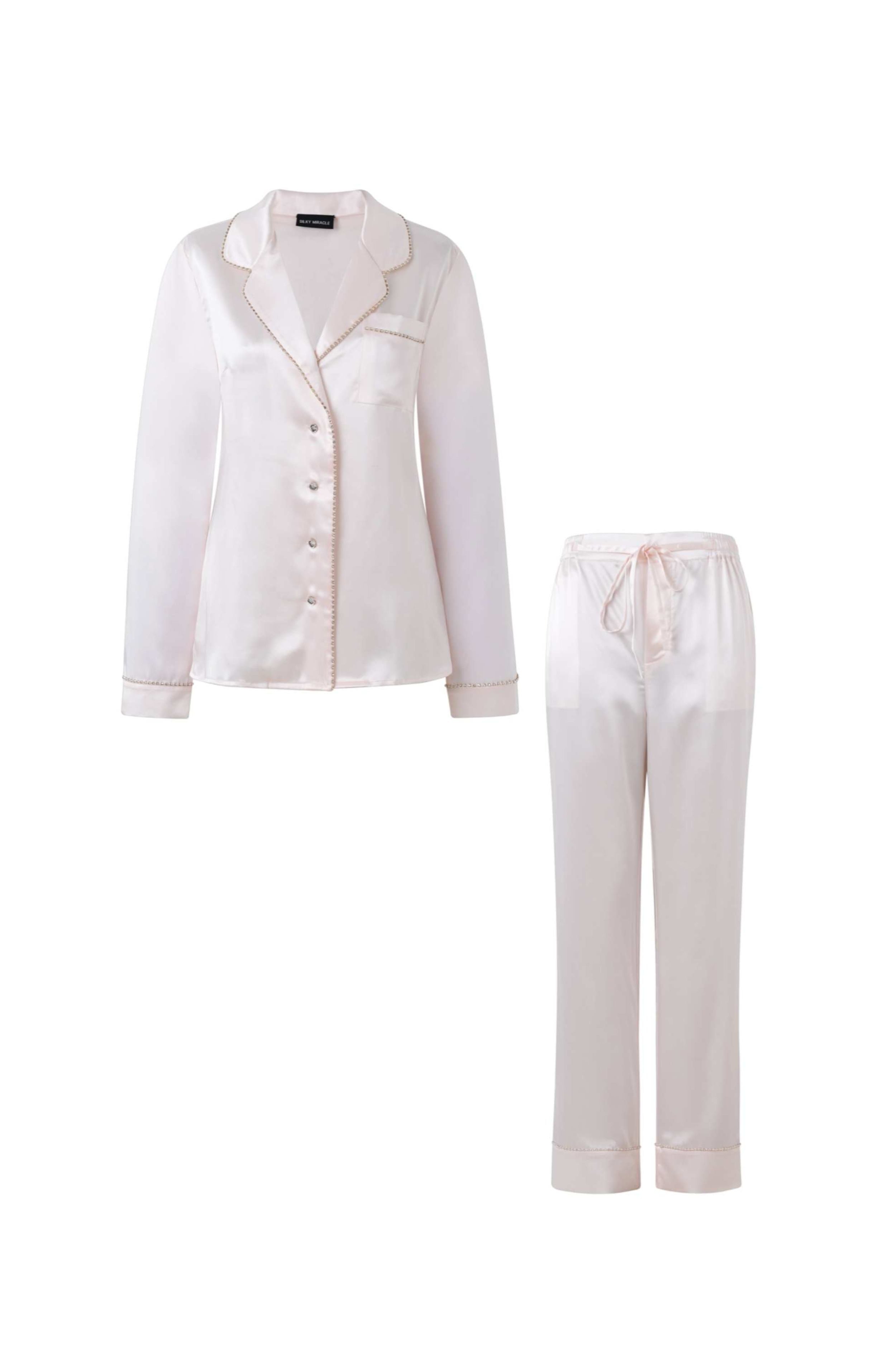 The Pearl & Crystal Pink Silk Pyjama Set is cut from an unbeatably glossy silk and detailed with an intricately hand sewn pearl and Swarovski crystal piping. The slim fitting allows for ultimate comfort and the trousers feature a drawstring waist.
