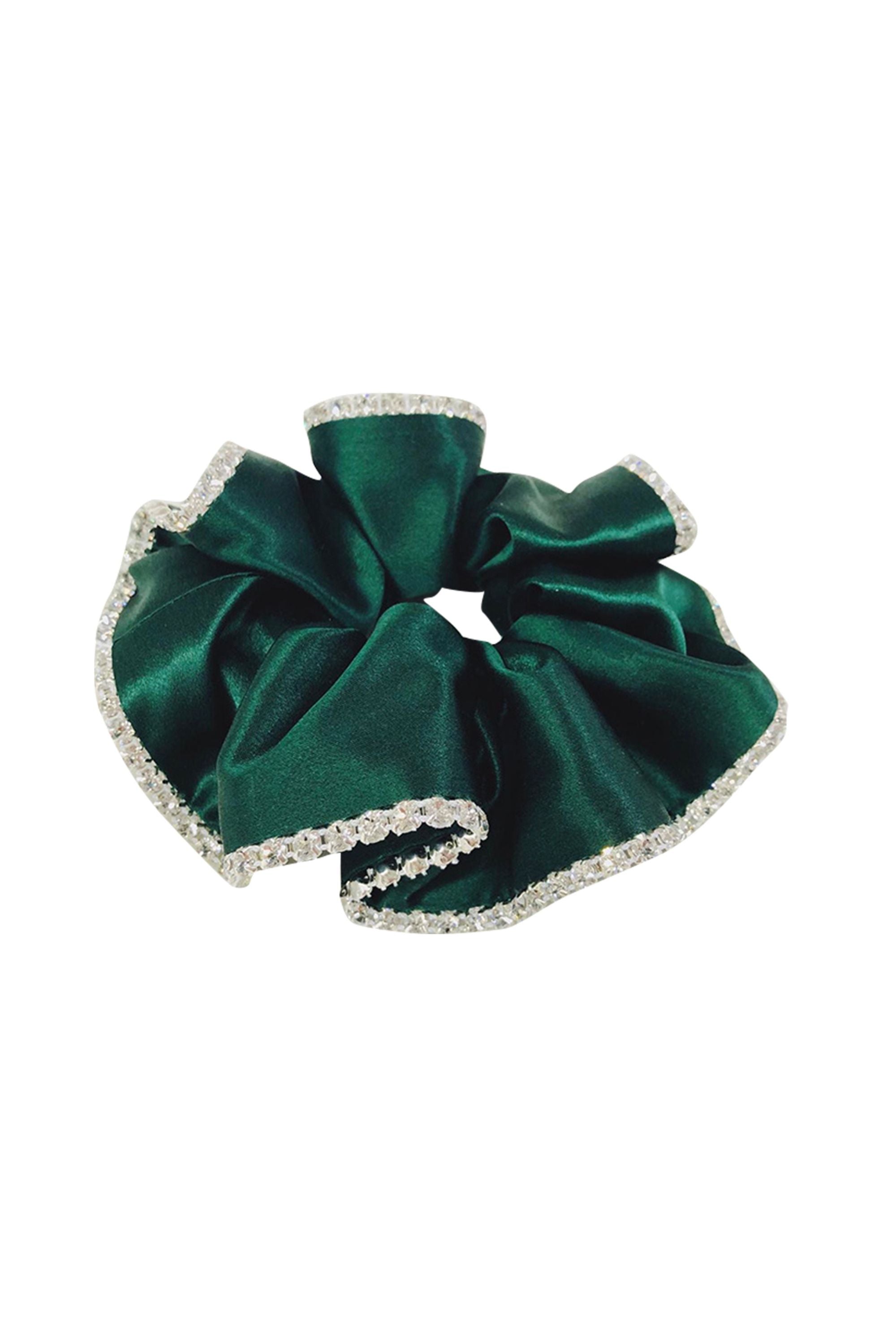 The Emerald Green Scrunchie is cut from a high shine Mulberry Silk and detailed with a Swarovski crystal trim.
