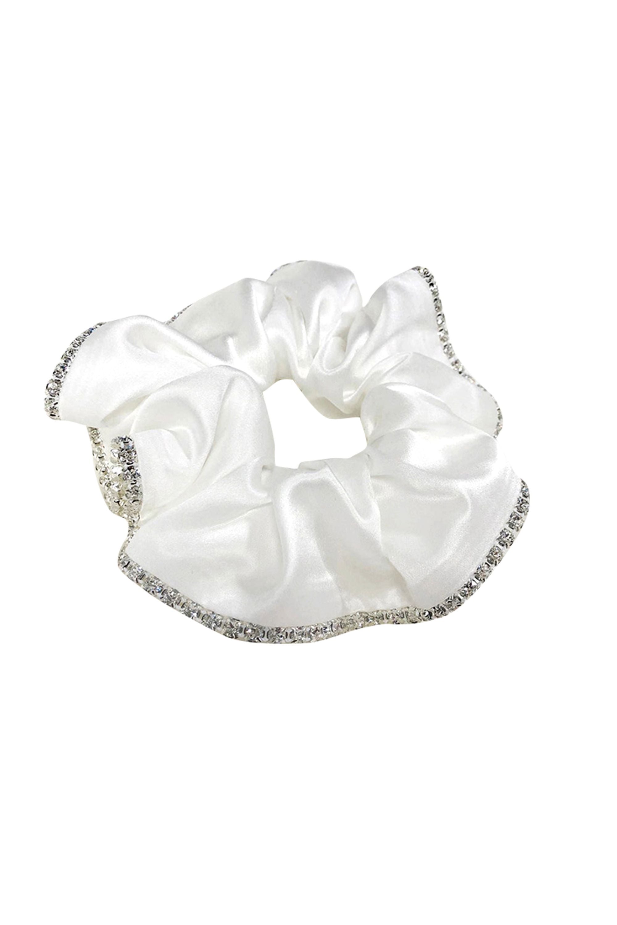 The Pearl White Scrunchie is cut from a high shine Mulberry Silk and detailed with a Swarovski crystal trim.