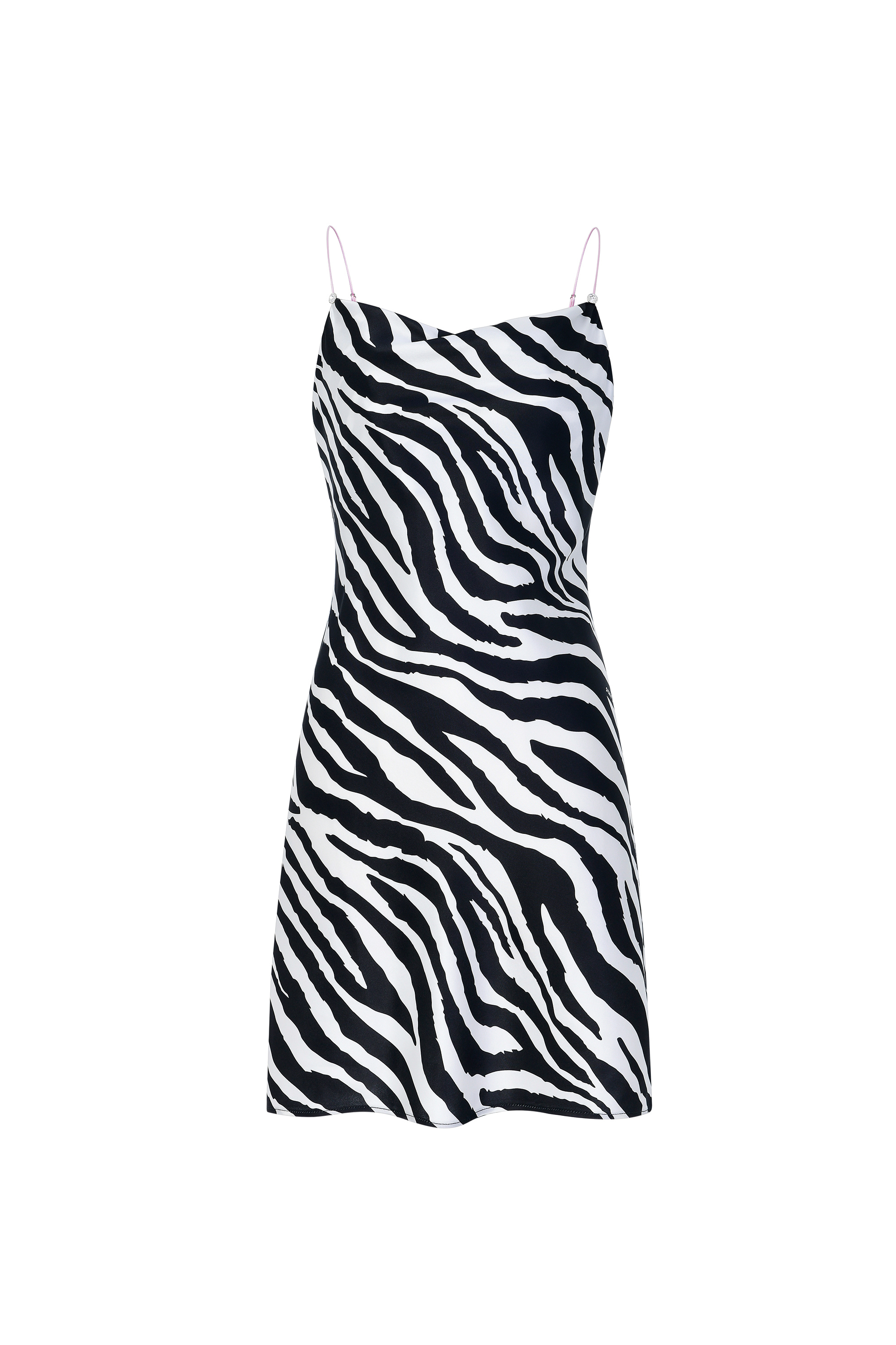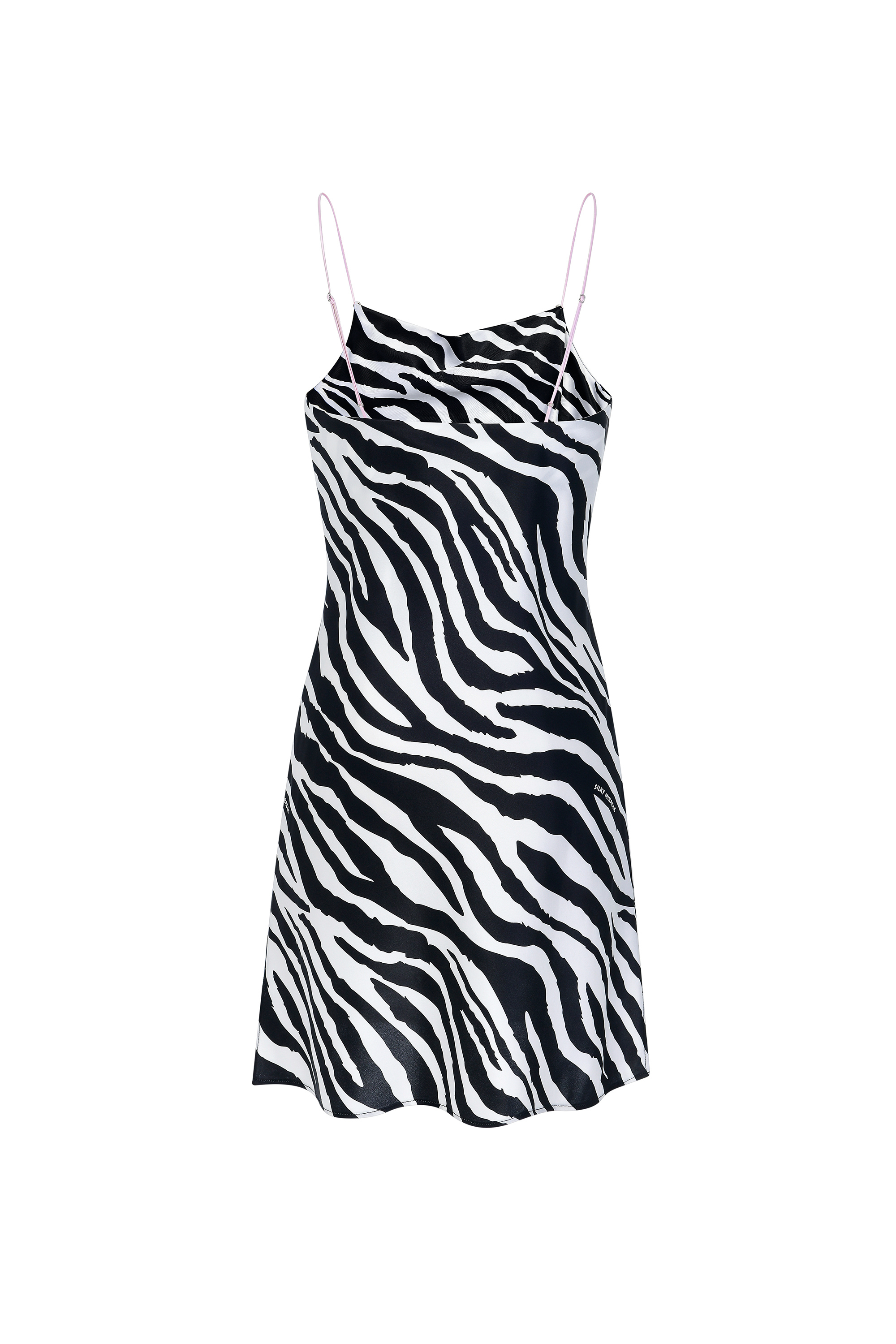 The Zebra Print Silk Slip Mini Dress provides a relaxed slim fit and a mini slip cut. Elevated with a supple feminine gathered bust and a striking silk zebra print.