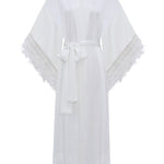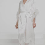 Hand crafted from premium mulberry silk, the White Feather Silk Kimono Robe is detailed with soft feathered sleeves and an effortless lace hem finish.