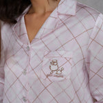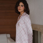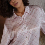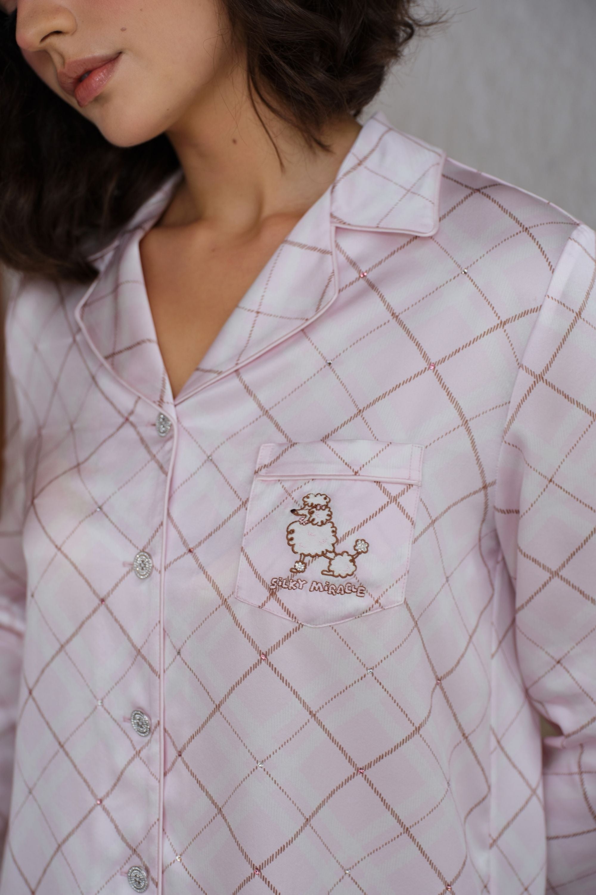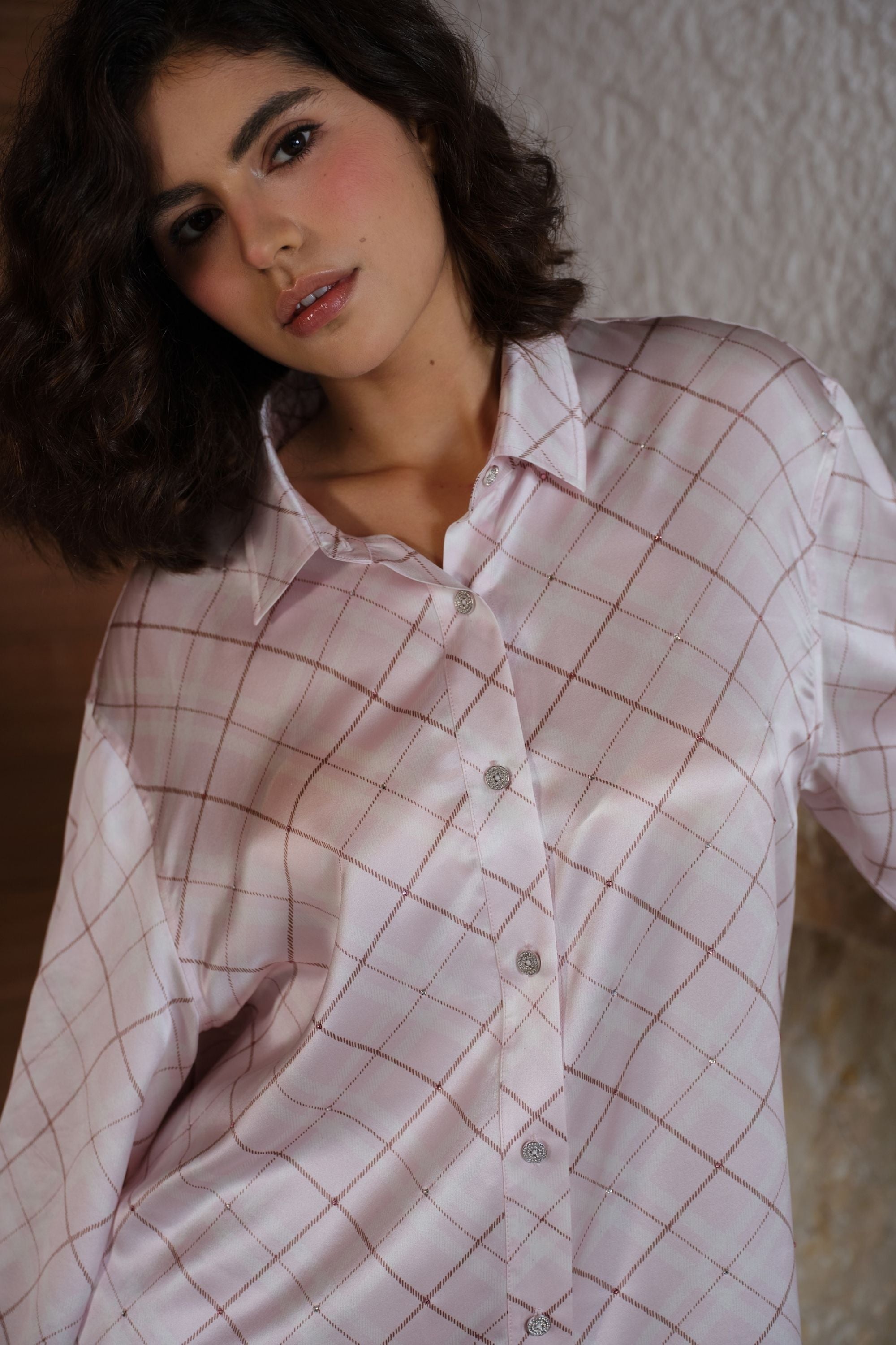 Boyfriend-style oversized shirt. Features full-diamond metal chest fastening with scattered diamond accents across the check pattern for a sparkling, eye-catching effect. Logo embroidery at the cuffs adds a subtle finishing touch.