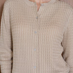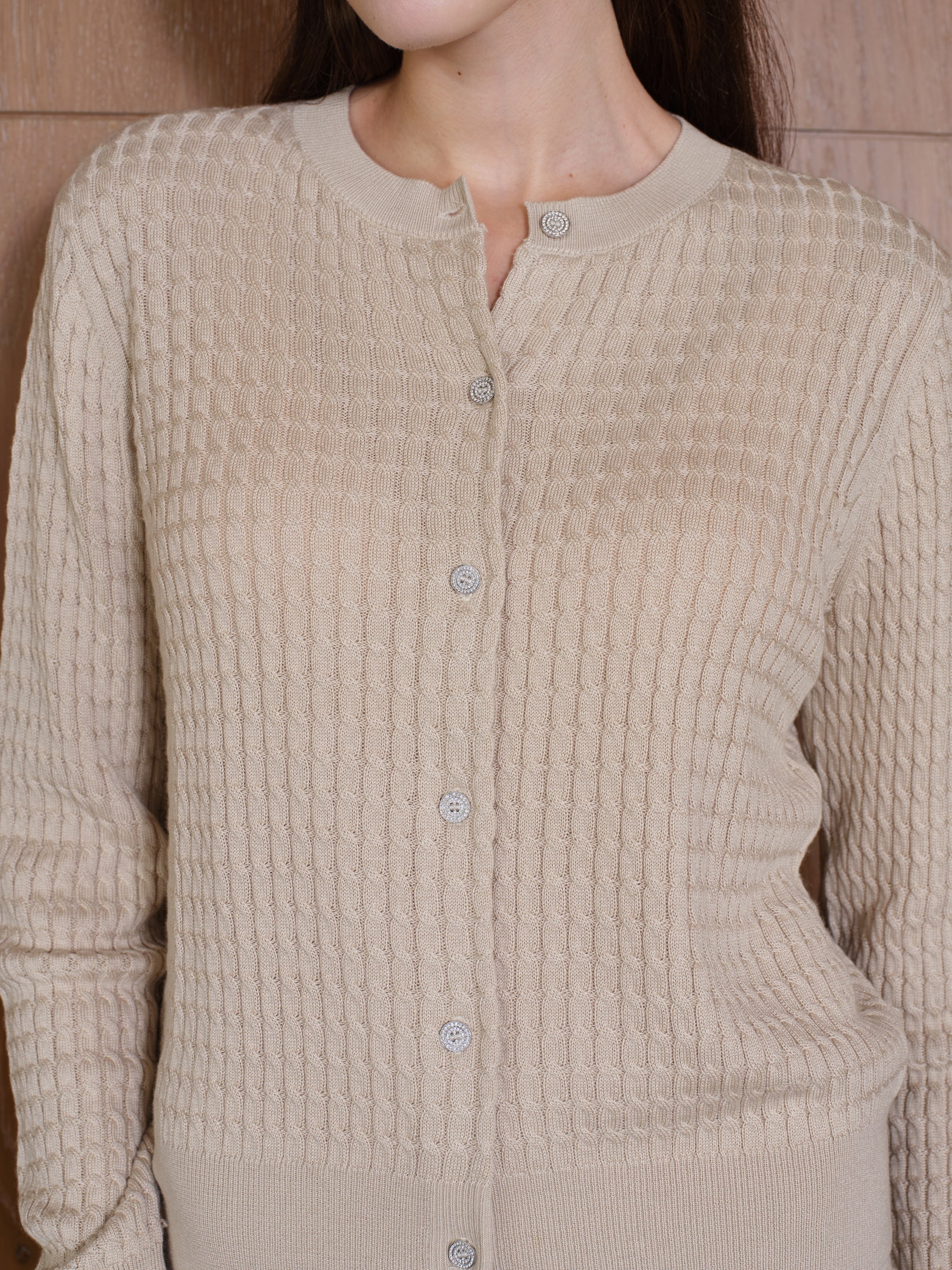 A classic crew-neck cardigan designed as an autumn–winter loungewear essential. Presented in an elegant sandstone beige, it exudes a refined, understated charm. The delicate mini cable-knit texture is accented with crystal-embellished metallic buttons, adding a subtle sparkle to elevate the entire look.