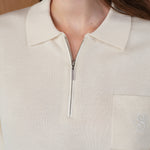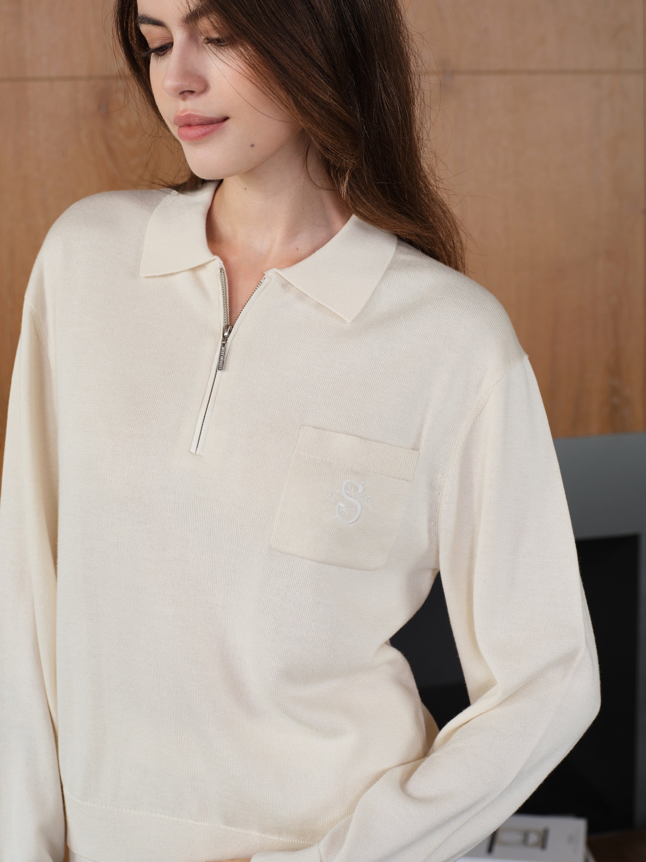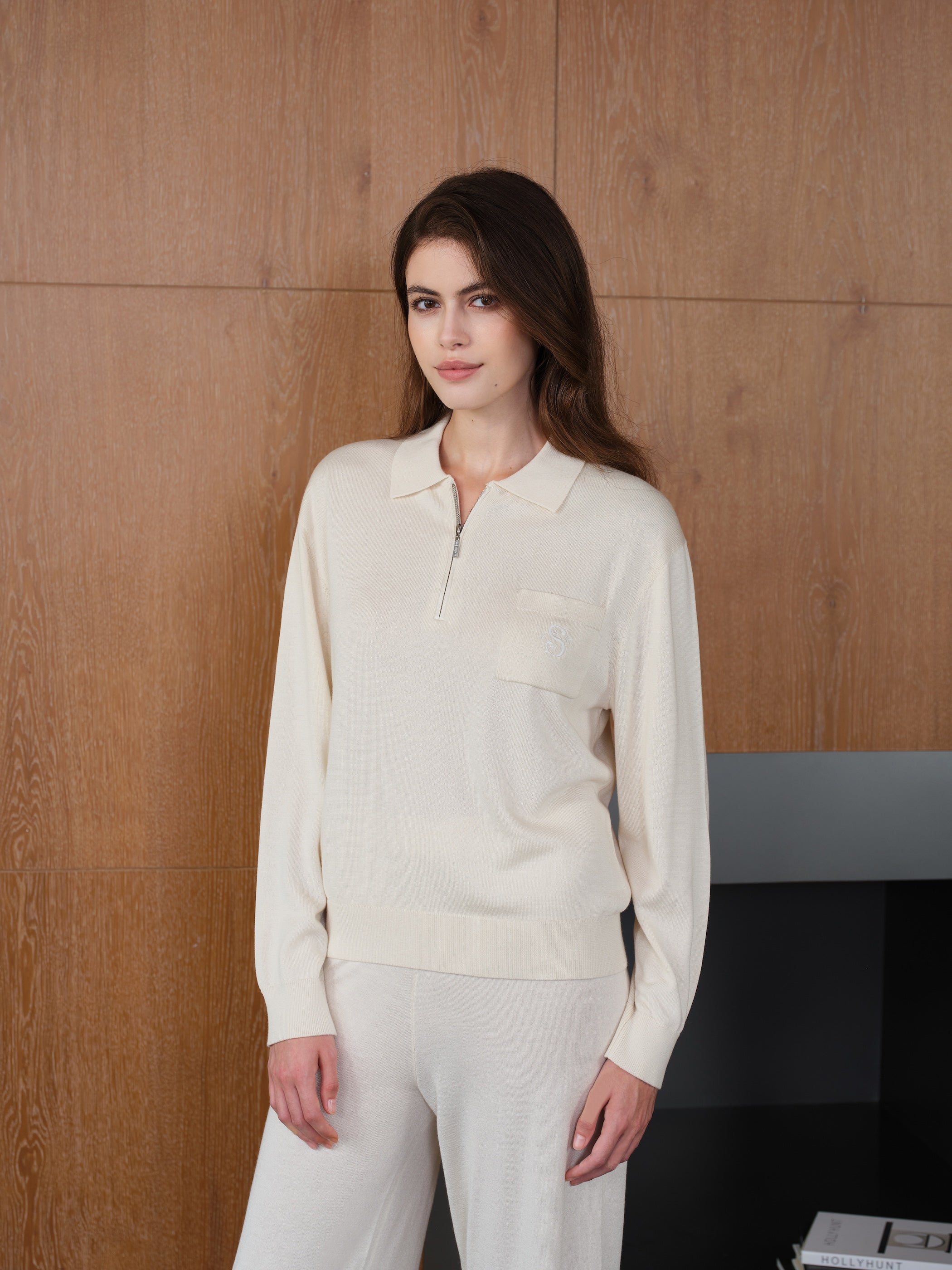 Crafted in a smooth cashmere-silk plain knit, this collared zip-up design balances delicacy with quiet strength. Fine silk panels accent the zipper for a subtle contrast, while the British-style embroidered logo on the chest adds an elegant, timeless finish.