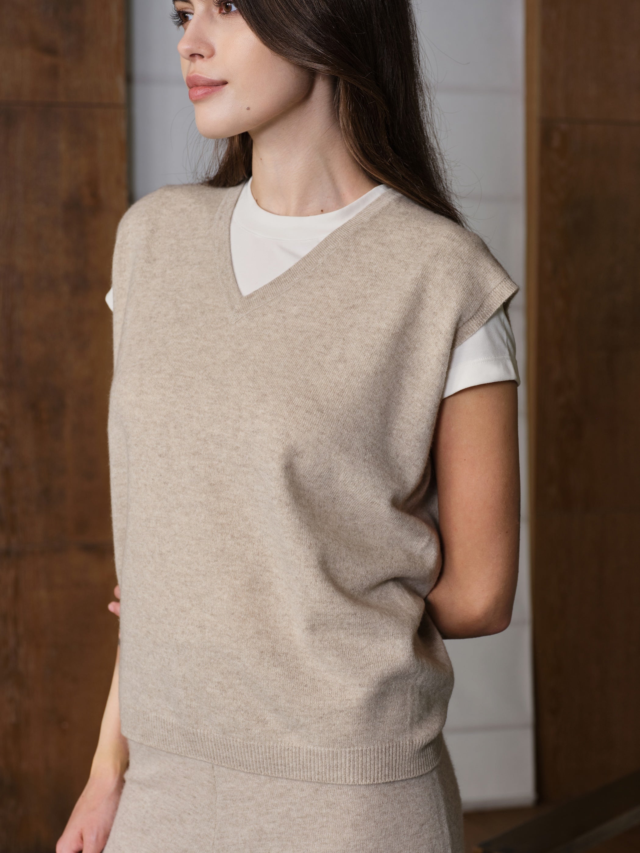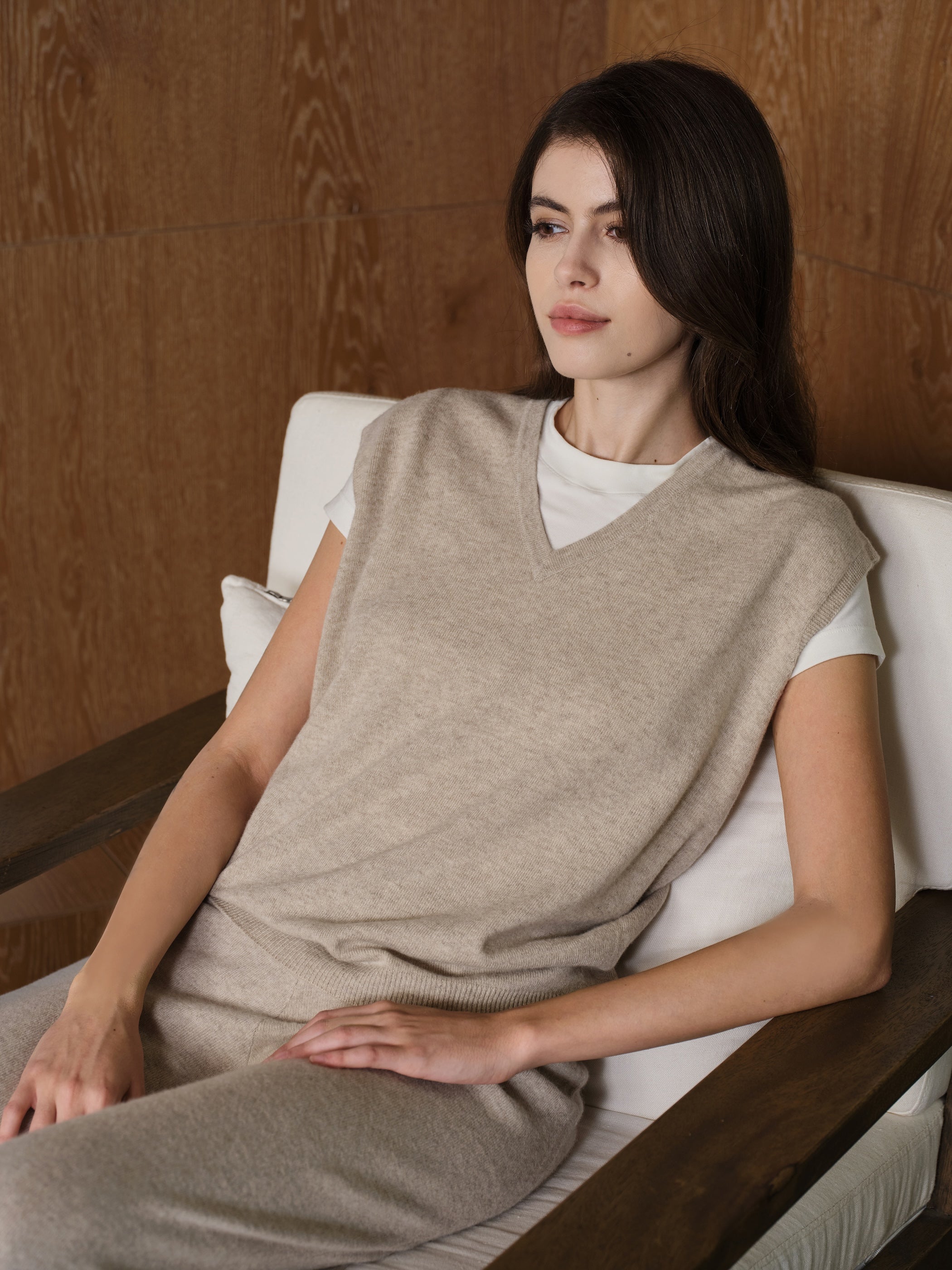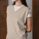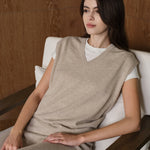 Loose V-neck cashmere knit waistcoat, an essential layering piece. Minimalist design paired with a sharp, sophisticated silhouette exudes refined elegance.