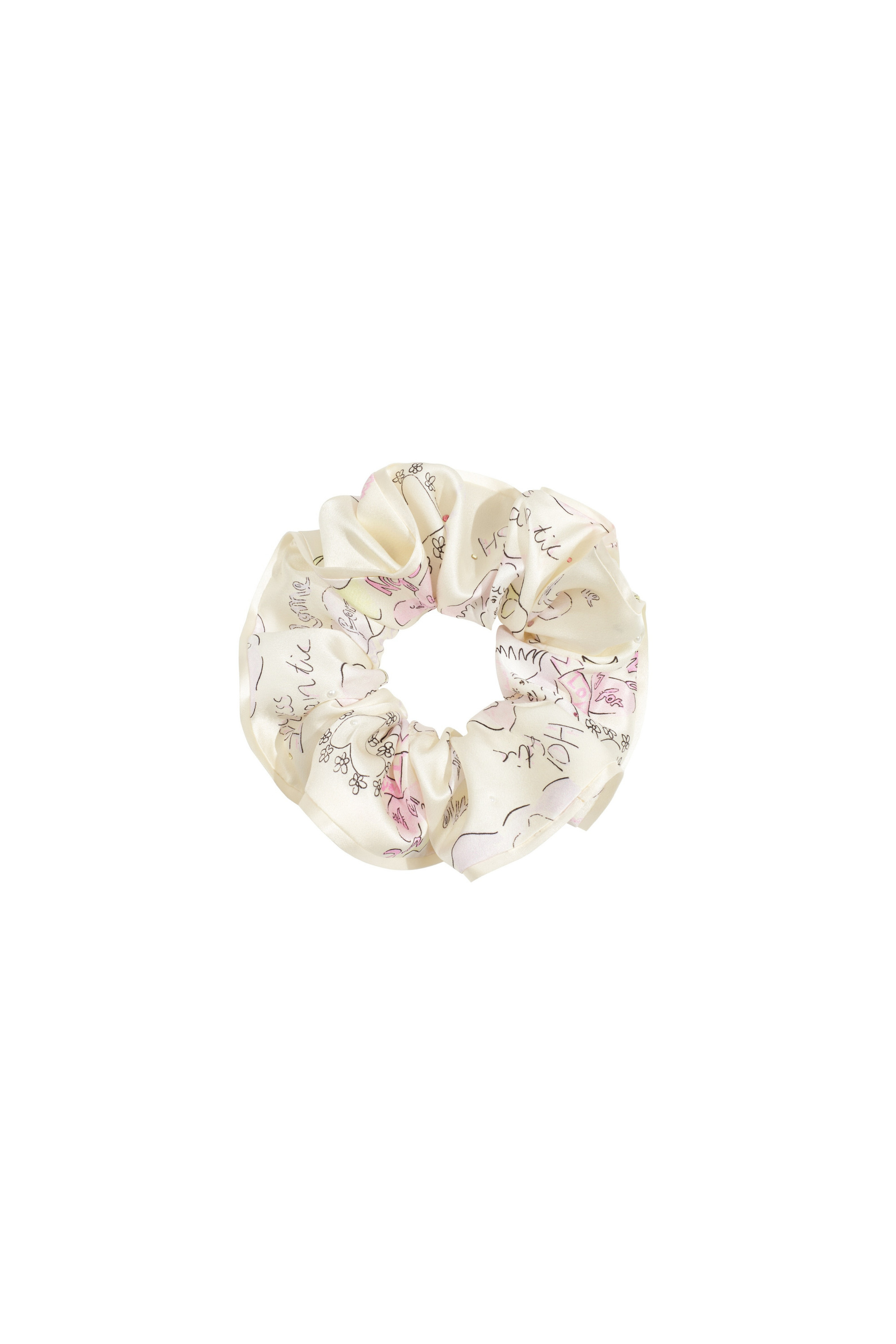This silk hair accessory features a hand-drawn, graffiti-style Little Angel print, embellished on both sides with colourful Swarovski crystals for a subtle sparkle. Finished with tonal pale-yellow piping around the edges, it delivers a playful yet polished look.