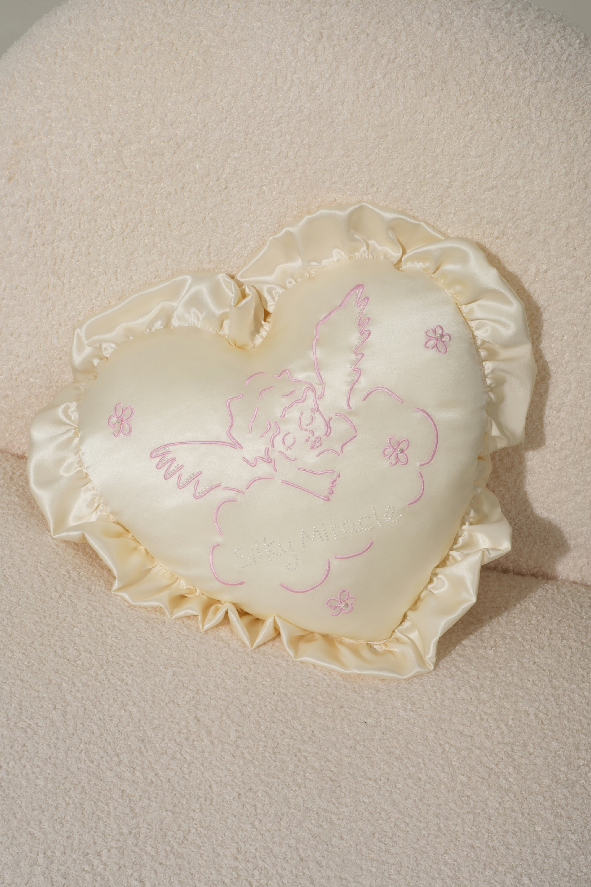 Double-layered silk ruffles add a sweet, Valentine’s-inspired charm, while delicate light-pink angel line embroidery showcases intricate craftsmanship. Swarovski pearls embellish Cupid’s wings and eyelashes, highlighting elegant details throughout. A fully pearl-embellished logo enhances brand recognition, with each five-petal floral centre pearl meticulously hand-stitched for a refined finish.