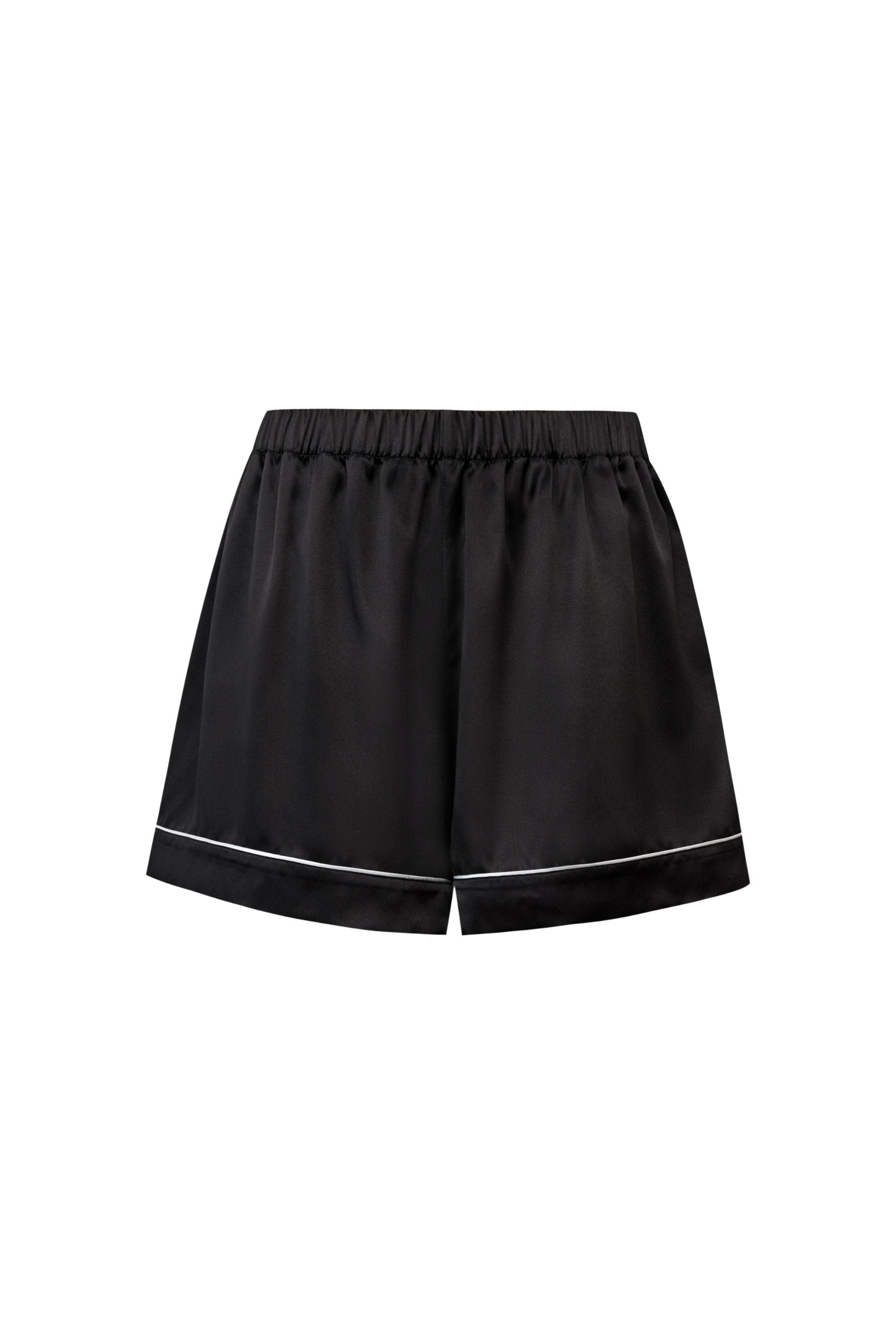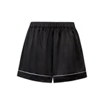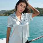 Featuring a classic retro small lapel collar and button-front design, this short pyjama set combines contrasting colours across the top and shorts, finished with clean contrast piping and a subtle embroidered logo on the pocket. Retaining the elegance of traditional women’s sleepwear while embracing a modern minimalist aesthetic, it offers a relaxed update for everyday lounging.