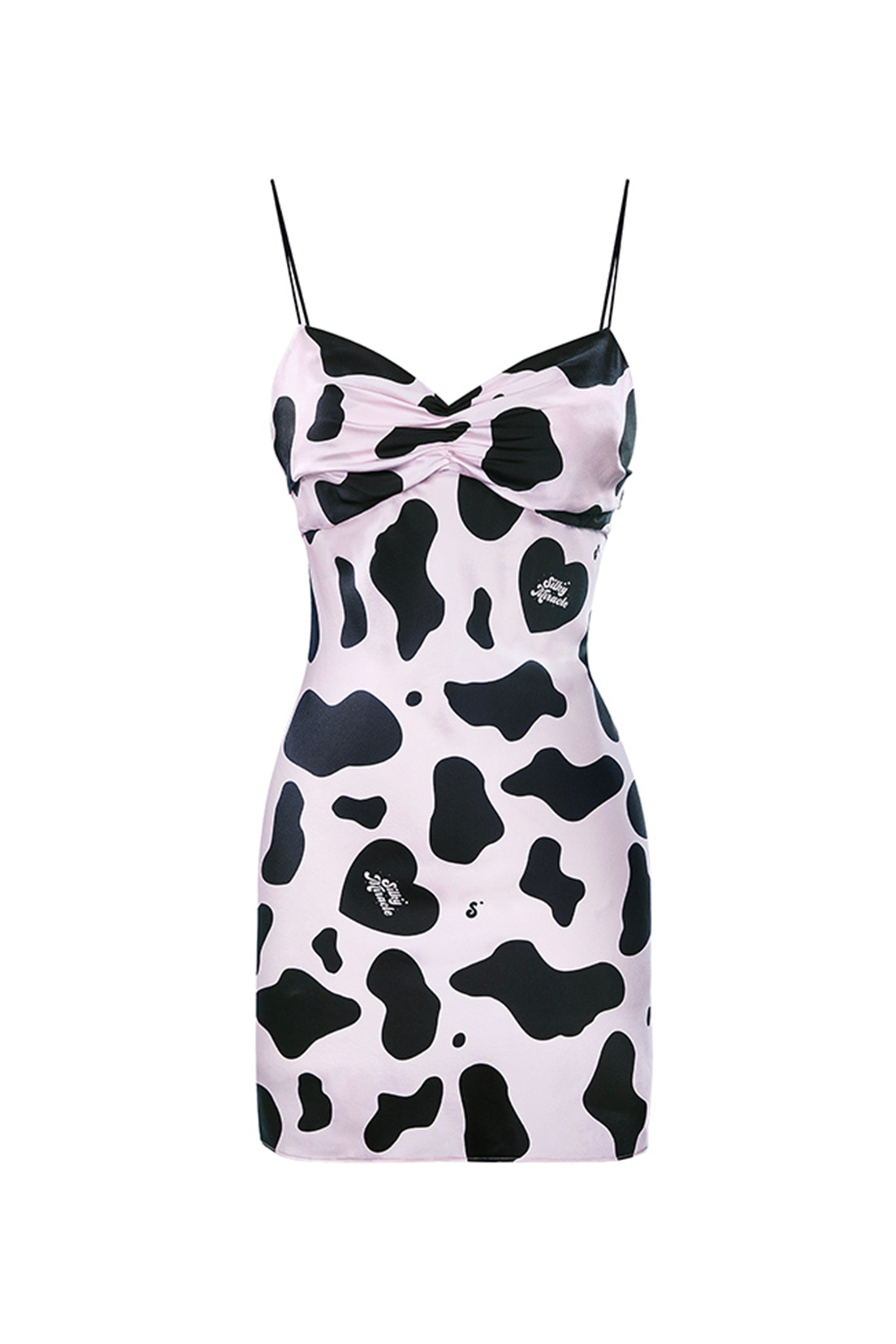 The MooMoo Print Silk Slip Dress provides a relaxed slim fit and a mini slip cut. Elevated with a supple feminine gathered bust and a striking silk cow print.