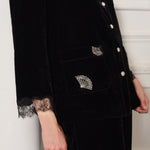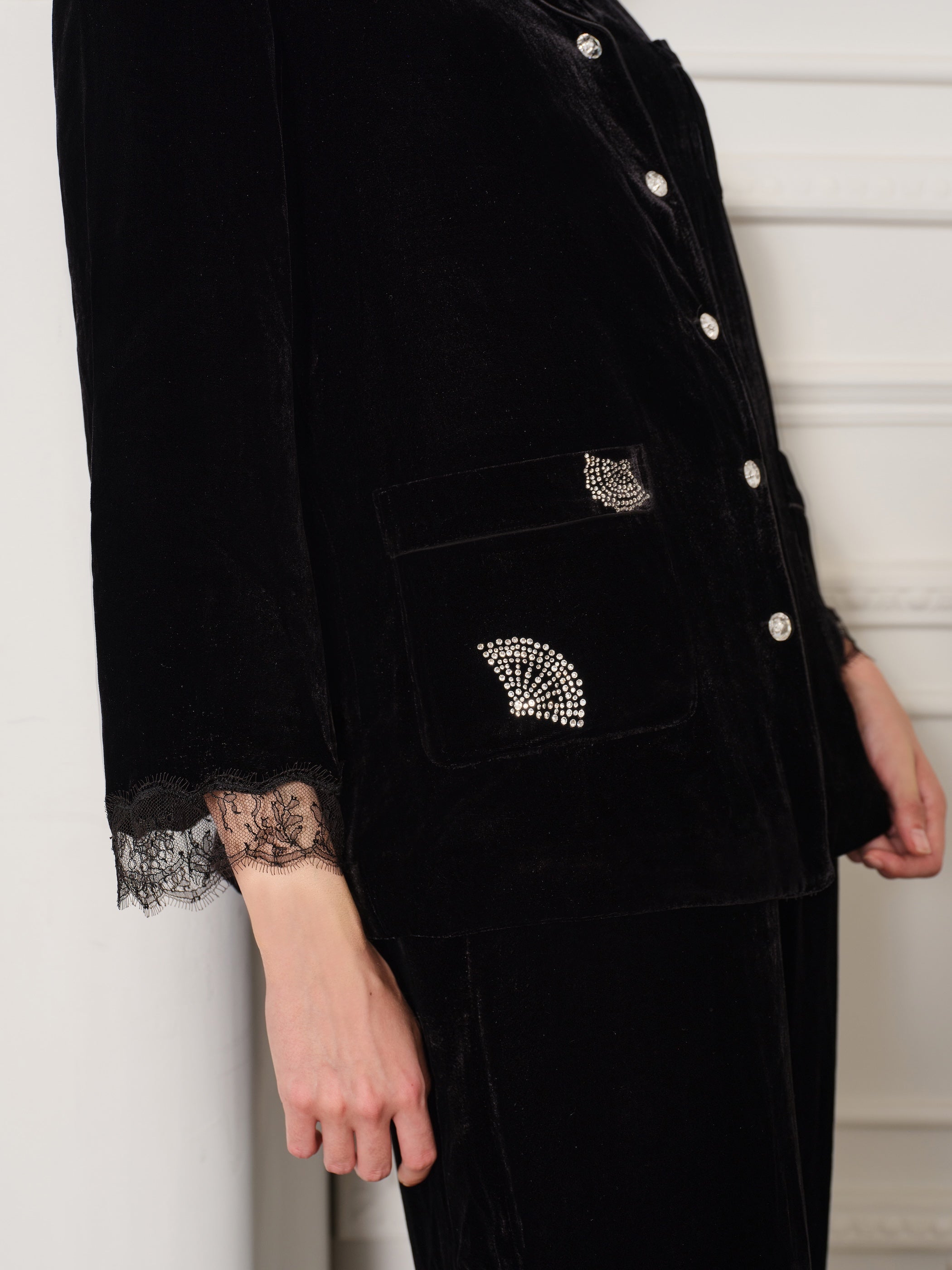 Crystal folding fans in varied forms are scattered throughout the garment, exuding a graceful and carefree charm. The cuffs of the mid-length sleeves are adorned with delicate French lace, creating a subtle yet captivating effect. Exquisite silk buds and diamond-studded buttons add further intricate detailing.