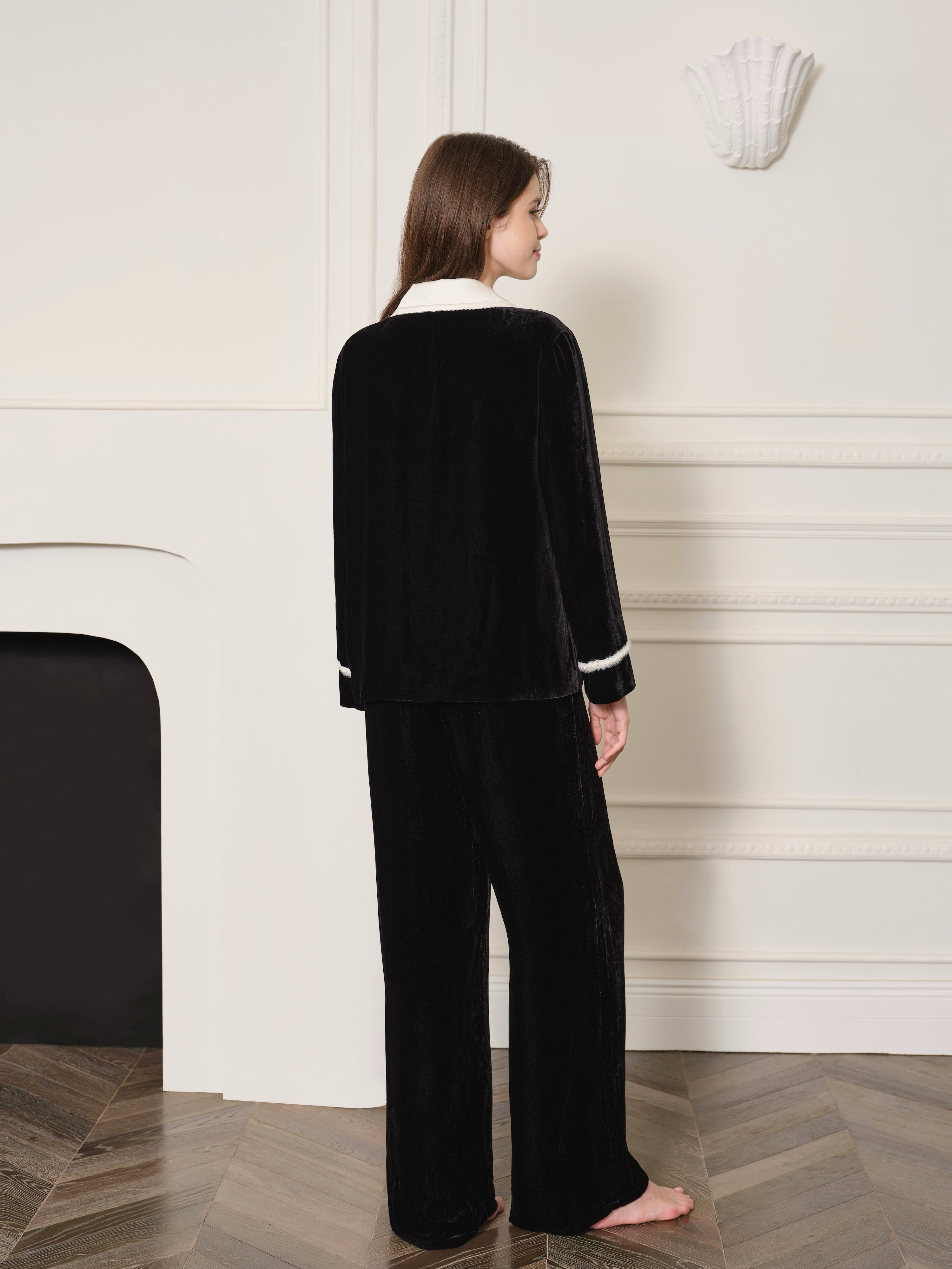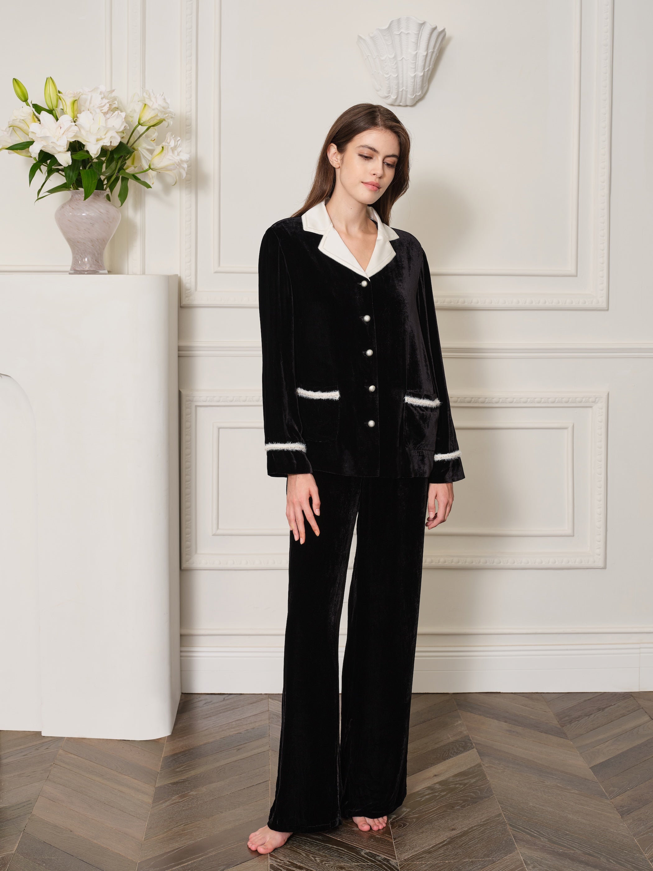 The relaxed wide-leg trousers offer a comfortable and easy-to-wear fit. The silk lining provides an exceptionally soft feel against the skin. The waistband features silk drawstrings adorned with pearl details.