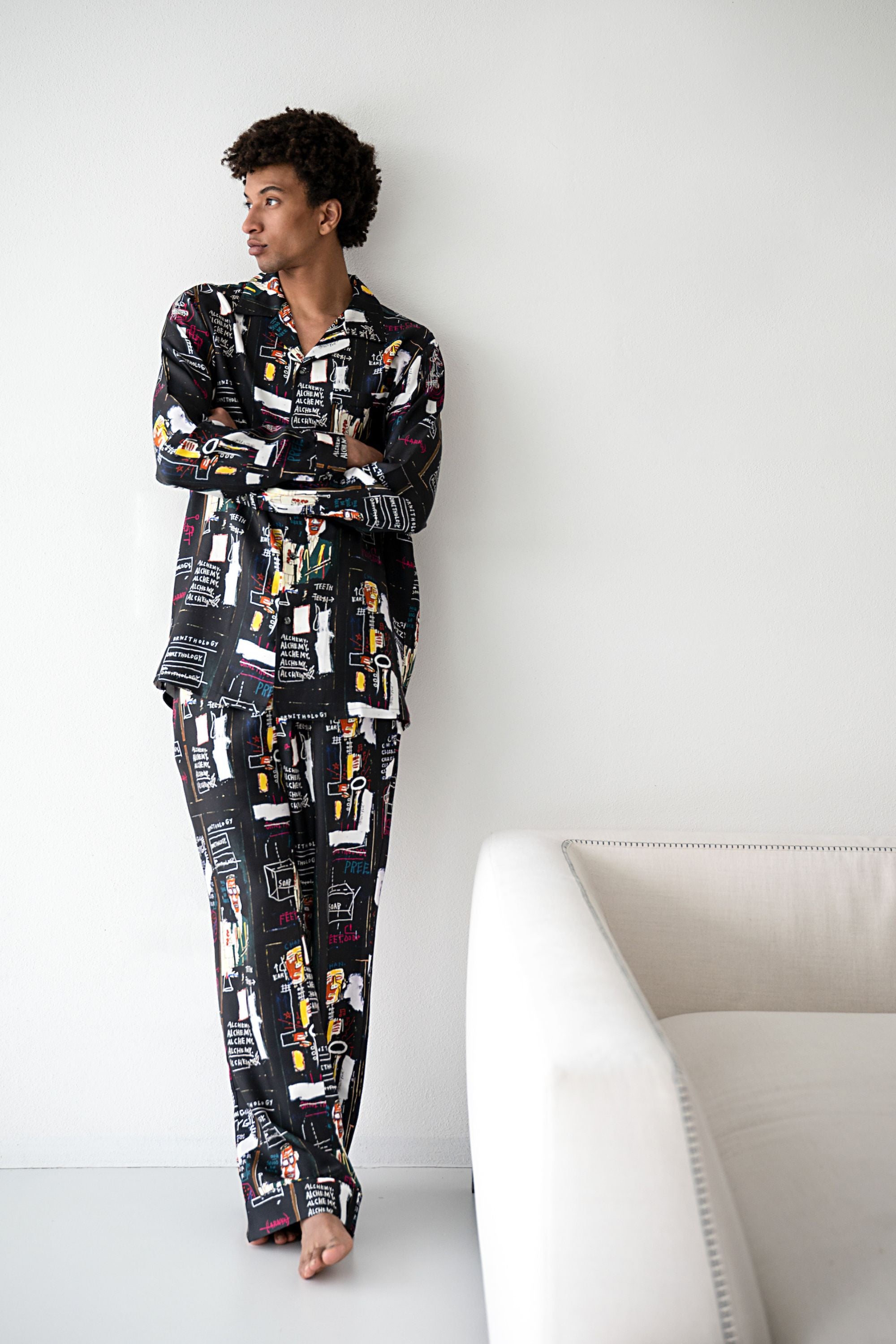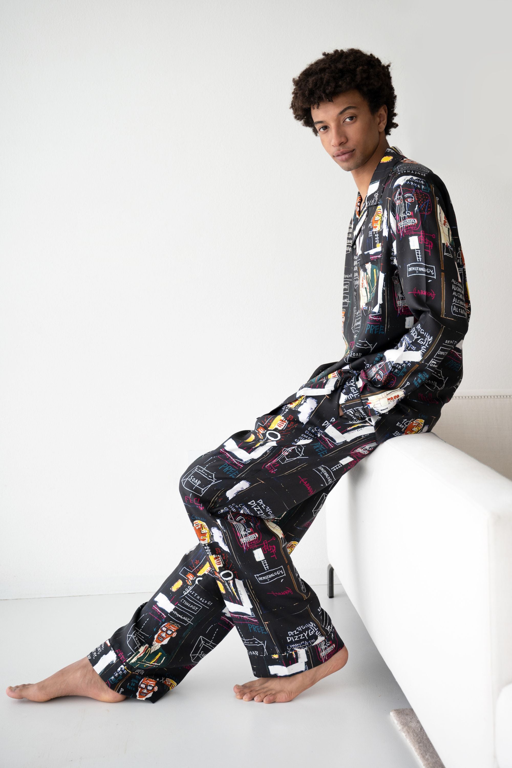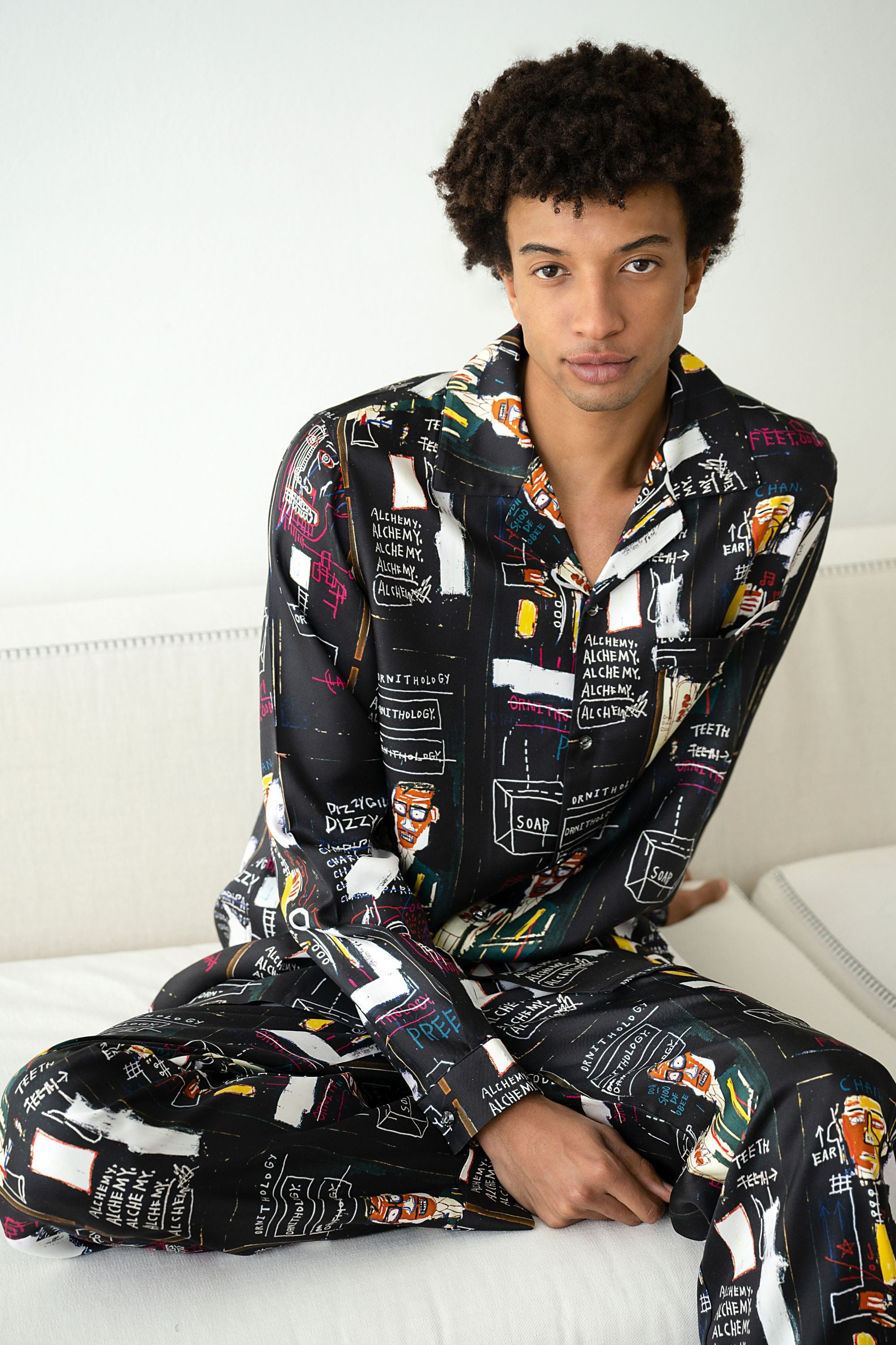 Indulge in comfort and style with this silk loungewear set, created in collaboration with American artist JEAN-MICHEL BASQUIAT. The artwork, named "Melting Point," showcases a black background adorned with graffiti-style art, capturing the essence of street culture. Featuring classic collar design and shirt-style cuffs, along with a loose fit and adjustable waist belt, this set is the perfect choice for streetwise guys.