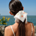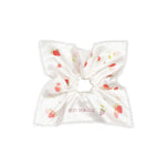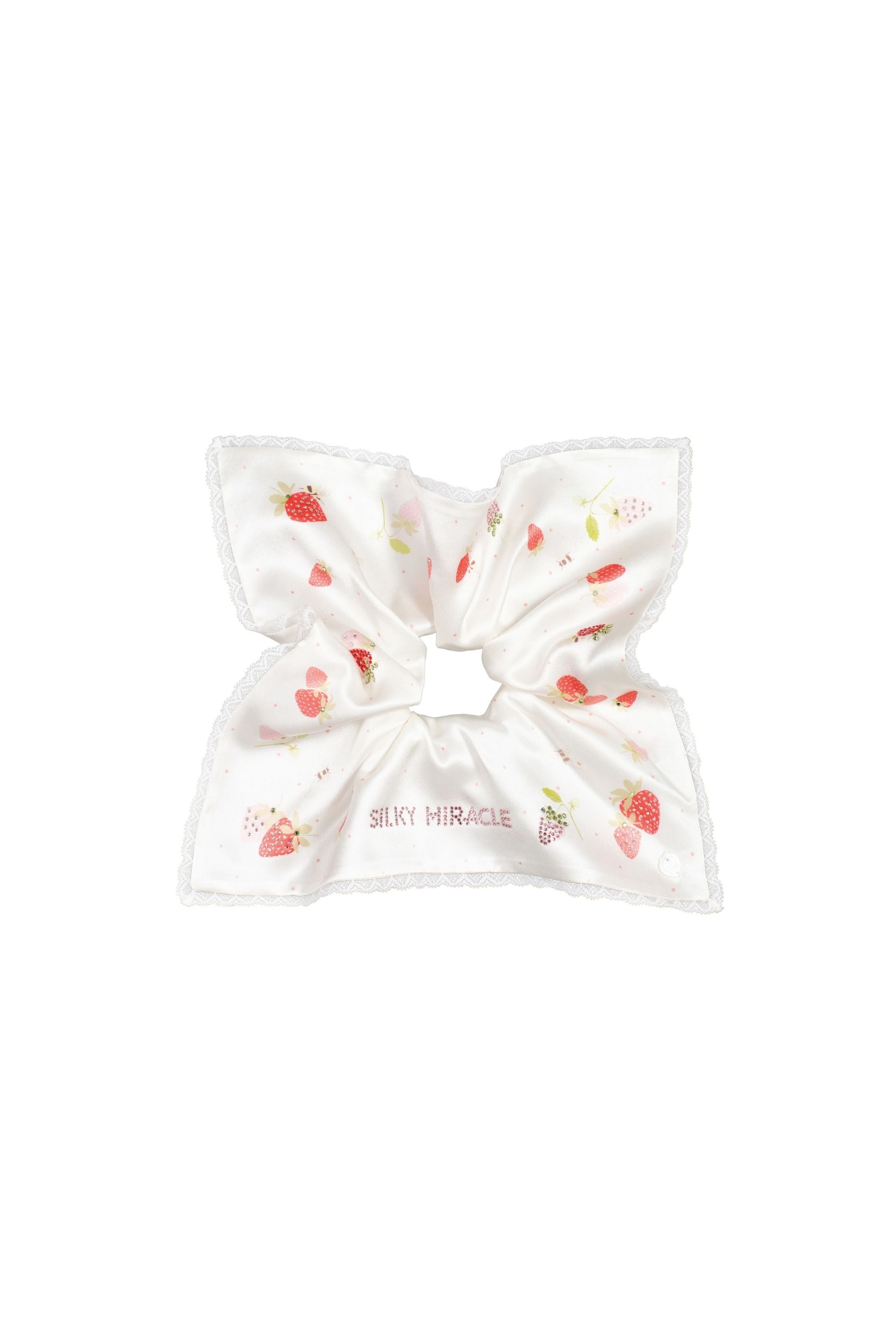Inspired by a romantic spring/summer strawberry-garden theme, this square scarf hair accessory features scattered strawberry motifs in varying sizes, accented with multicoloured Swarovski crystals. Finished with a hot-stamped brand logo, a custom strawberry-shaped mother-of-pearl charm, and delicate wave lace edging.