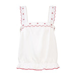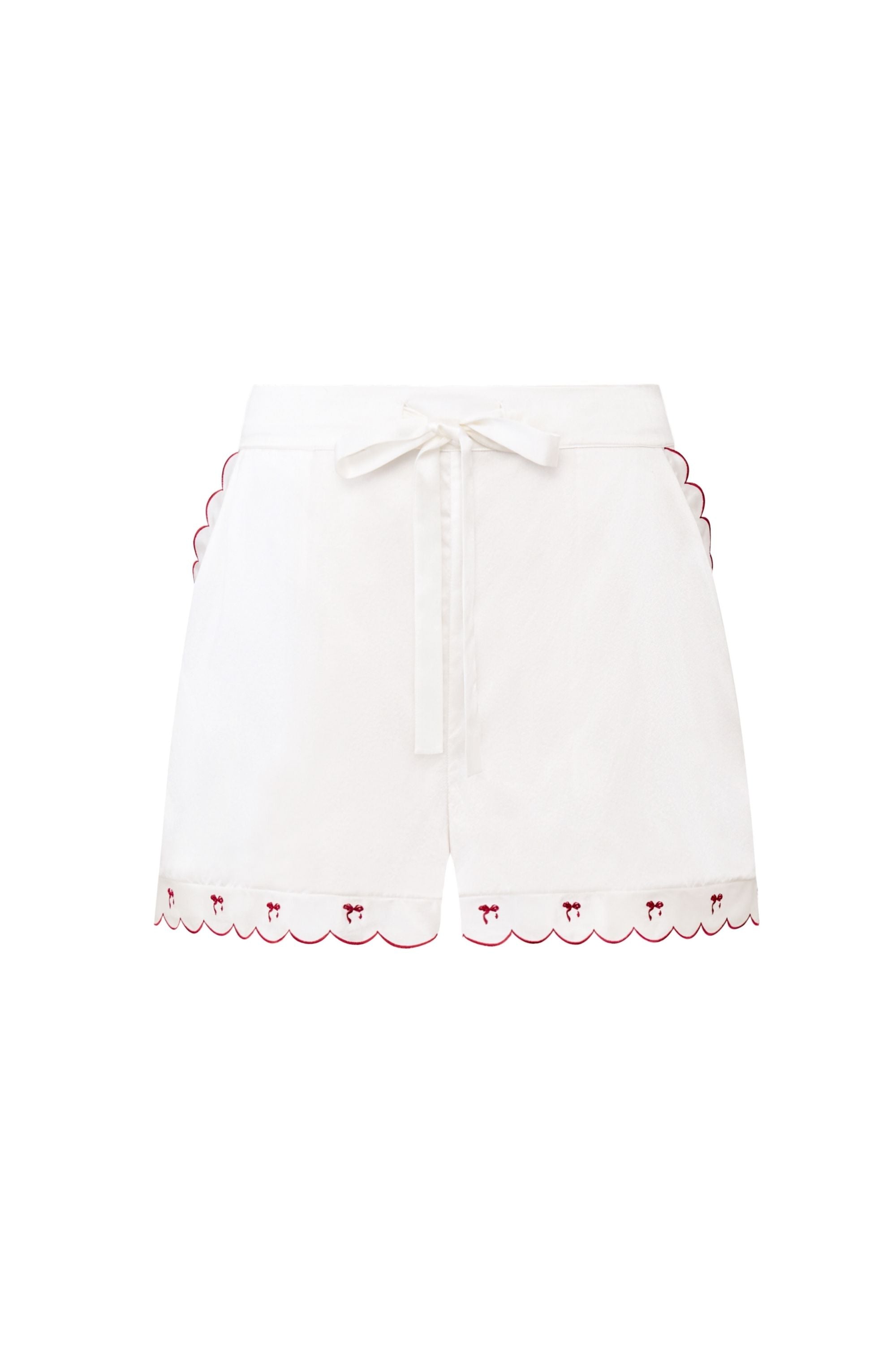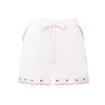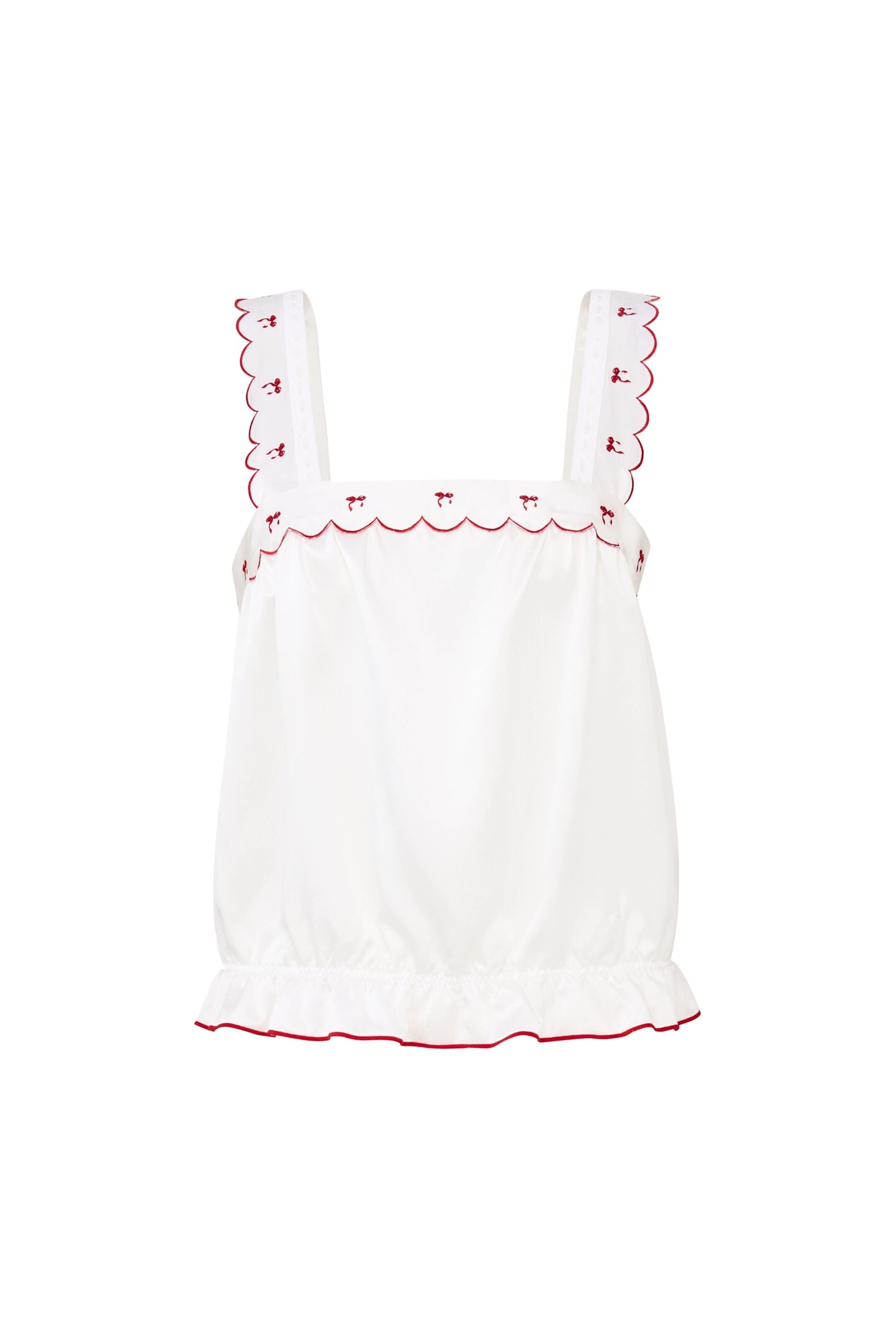 A French-inspired wide-strap camisole and shorts set, finished with contrast embroidered bow wave-edge trims at the straps, front neckline, and hems. Lace threading along the straps adds delicate detail, while a refined strawberry-shaped mother-of-pearl logo charm completes the design.