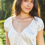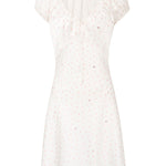 Featuring a soft pink mini strawberry print with a ruched neckline and puff sleeves, this dress captures a fresh, youthful charm. Crystal strawberry embellishments appear throughout, with beaded crystal strawberry details at the ends of the front tie. Finished with an elasticated back for comfort and a delicate strawberry-shaped mother-of-pearl logo charm.