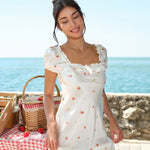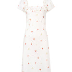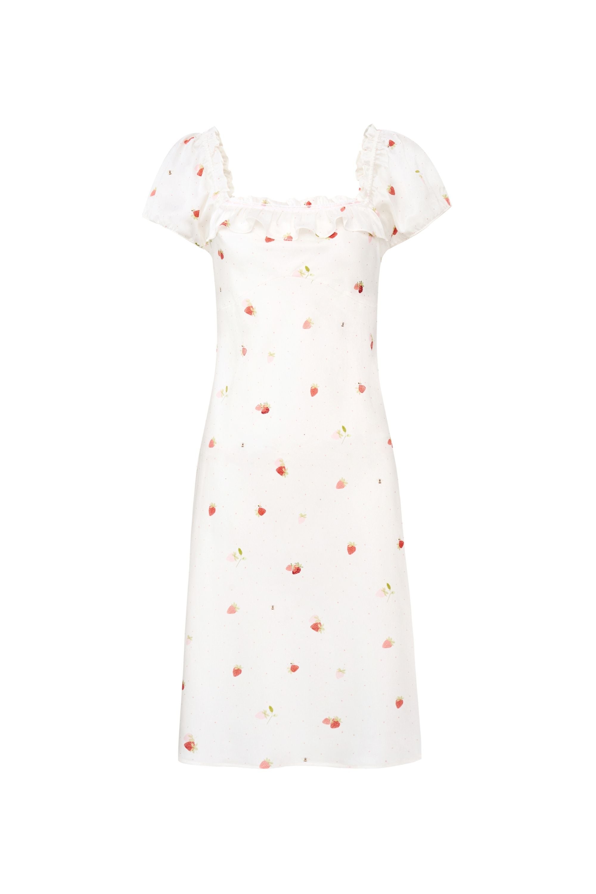 A French pastoral–inspired dress with puff sleeves and ruched ruffle trims at the neckline and shoulders. The front features lace threading with a soft pink ribbon tie, while strawberry crystal motifs and subtle pink crystal accents add a delicate sparkle. Finished with a refined strawberry-shaped mother-of-pearl logo charm.