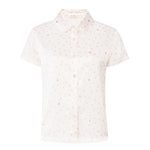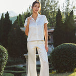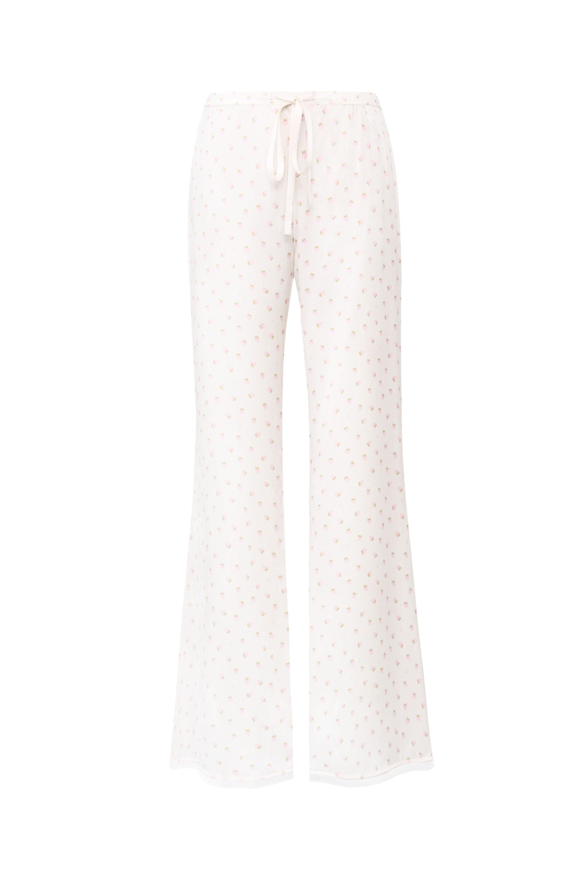 Featuring a soft pink mini strawberry print and a delicate doll collar, this set captures a fresh, youthful charm. Finished with fine lace trims at the collar, cuffs, hem, and leg openings, with sheer lace detailing to the top hem and trouser cuffs. Crystal strawberry embellishments and transparent mother-of-pearl crystal buttons add a subtle sparkle, while a delicate strawberry-shaped mother-of-pearl logo detail completes the design.