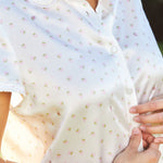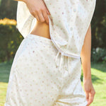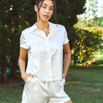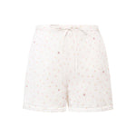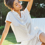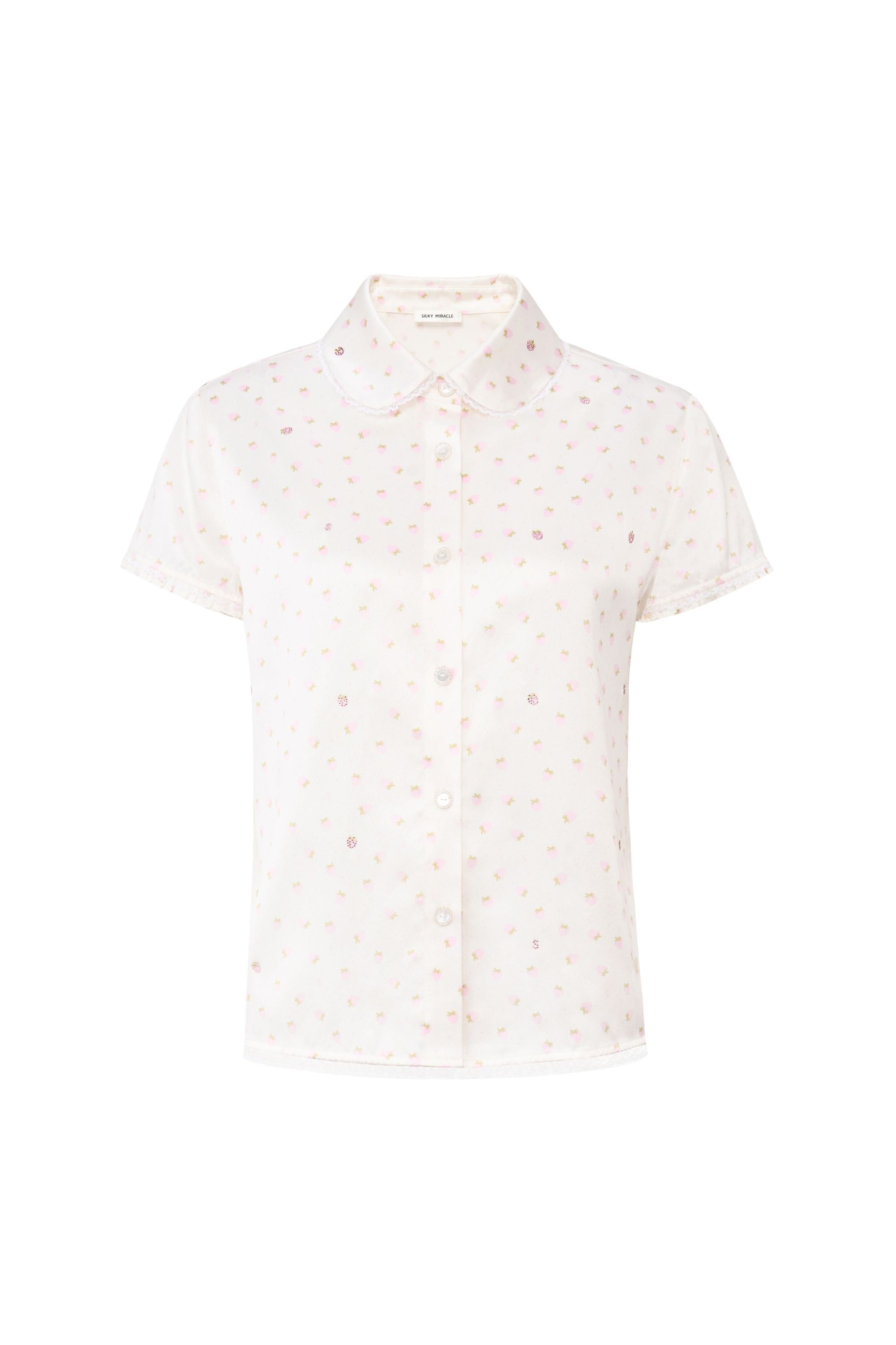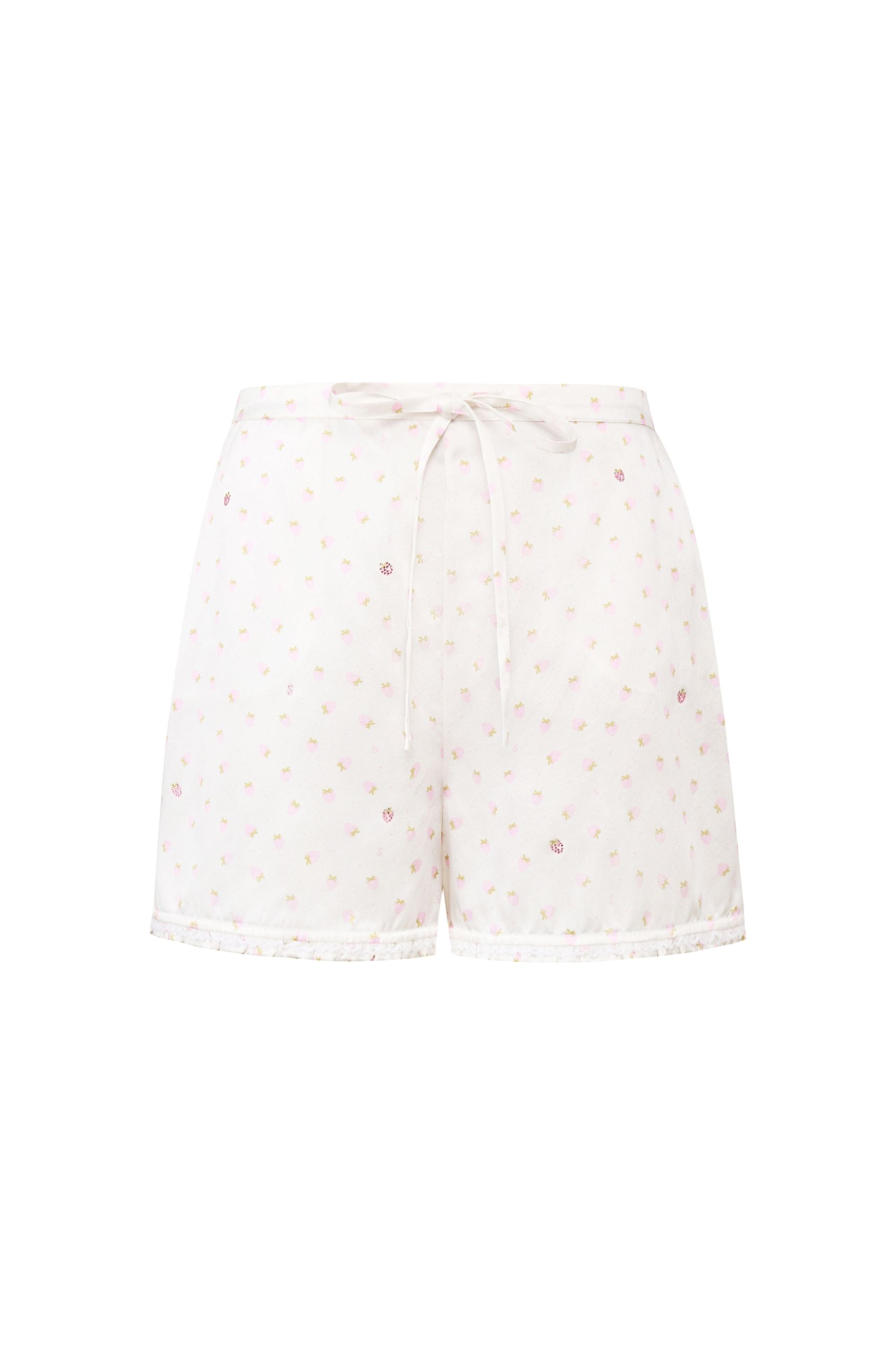Featuring a soft pink mini strawberry print and a delicate doll collar, this short-sleeve top and shorts set evokes a fresh, youthful charm. Finished with fine lace trims at the collar, cuffs, hem, and leg openings, with softly gathered ruffle detailing at the cuffs and hems. Crystal strawberry embellishments and transparent mother-of-pearl crystal buttons add subtle sparkle, completed with a delicate strawberry-shaped mother-of-pearl logo detail.