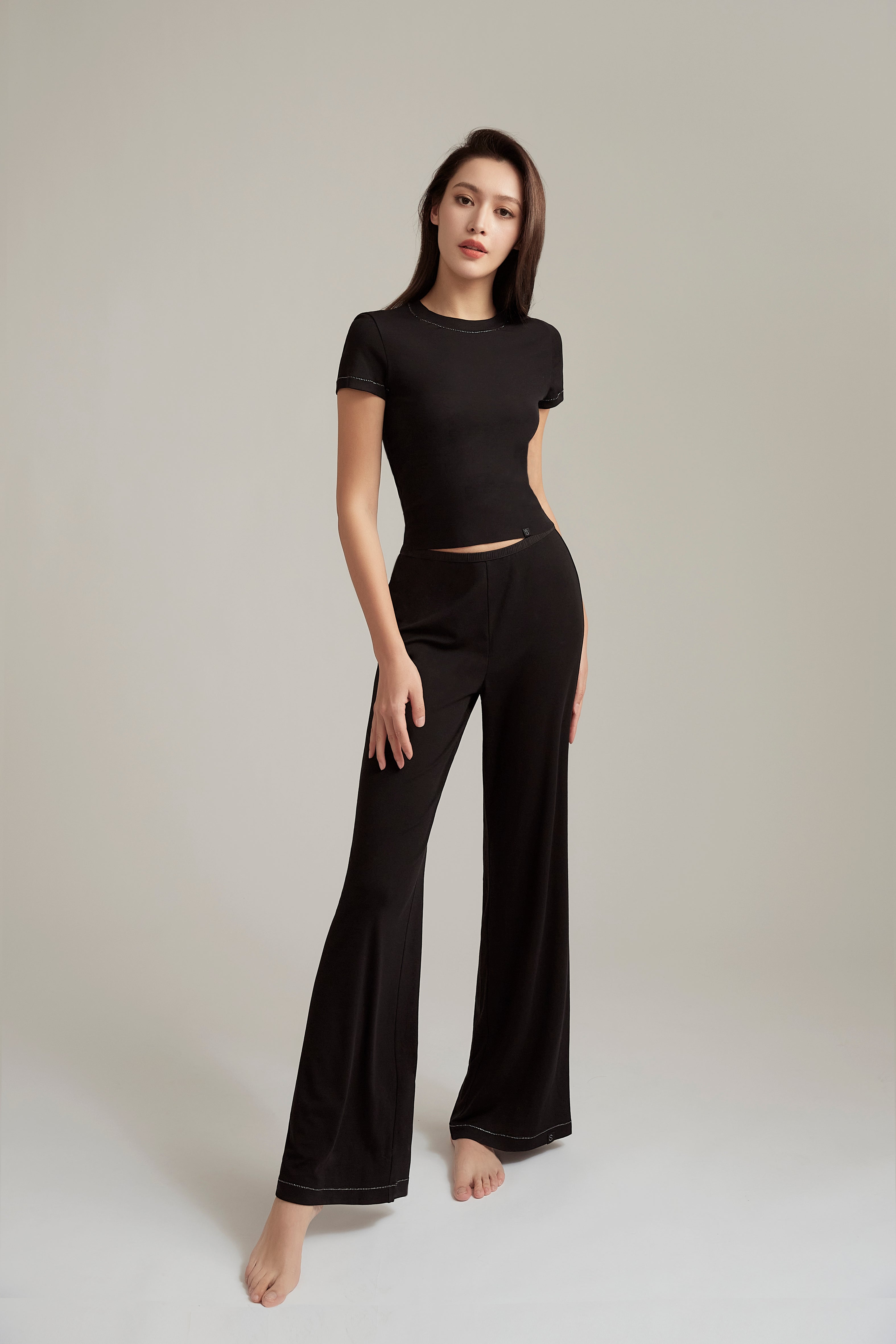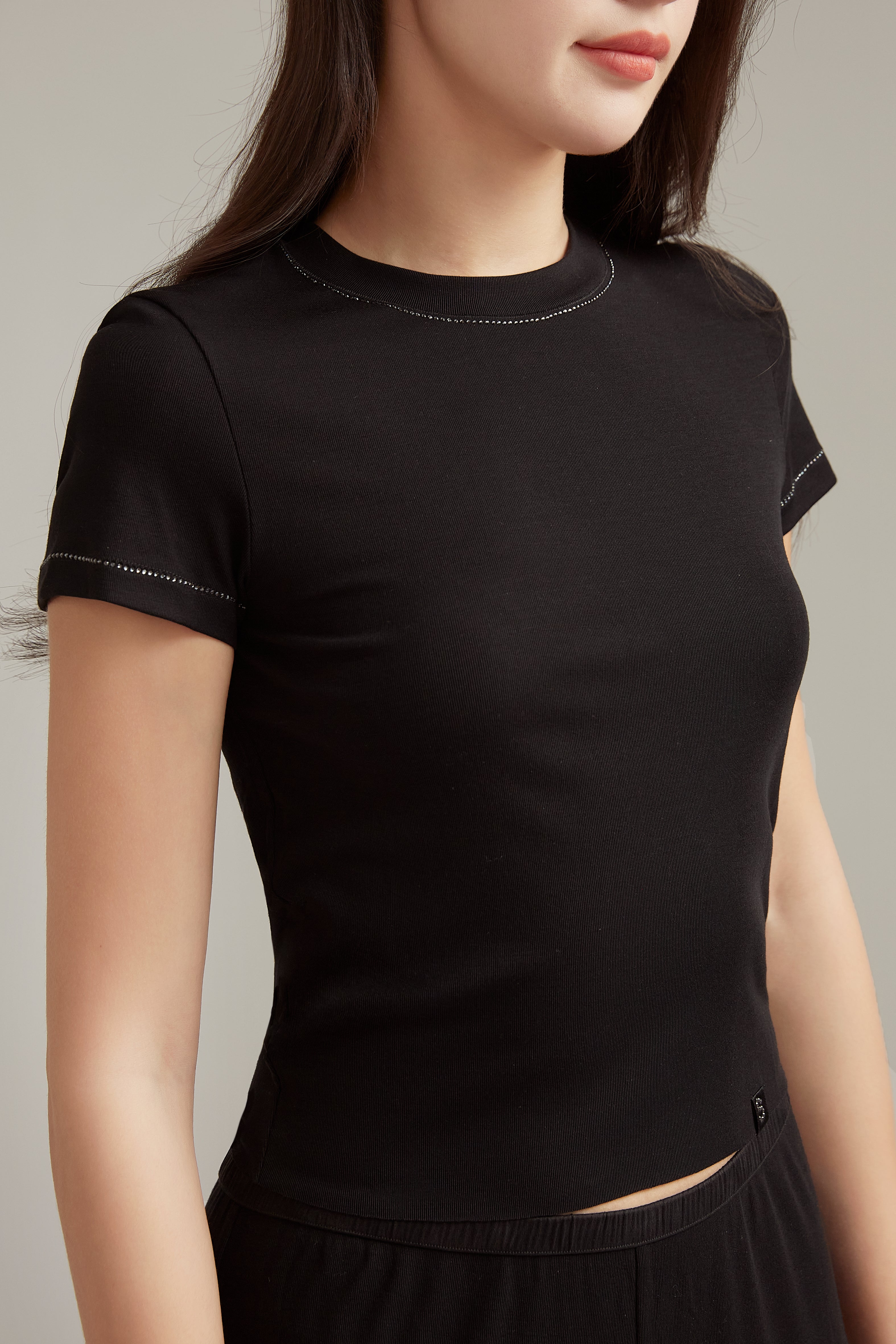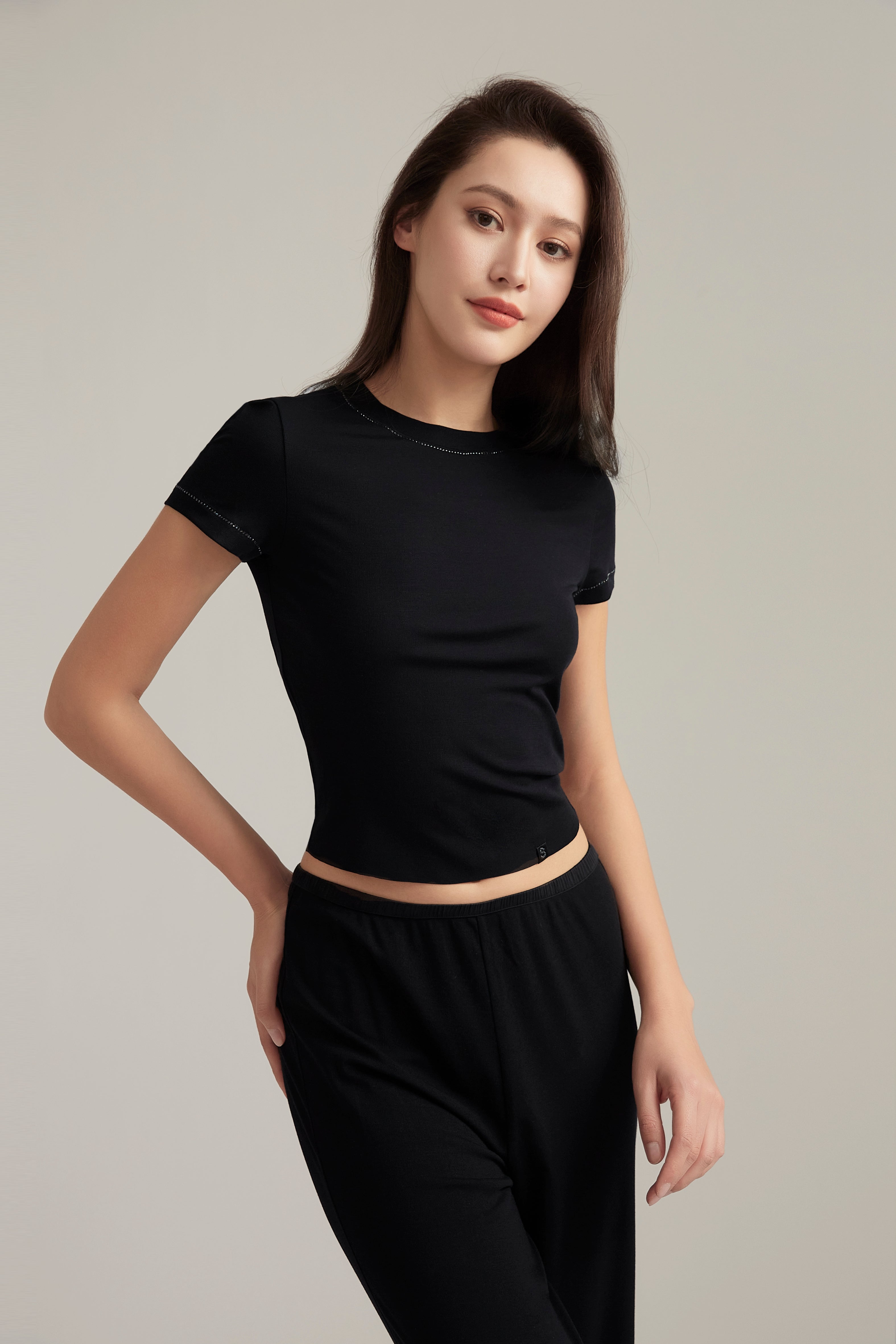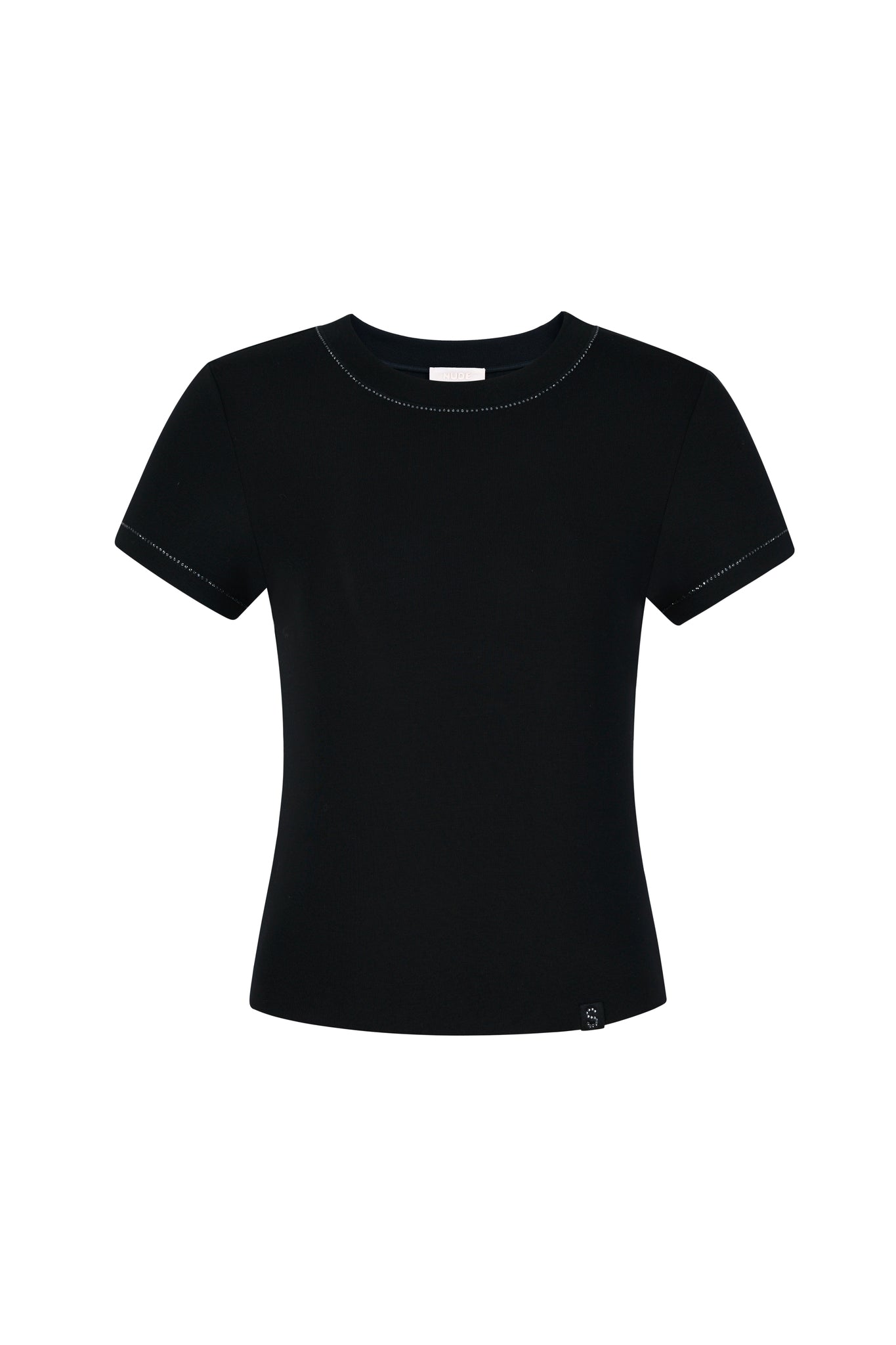 The Black Round-Neck Top from our silk blend collection is crafted from a blend of mulberry silk, modal and spandex. Finished with Swarovski Crystals.