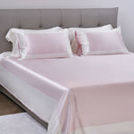 Elevate your nights sleep with the 100% silk blossom pink bedding set. A classic and simple design featuring two pillow cases, a duvet cover and an under sheet.