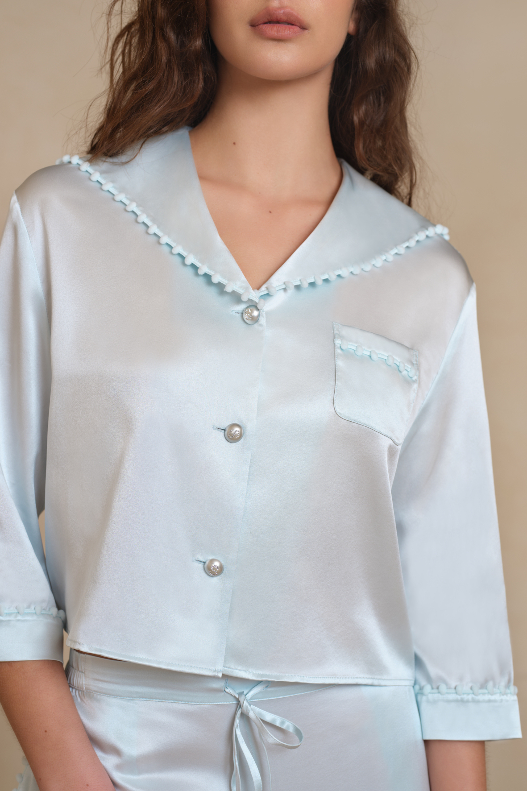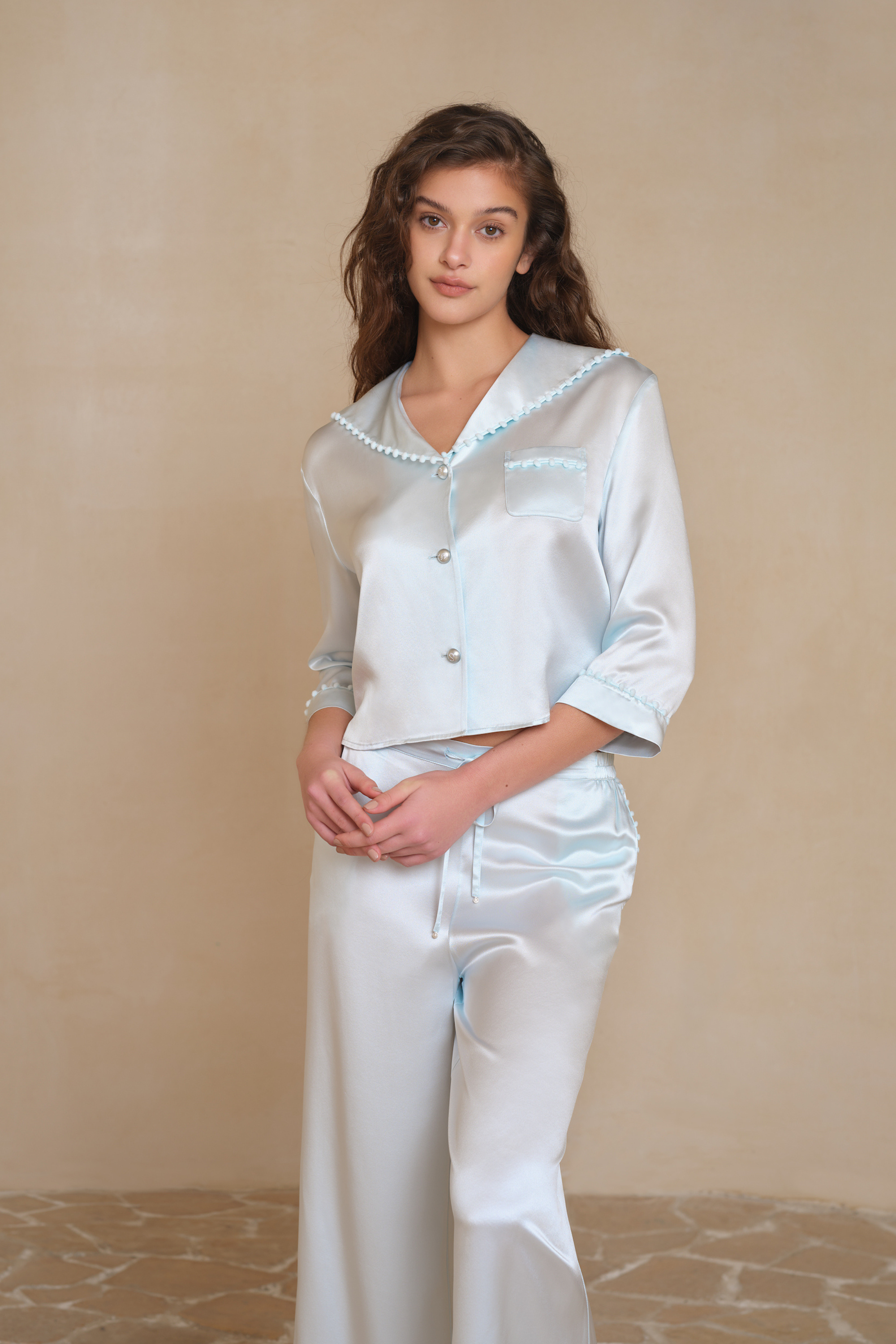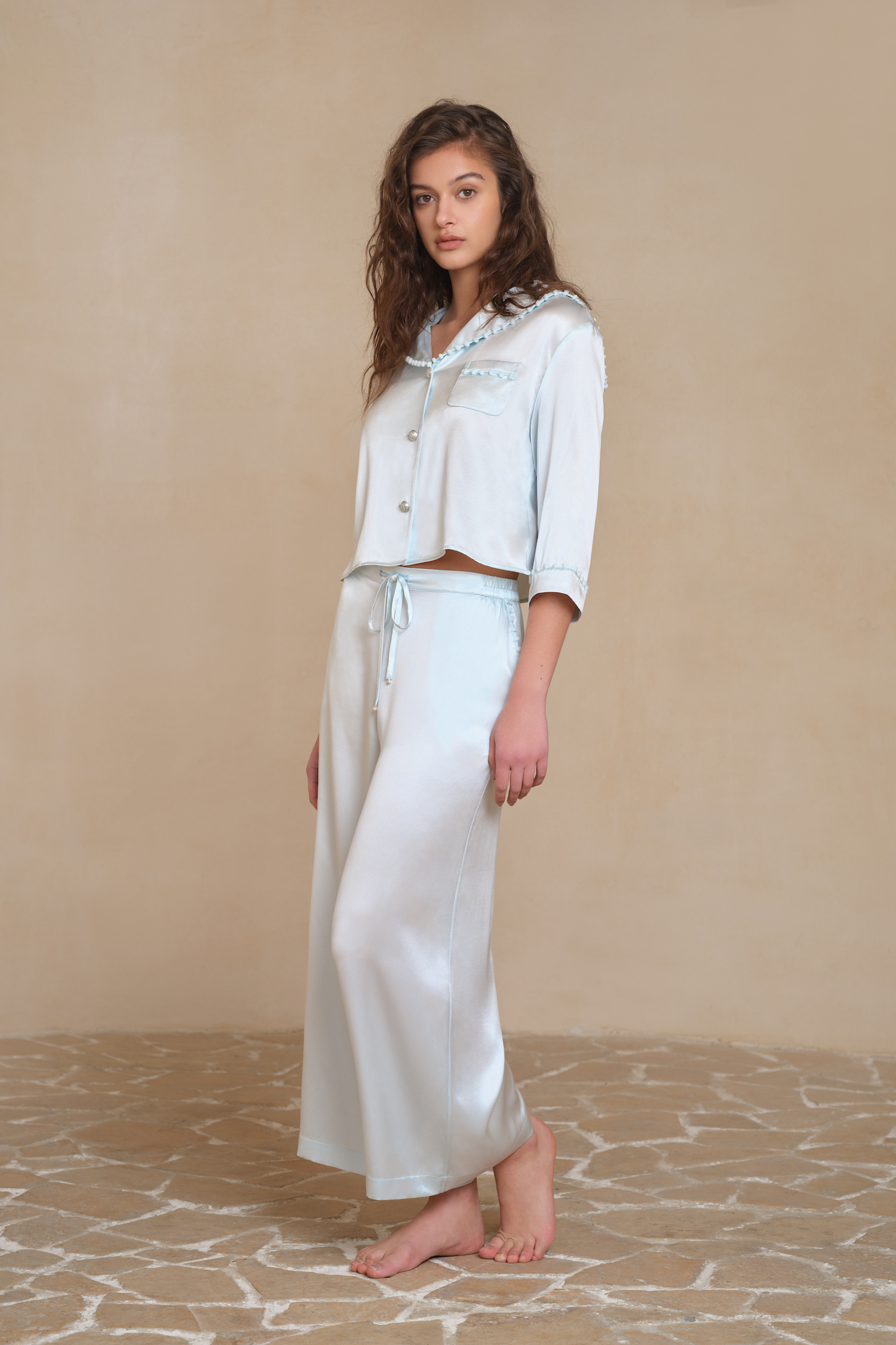 The Purity Series draws inspiration from the luxurious and soft European dressing styles of the early 20th-century Edwardian era. The playful navy collar, mid-sleeve design paired with wide-leg pants brings a fresh and relaxed feel. The pom-pom lace trim at the collar and pockets adds a sweet and romantic touch.